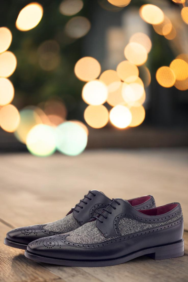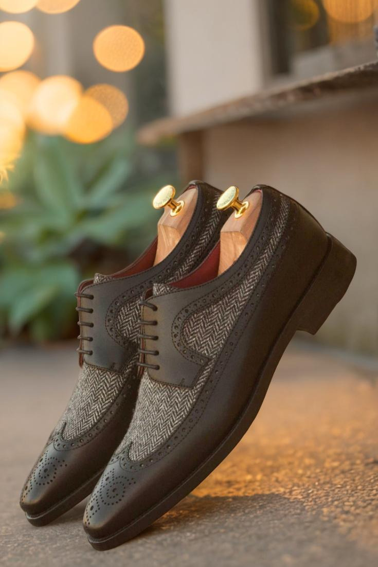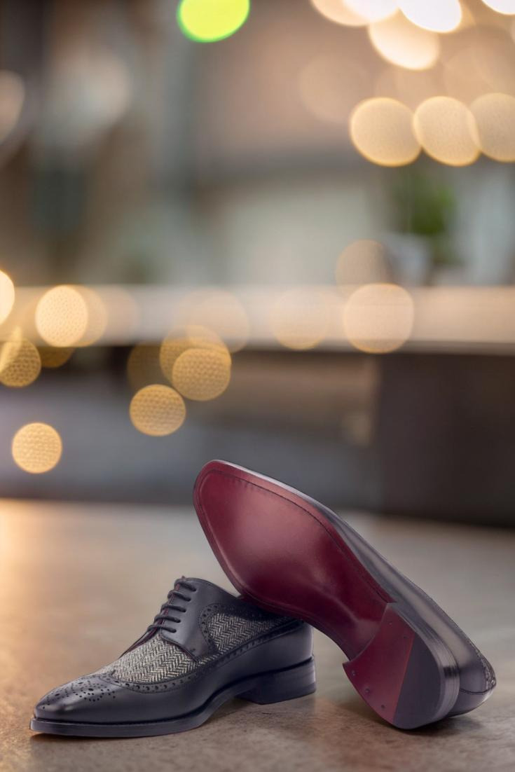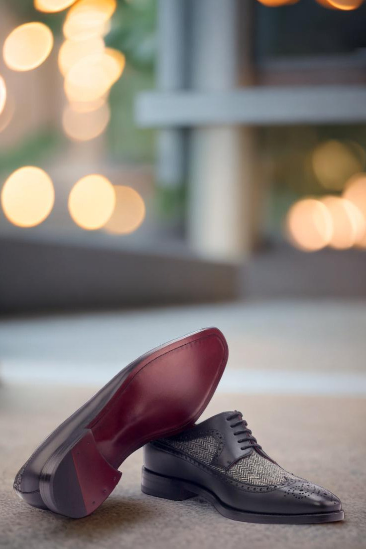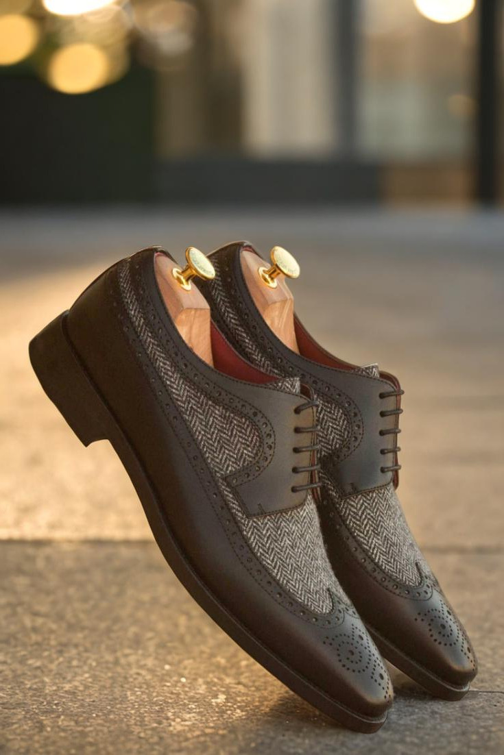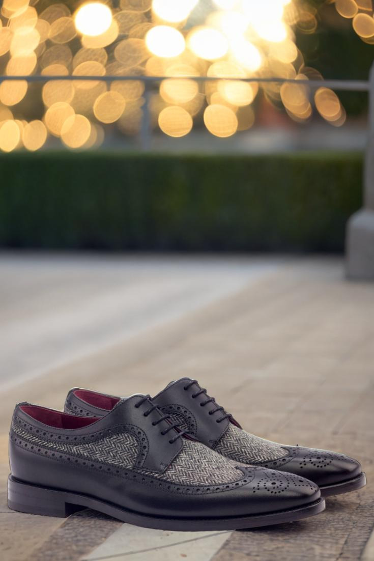 Crafted from the finest black painted calf, this exquisite creation boasts a distinctive longwing tip that exudes an air of enigmatic elegance. Its vamp, adorned with a mesmerizing herringbone wool pattern, adds a touch of subtle intrigue that captivates the eye.