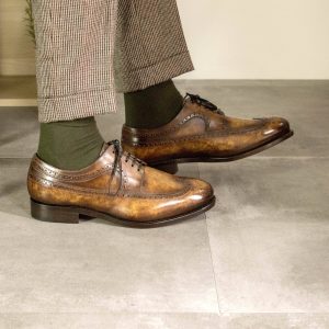 Let’s start with the uppers – the rich Cognac-colored leather has a unique marbled hand patina finish that will make heads turn. This is no ordinary shoe you’ll find on every street corner; it’s a statement piece that exudes sophistication.