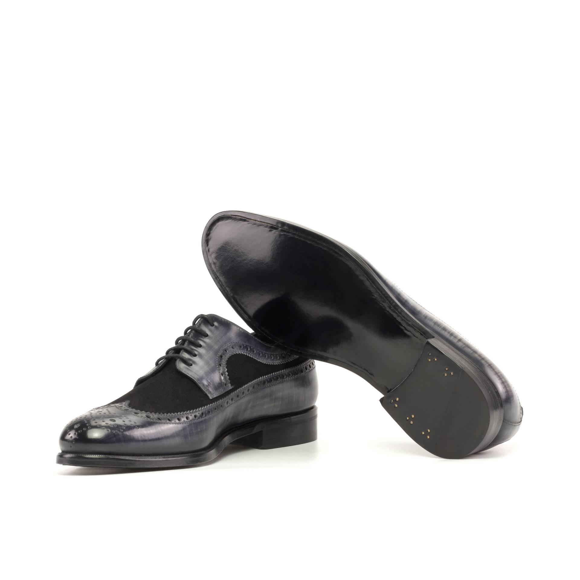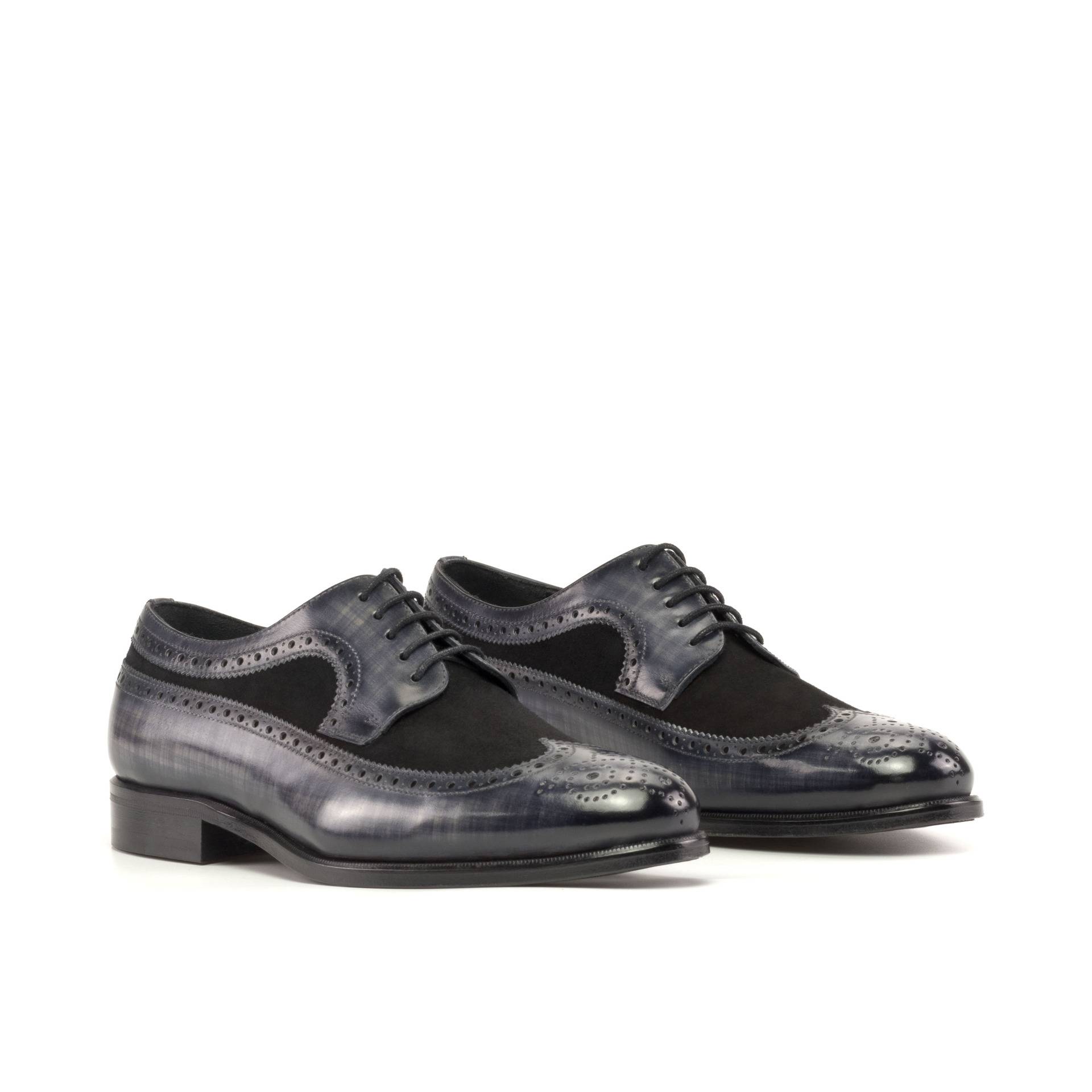 Featuring a unique Longwing Tip in a sophisticated grey Papiro Hand Patina Leather, these shoes are sure to make a statement. The contrast of the black Kid Suede vamp adds a touch of softness and texture to the design. The Quarter and Back in the same grey Papiro Hand Patina Leather tie the look together seamlessly.