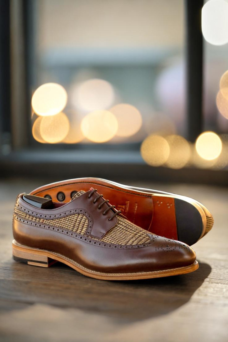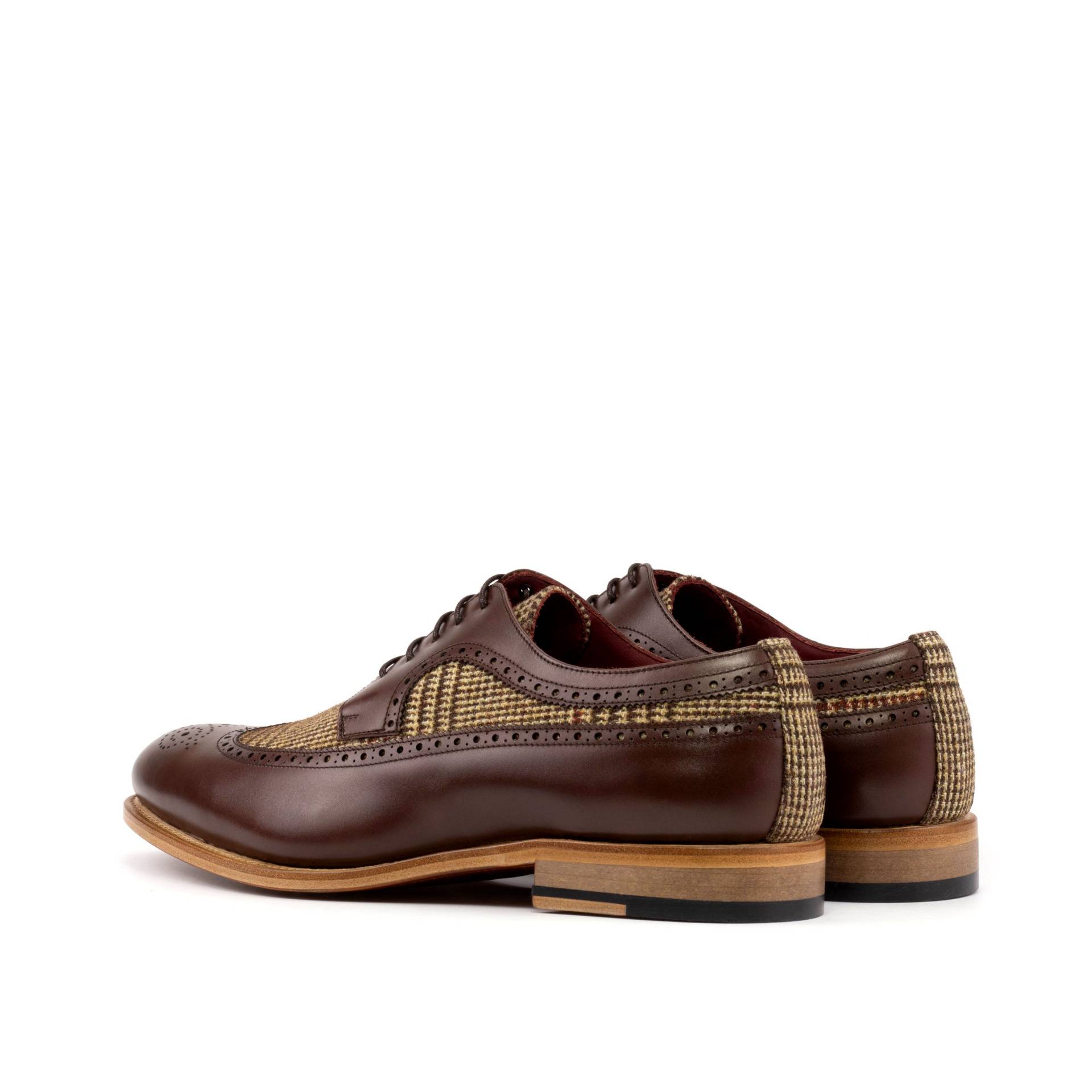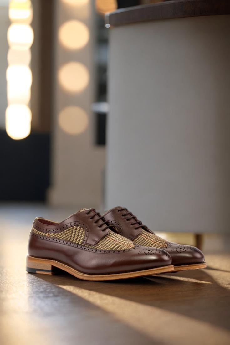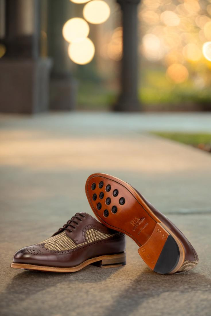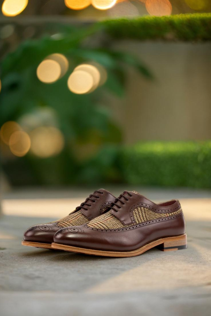 The longwing tip, made from dark brown box calf, adds a touch of elegance to the overall design. Paired with a wool tweed vamp and back, this shoe exudes a sense of refined luxury. The rich texture and deep hues of the materials create a visually striking contrast that effortlessly stands out.
