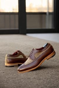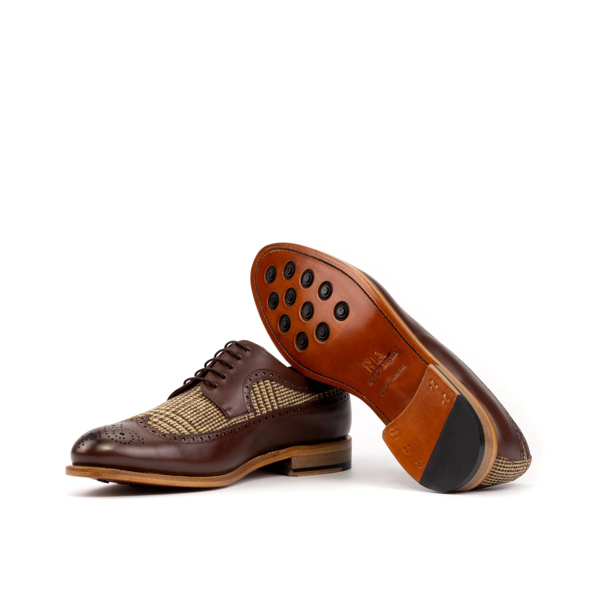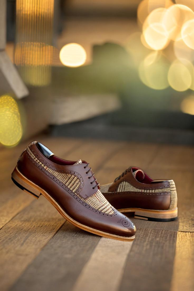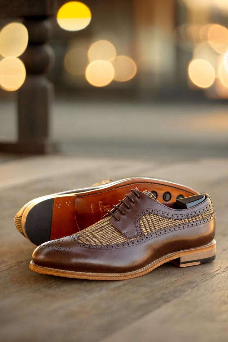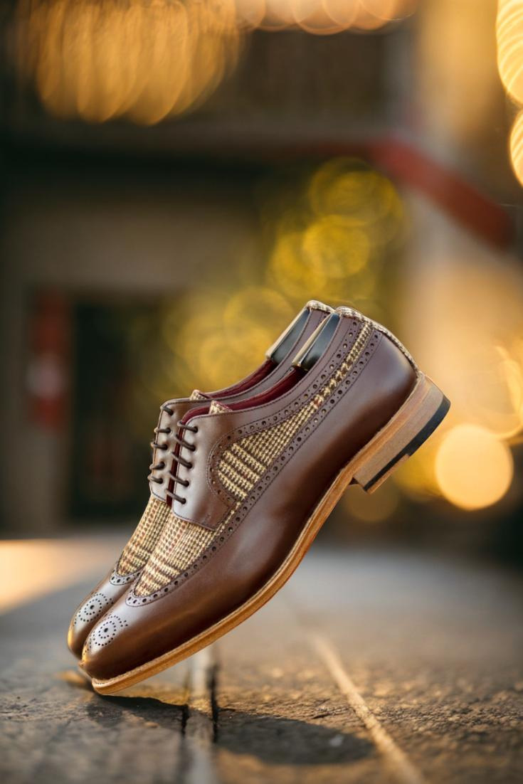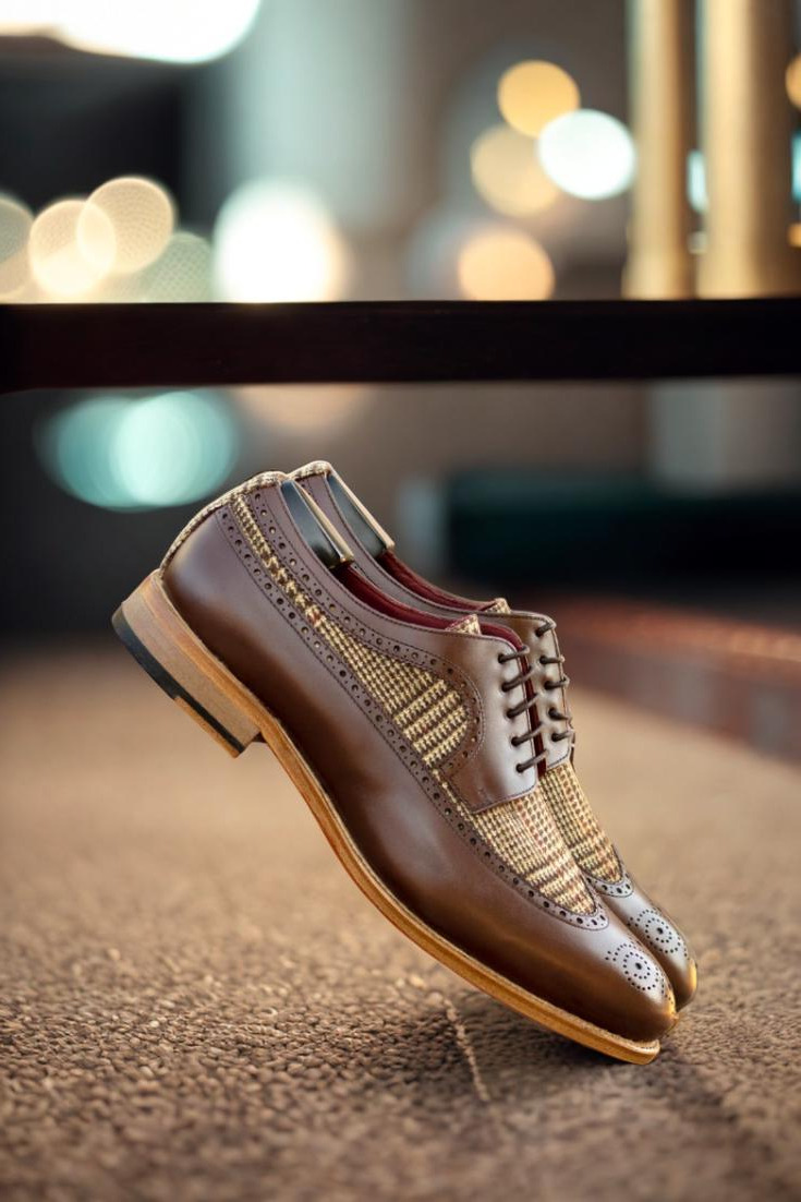 The longwing tip, made from dark brown box calf, adds a touch of elegance to the overall design. Paired with a wool tweed vamp and back, this shoe exudes a sense of refined luxury. The rich texture and deep hues of the materials create a visually striking contrast that effortlessly stands out.