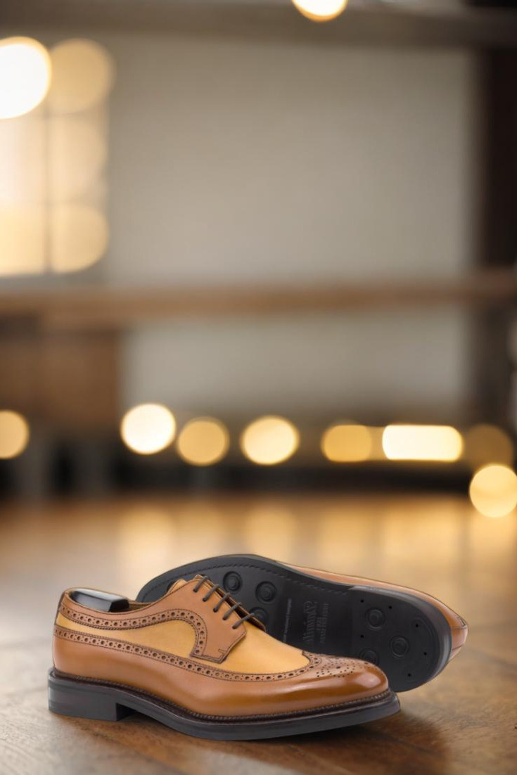 The foundation of the No. 8303 is its superior materials. The shoe is crafted from a sophisticated combination of Cognac and English Tan Luxe Calf leather. This premium leather is renowned for its supple texture, rich color variation, and remarkable ability to develop a unique patina over time. The quarter and back, fashioned from Cognac Luxe Calf, provide a deep, warm foundation, while the vamp, in a contrasting English Tan, introduces a touch of visual intrigue and highlights the shoe’s elegant silhouette. The signature longwing tip, also in Cognac Luxe Calf, extends gracefully from the toe to the heel, creating a continuous, sweeping line that is the hallmark of this timeless style. To further enhance its distinguished appearance, the shoe features an extra layer of polishing on the toe cap, giving it a subtle, refined gleam that catches the eye.