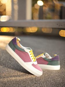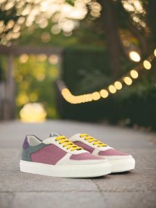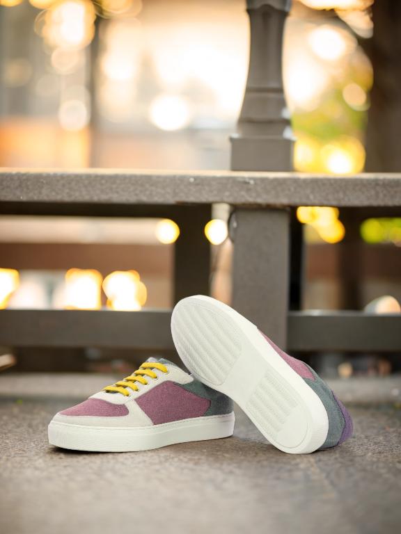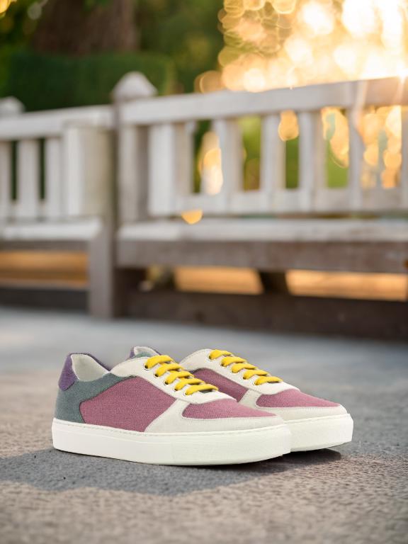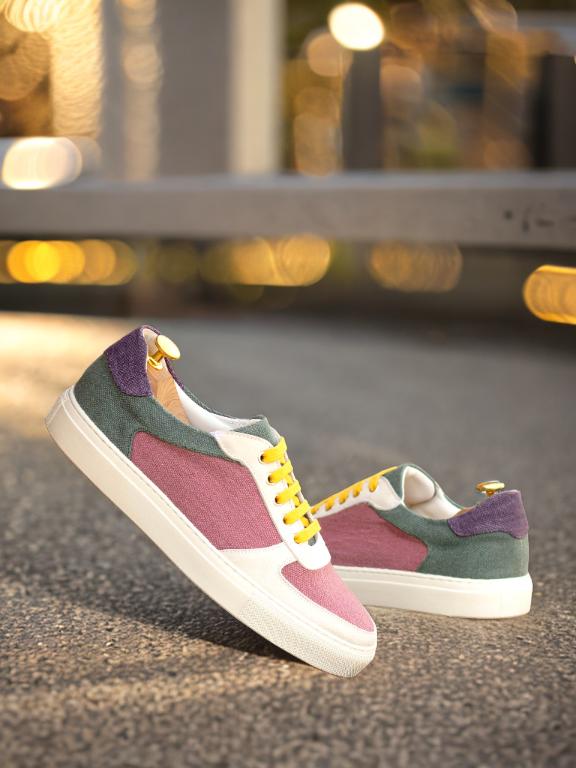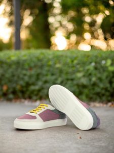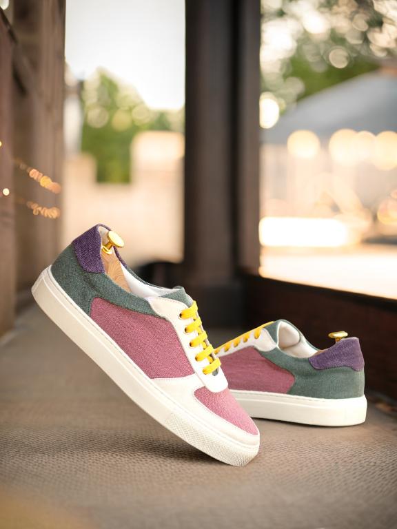 Crafted with precision and care, the Ashland Ave. Low Top Sneaker is the perfect combination of sophisticated and sleek. With a base of rich plum linen, this shoe exudes luxury and elegance. The white kid suede toe box and eyestay add a touch of class and sophistication, while the vibrant purple linen heel tab and khaki linen back add a playful pop of color.