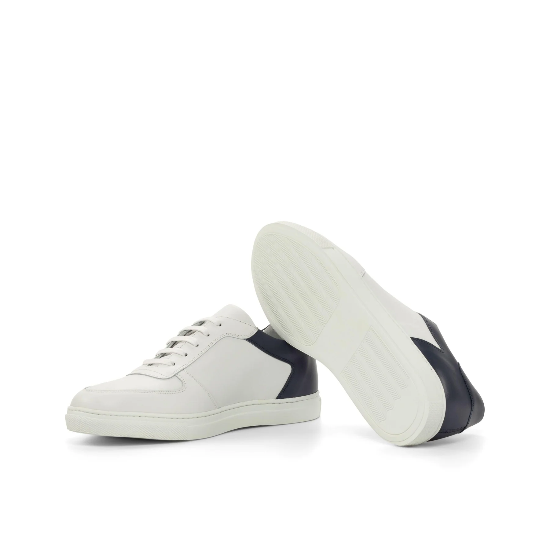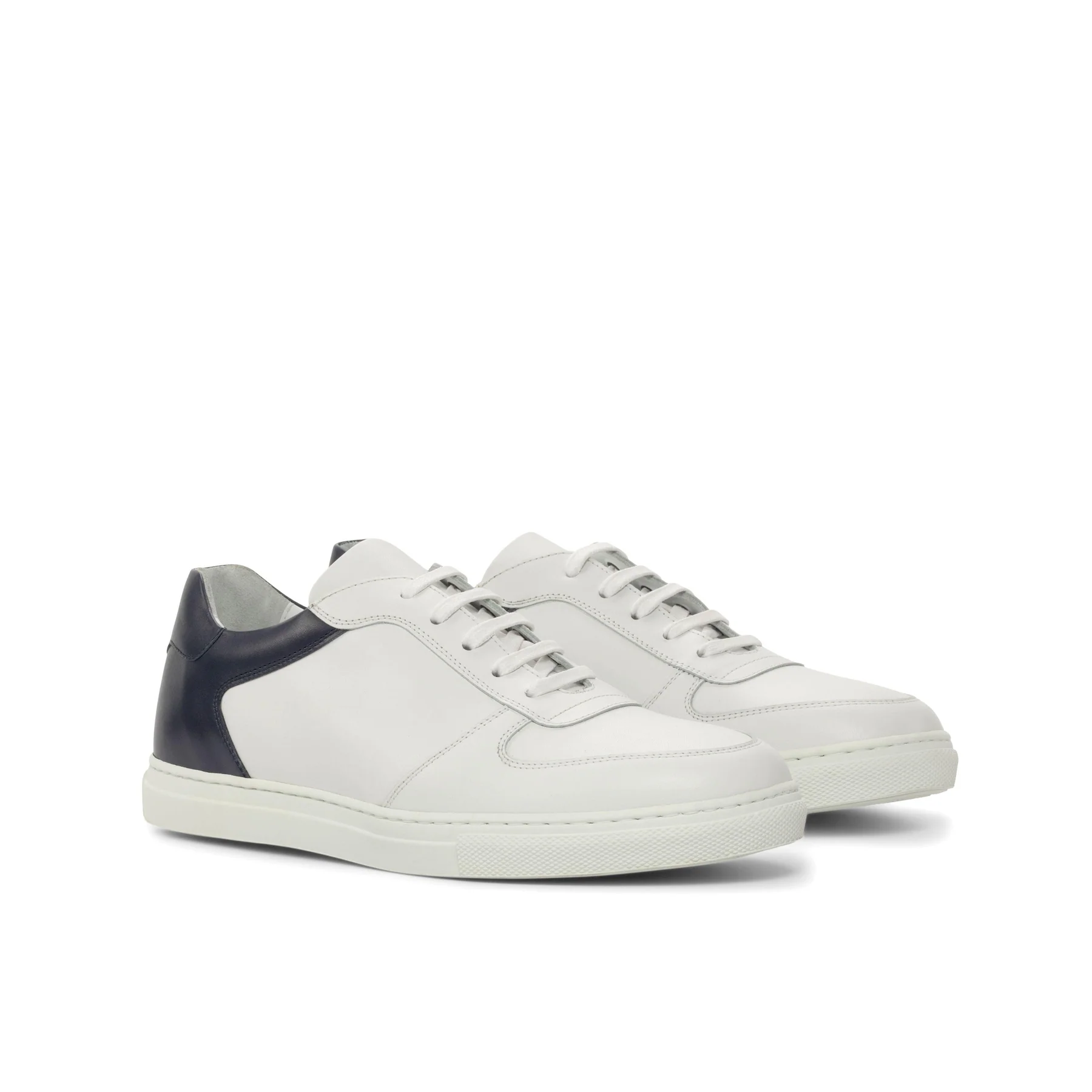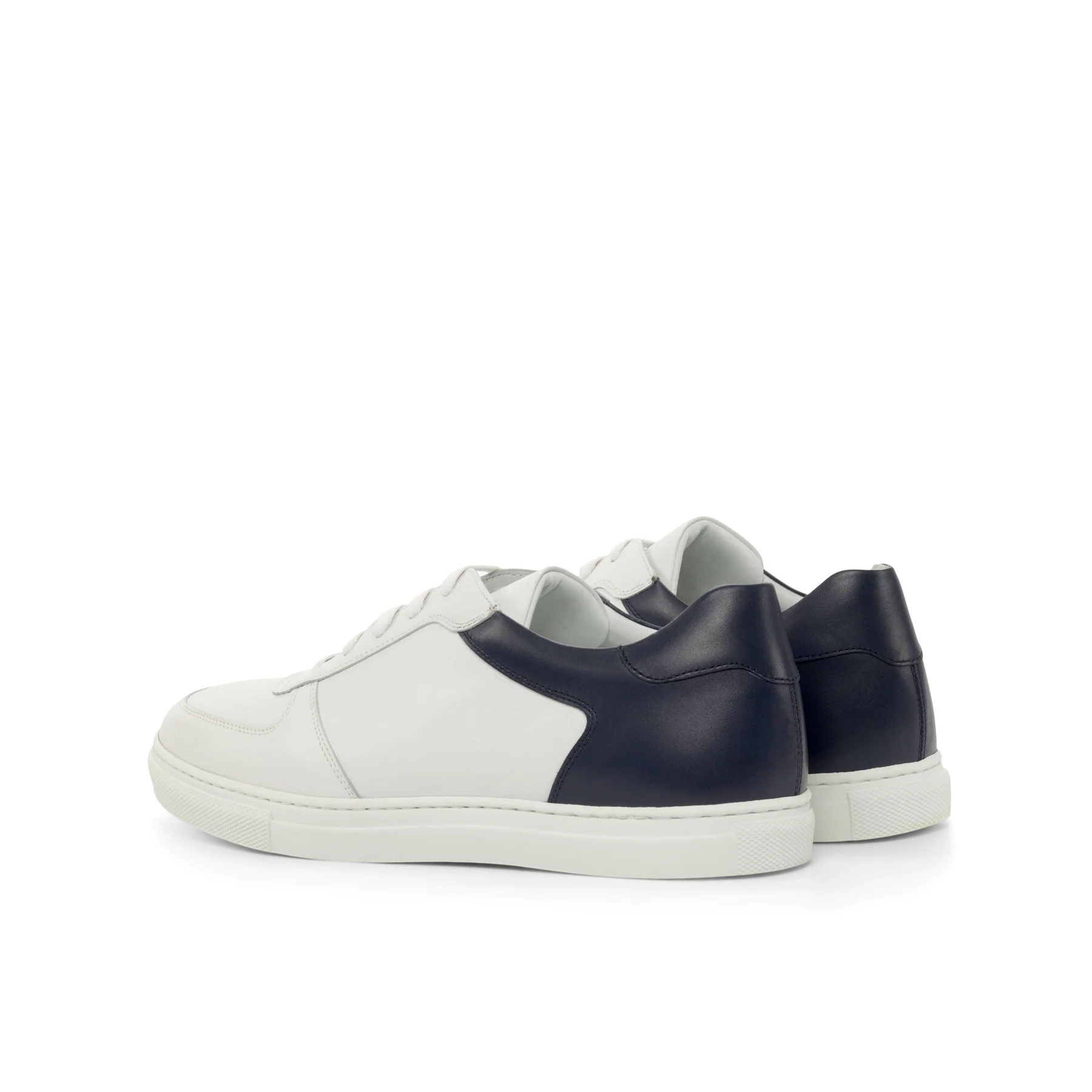 Introducing the newest addition to the Robert August family, The Ashland Ave. Low Top Sneaker No. 4921. Handcrafted with the utmost attention to detail, these sneakers are a perfect blend of minimalistic design and superior quality. Made with the finest materials, these sneakers feature a base of white nappa leather on the toe box, eyestay, and tongue. The back is accentuated with sleek navy blue painted calf leather, adding a touch of elegance to the overall design. The heel tab, also in navy blue painted calf, adds a pop of color and completes the look.