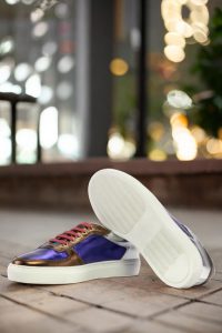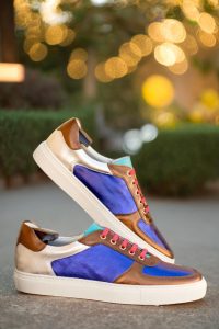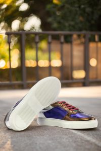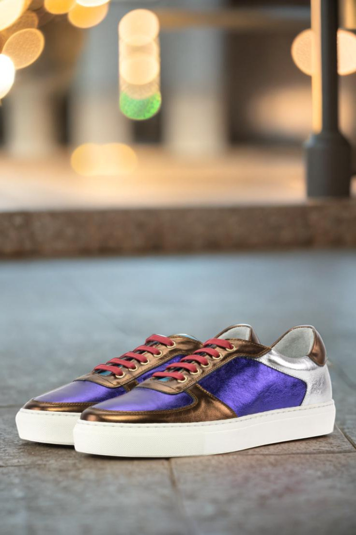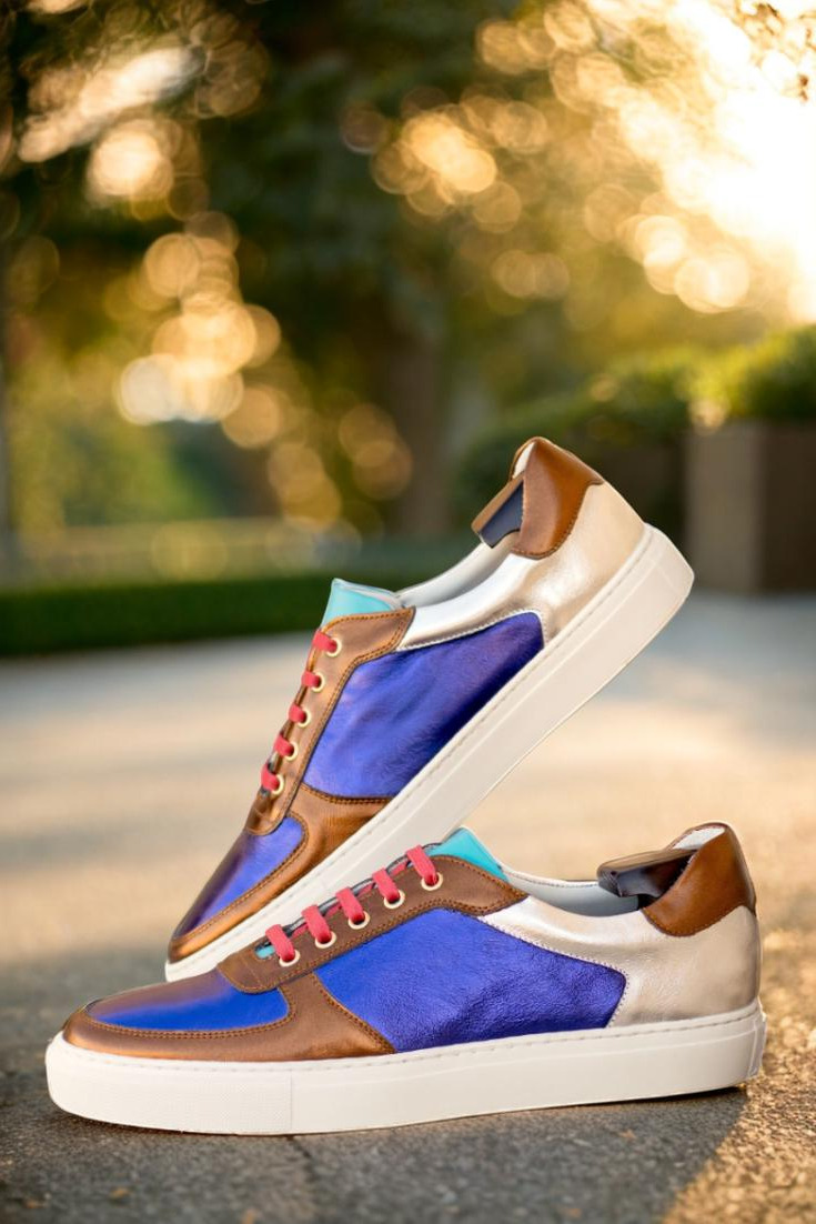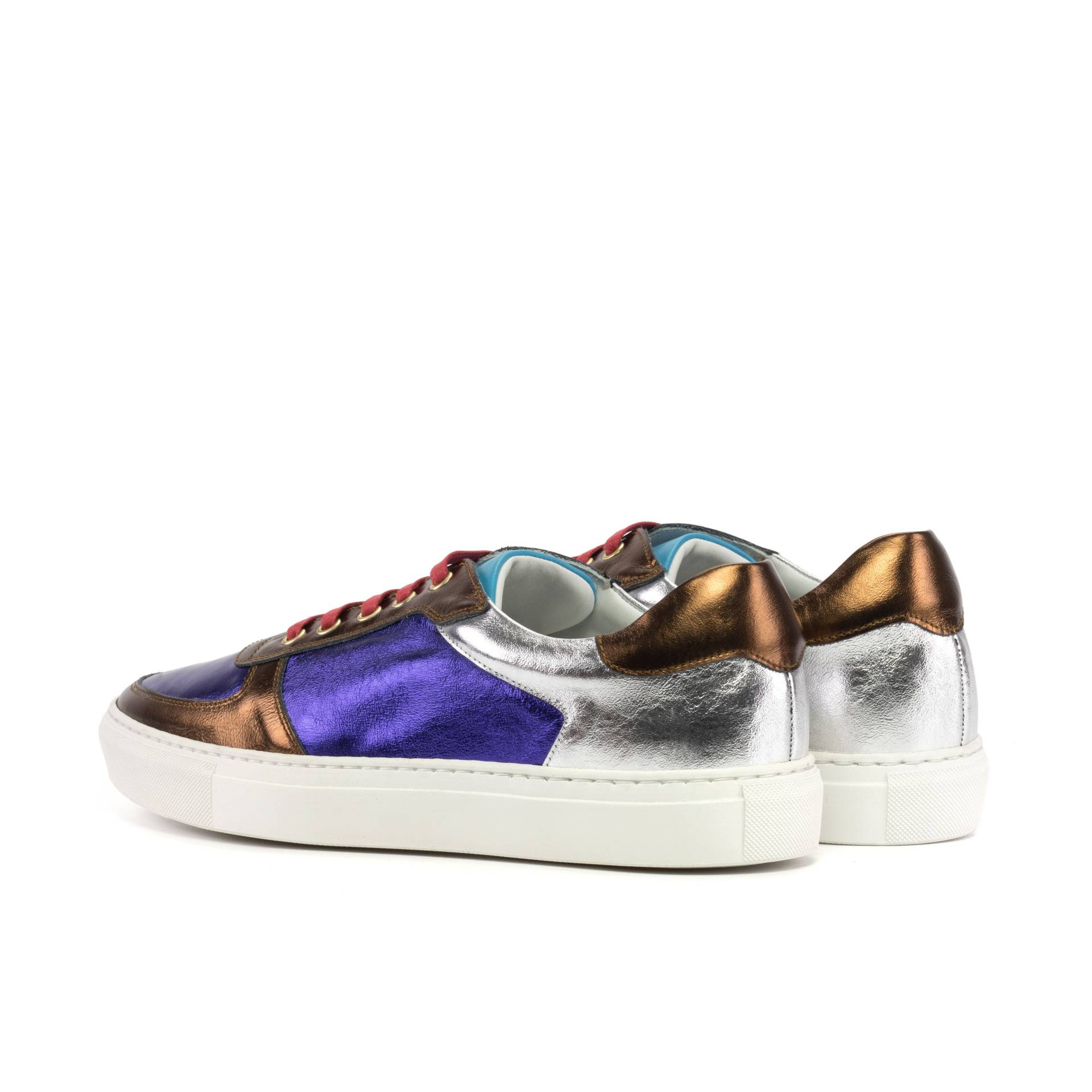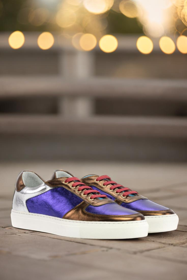 Experience the classic style of the Ashland Ave. Low Top Sneaker No. 5804. With its high-quality metallic and leather construction, this sneaker is perfect for anyone who wants to make a bold, fashionable statement. The purple metallic calf base creates a smooth finish complemented perfectly by the copper metallic toe box and eyestay. The eyelets, laces, and heel tab are all made from copper metalic calf, with bright turquoise Nappa leather on the tongue, providing a unique and captivating design. An added feature is the silver metallic calf on the back, as well as the contrasting gold accents. The finished look is provided by the white rubber cupsole, and the white calf leather lining adds superior comfort. Whether you’re out for a night on the town or simply running errands around town, the Ashland Ave Low Top Sneaker No. 5804 will have you looking like a celebrity with any outfit you choose!
