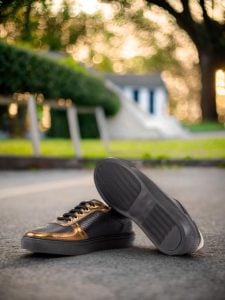 But we didn’t stop there. The heel tab is also made of copper metallic calf, making sure that every angle of this shoe is appealing. And to tie it all together, black eyelets and orange laces provide a pop of color, adding a touch of playfulness to this modern design.