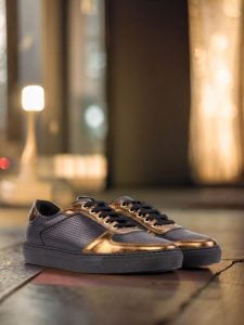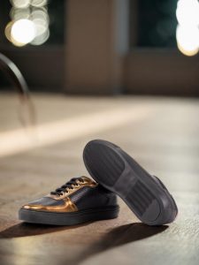 But we didn’t stop there. The heel tab is also made of copper metallic calf, making sure that every angle of this shoe is appealing. And to tie it all together, black eyelets and orange laces provide a pop of color, adding a touch of playfulness to this modern design.