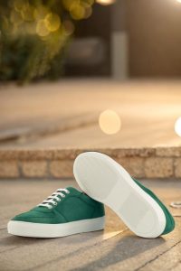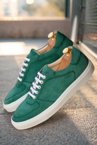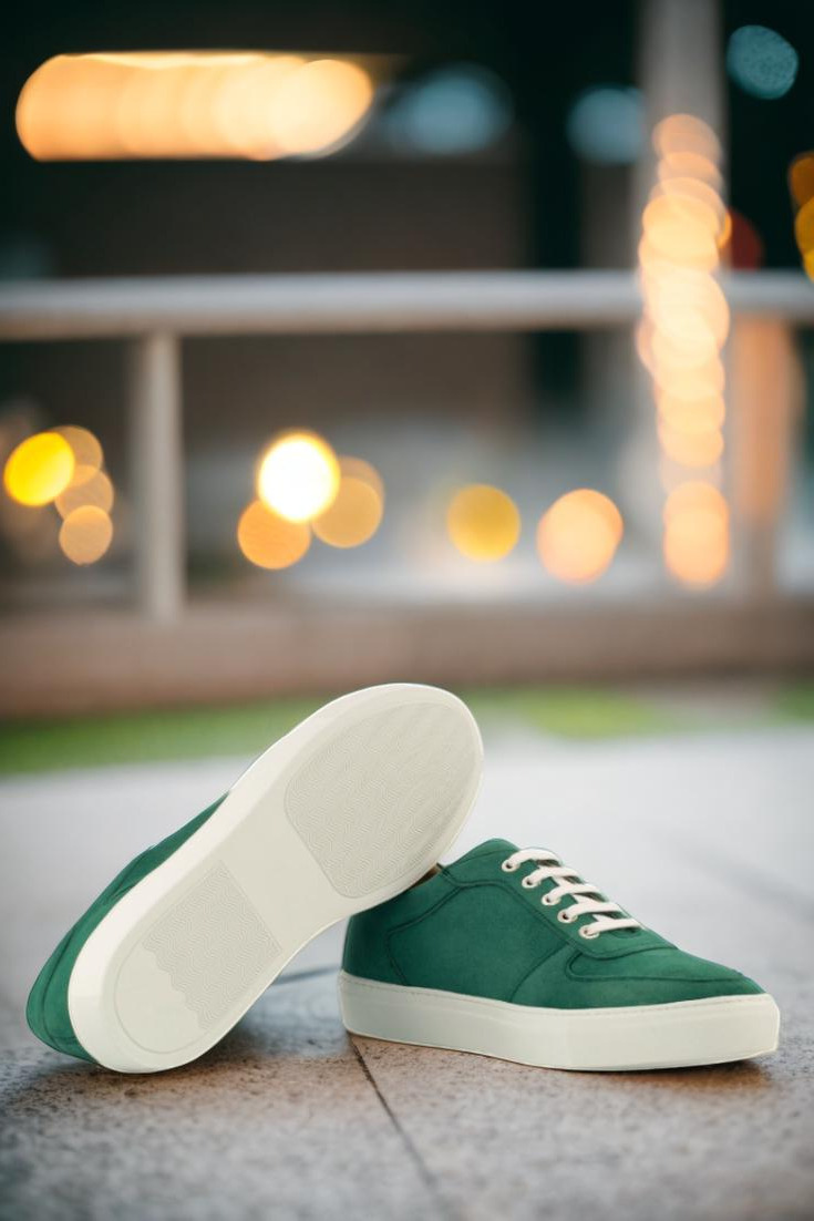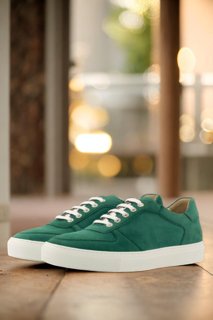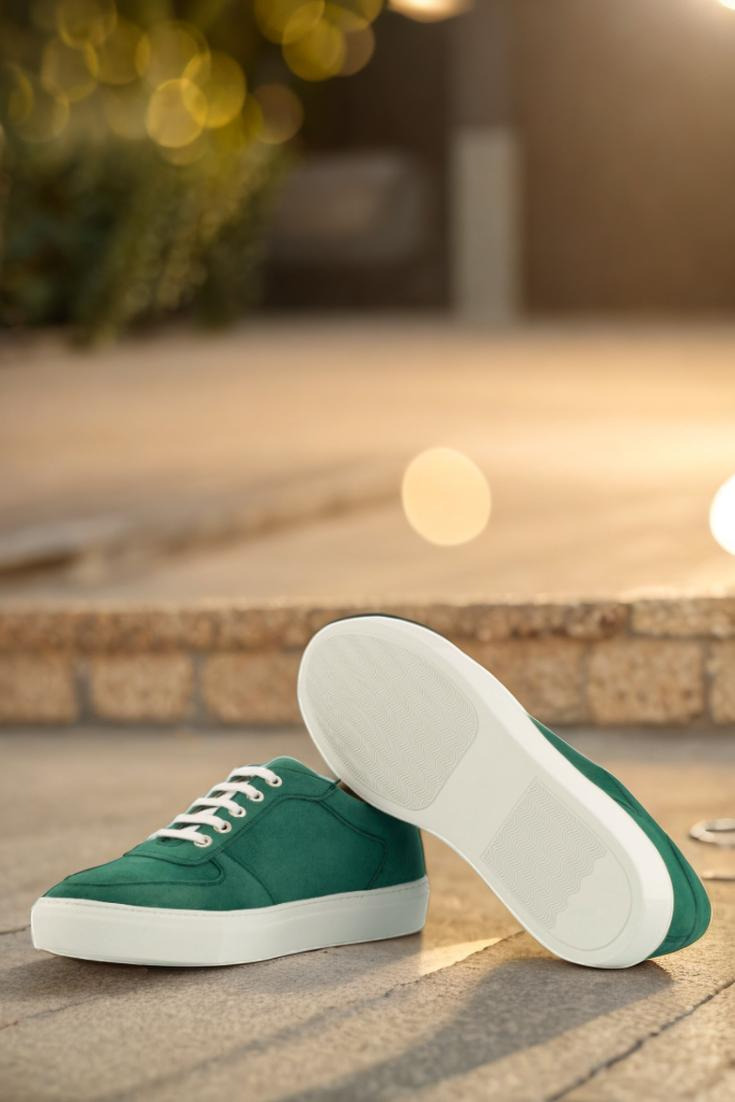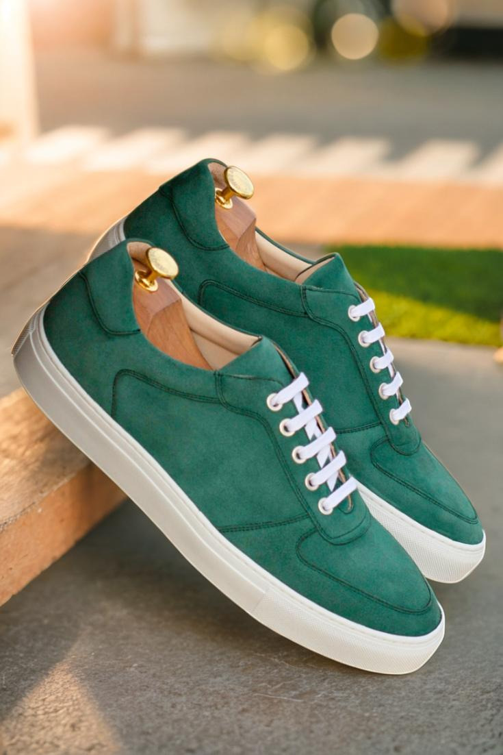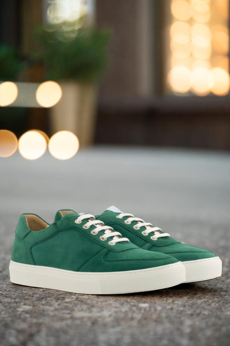 Introducing the Ashland Ave. Low Top Sneaker No. 4178 from Robert August. This sneaker is the perfect combination of style and craftsmanship, exuding simplicity and sophistication. Handcrafted in Spain, these sneakers boast a forest green kid suede upper with nickel eyelets, creating a sleek and modern look. The contrast of the white laces against the vibrant green adds a touch of subtle elegance. The lining is made of luxurious beige calf leather, providing ultimate comfort and durability for all-day wear. Completing the look is a classic white rubber cupsole, giving a clean and polished finish. These sneakers are perfect for the fashion-forward individual who values efficiency and functionality. Elevate your shoe game with the Ashland Ave. Low Top Sneaker No. 4178 from Robert August. Get yours today and experience the perfect blend of style and quality.