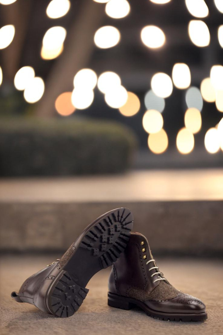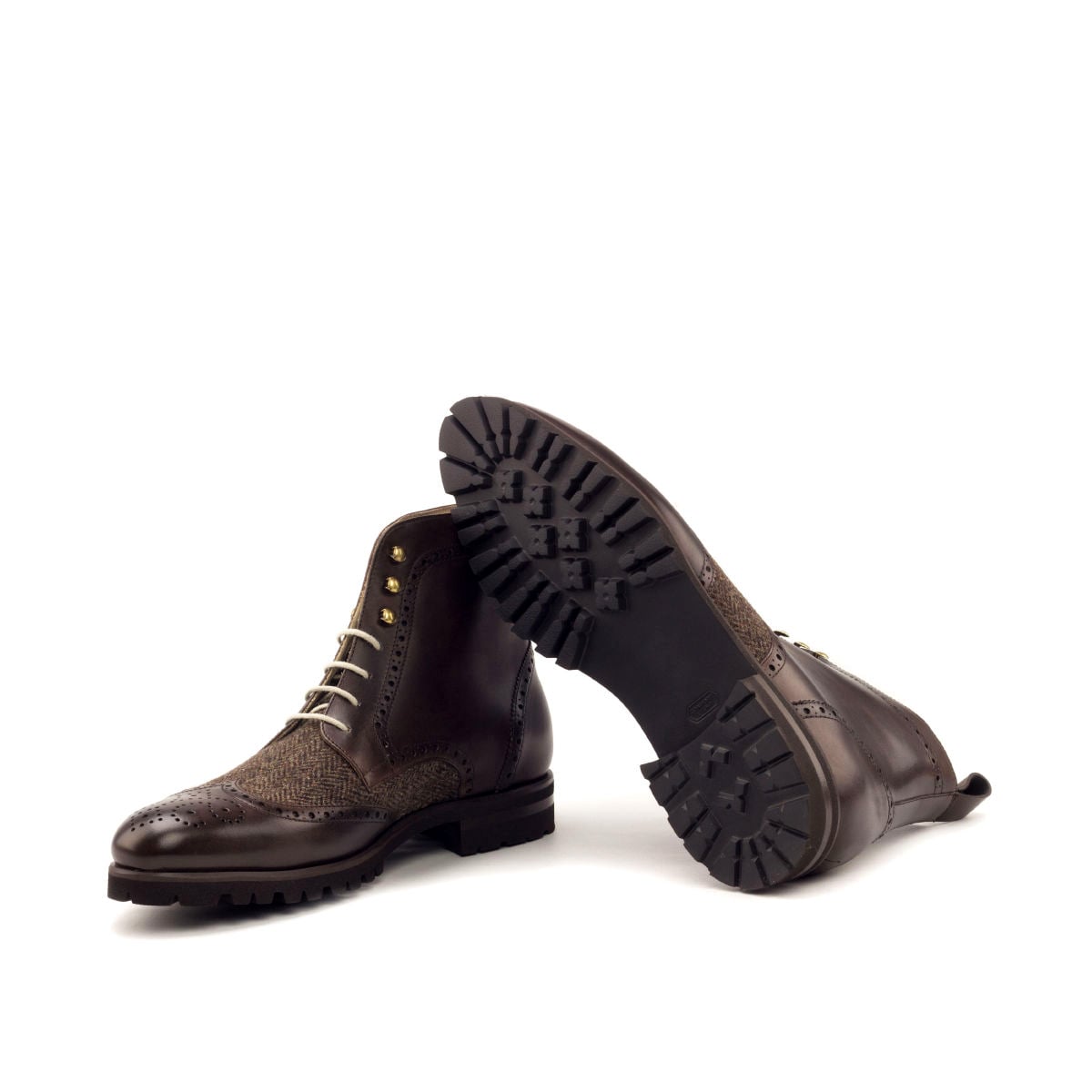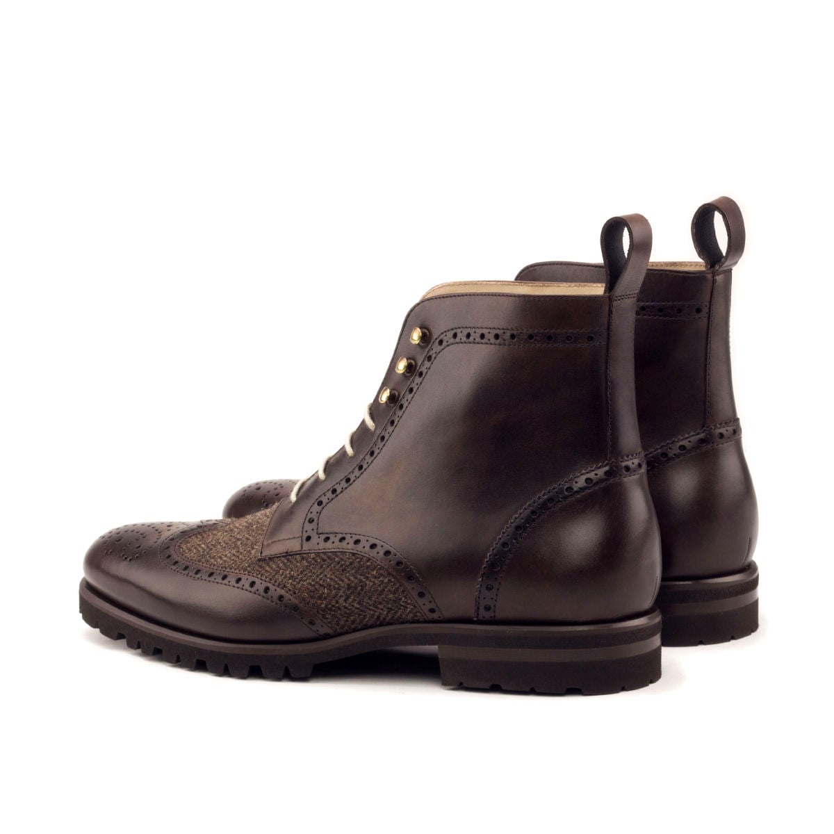 Featuring a stunning dark brown painted calf toe cap, quarter, and back, paired with a luxurious brown herringbone wool vamp, this boot exudes timeless charm and refinement. The dark brown painted calf back strap adds a touch of flair, while the graphite eyelets and round-taupe laces complement the overall aesthetic perfectly.