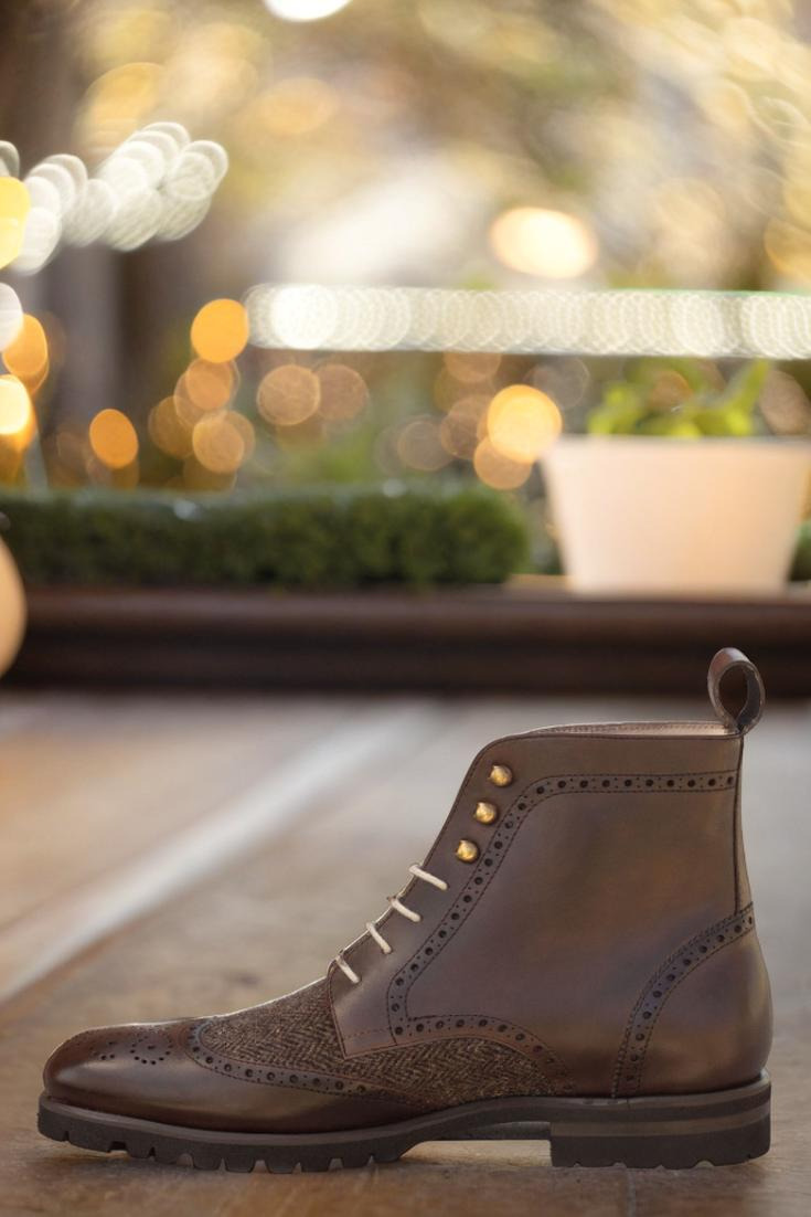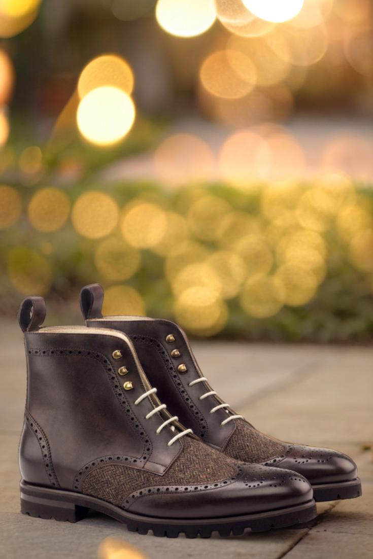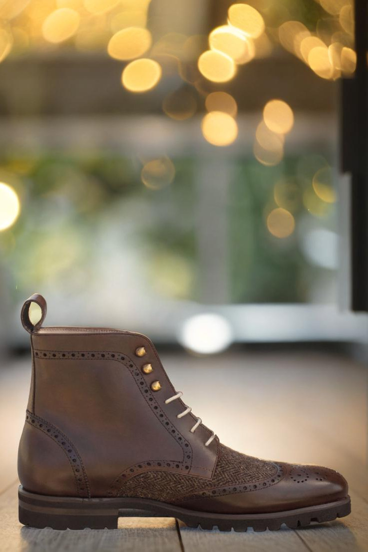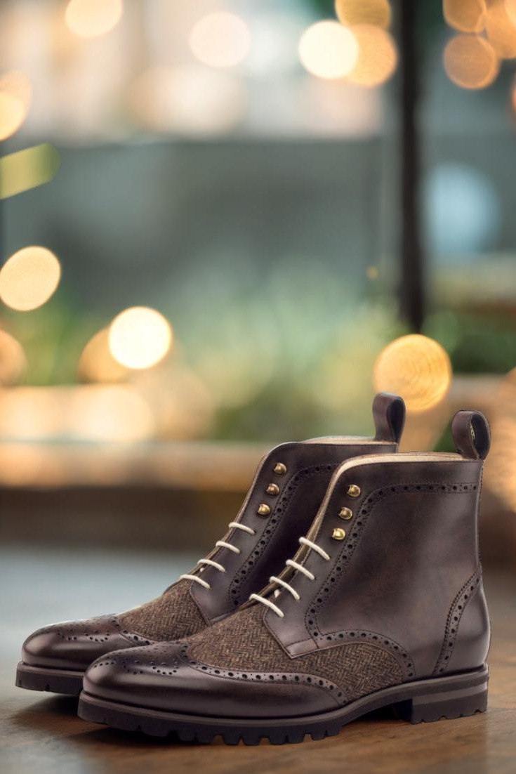 Featuring a stunning dark brown painted calf toe cap, quarter, and back, paired with a luxurious brown herringbone wool vamp, this boot exudes timeless charm and refinement. The dark brown painted calf back strap adds a touch of flair, while the graphite eyelets and round-taupe laces complement the overall aesthetic perfectly.