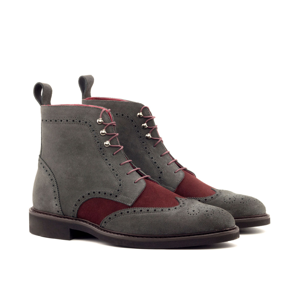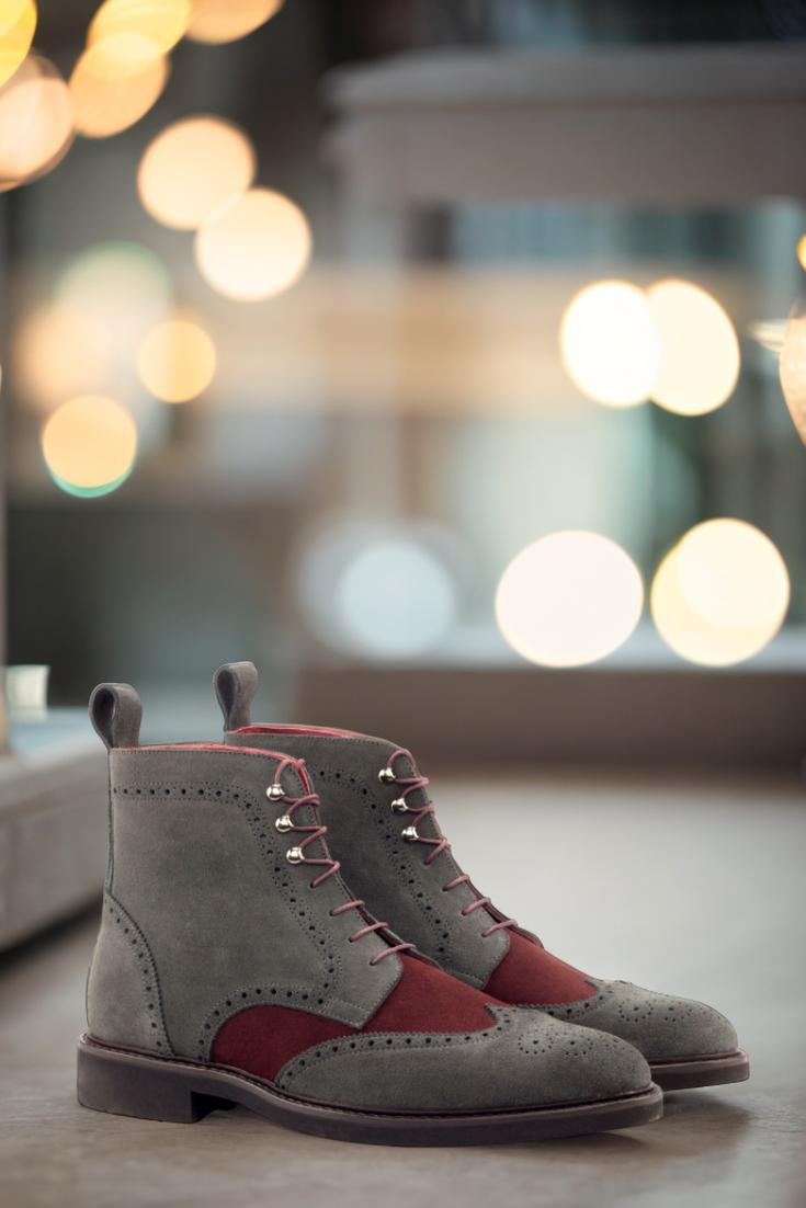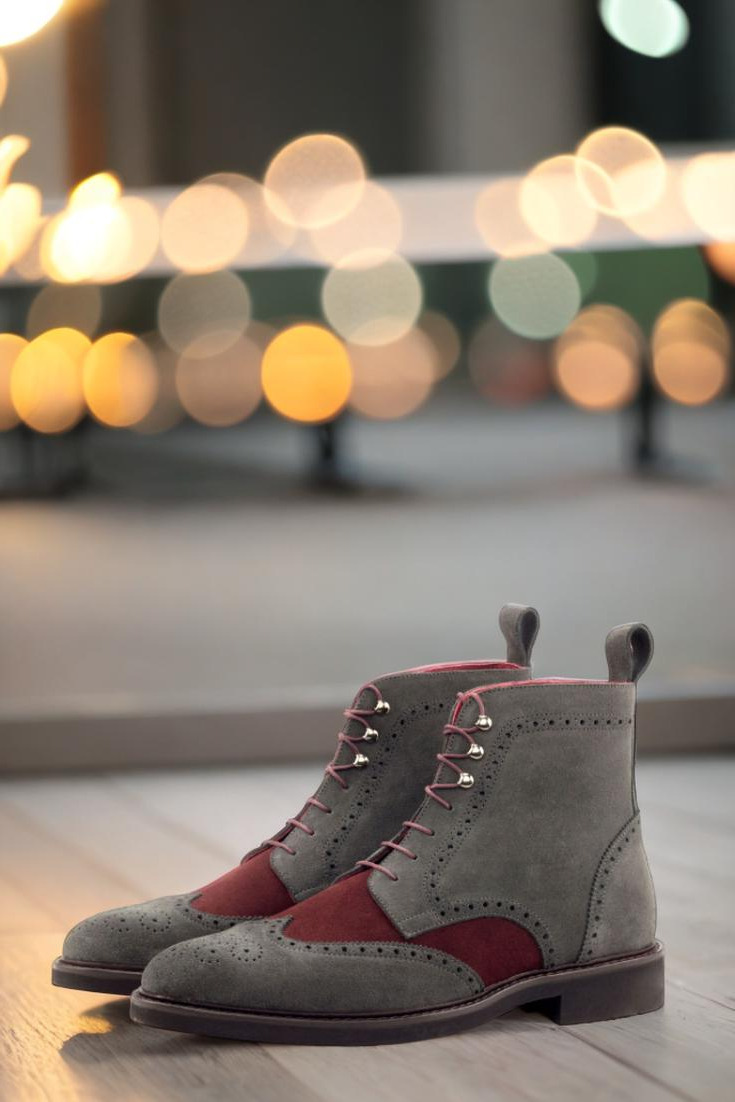 The grey Luxe Suede toe cap and quarter, paired with the rich burgundy Luxe Suede vamp, exude a sense of timeless elegance and high-end luxury. The back strap adds a touch of modern flair, while the graphite eyelets and round-burgundy laces provide a perfect finishing touch.