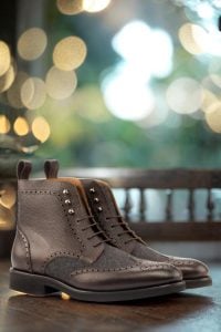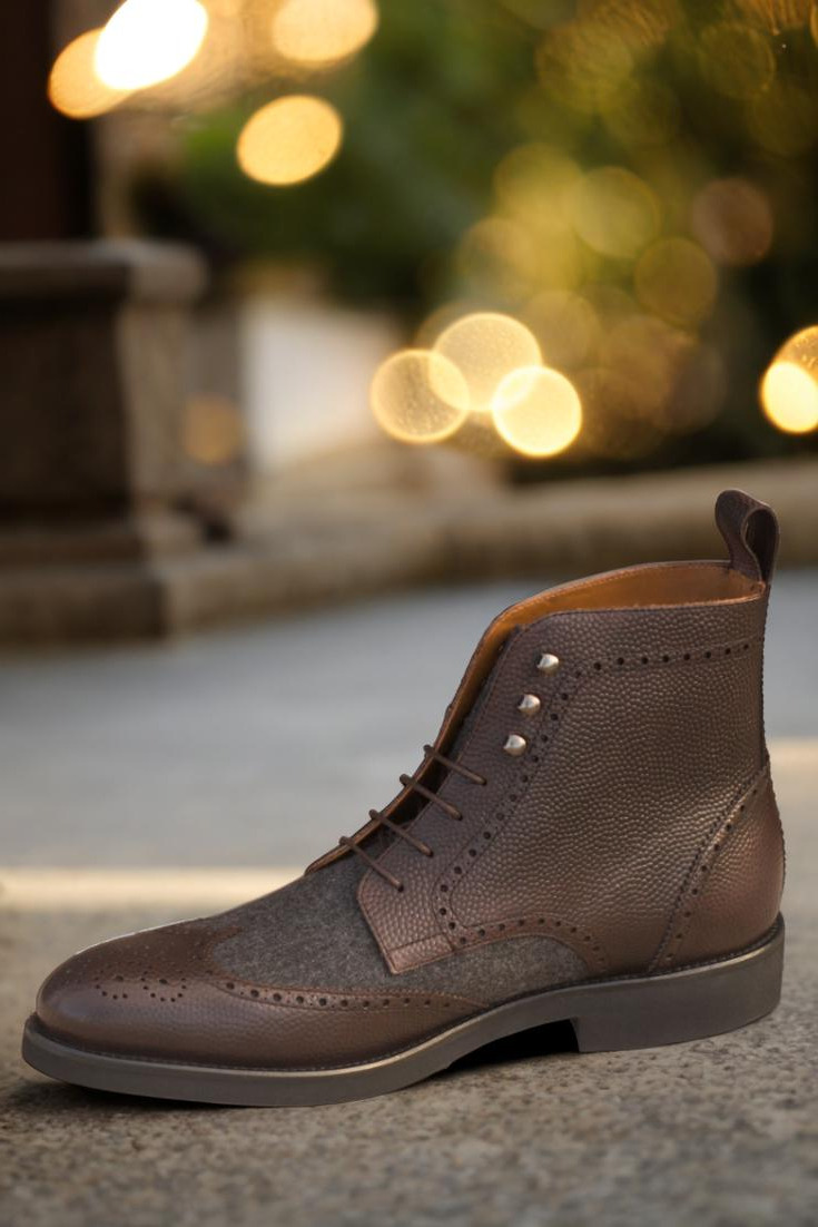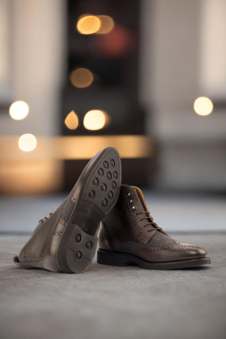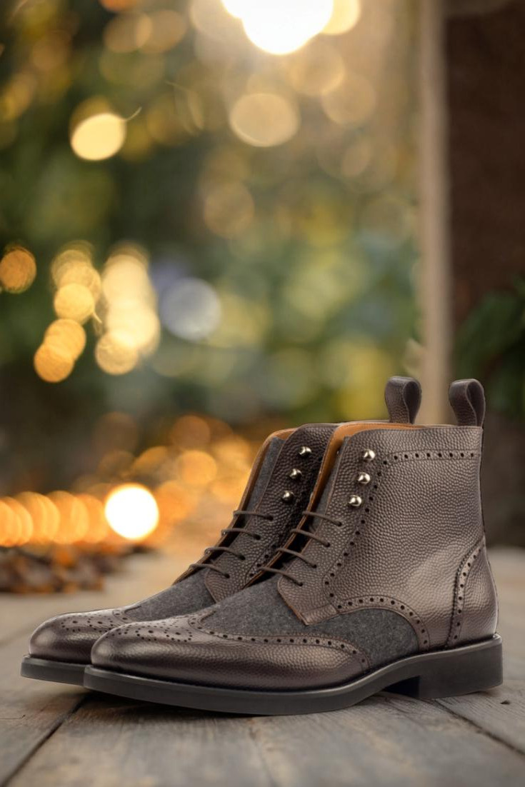 Made with the finest materials, every detail of this boot has been carefully considered and crafted. The toe cap is made of dark brown pebble grain leather, providing durability and sophistication to the overall design. The vamp boasts a dark grey flannel, adding a touch of ruggedness to the boot.