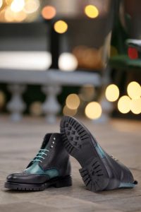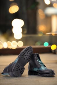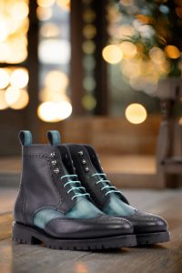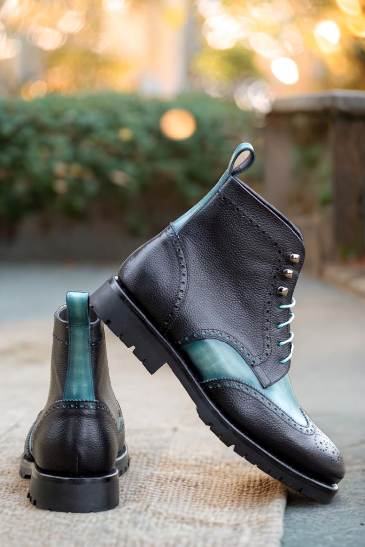 The eternally cool toe cap is black full grain leather, while the lively vamp is turquoise Papiro hand patina leather, delivering plenty of texture and charm. The truly superior quarter and back are also black full grain leather, so you can anticipate a lasting wear that won’t let you down in any situation. Paired with the vibrant turquoise back strip in Papiro hand patina leather, these luxurious components create a boot that looks good at both formal and casual events.