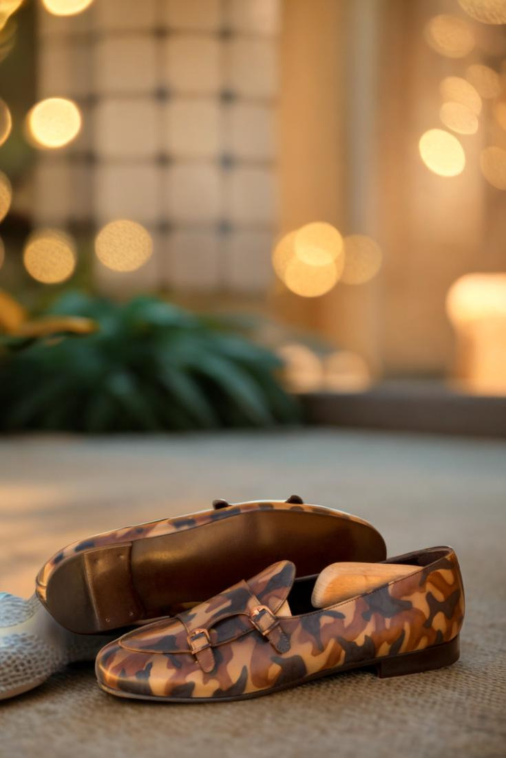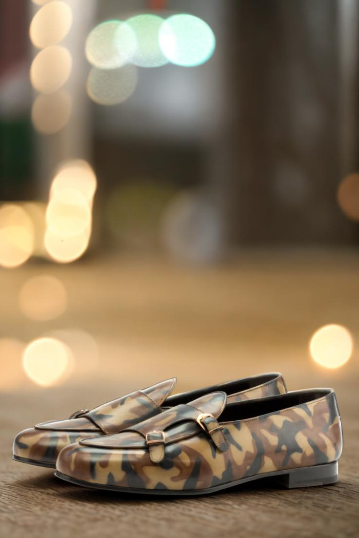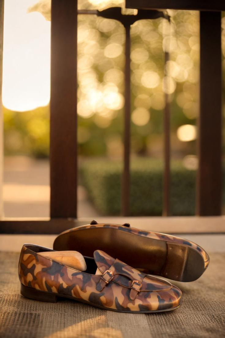 Elevate your footwear game with The Pershing Rd. Monk Strap Loafer No. 3507 from Robert August. This stylish loafer boasts a sleek and modern design while still maintaining the classic sophistication of a traditional monk strap shoe. Crafted with top quality Italian calf leather, and adorned with a unique Brown Camo Hand Patina, these shoes are bound to turn heads wherever you go.