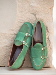 The uppers feature a lush forest green suede, adding a touch of elegance to any outfit. The trim is made from dark brown painted calf, giving the shoe a rich and luxurious look. The copper buckles provide the perfect contrast, adding a touch of sophistication and flair.