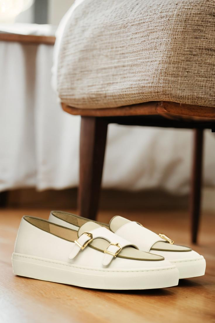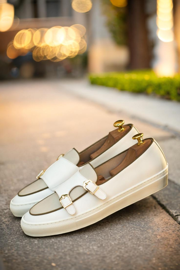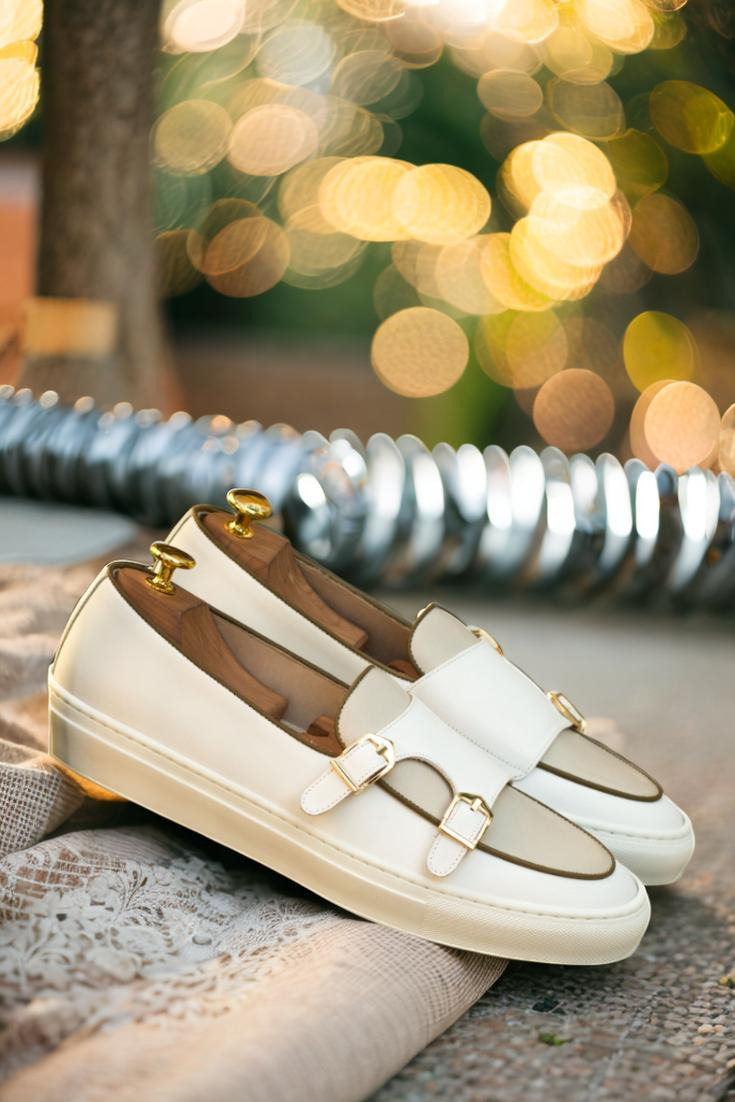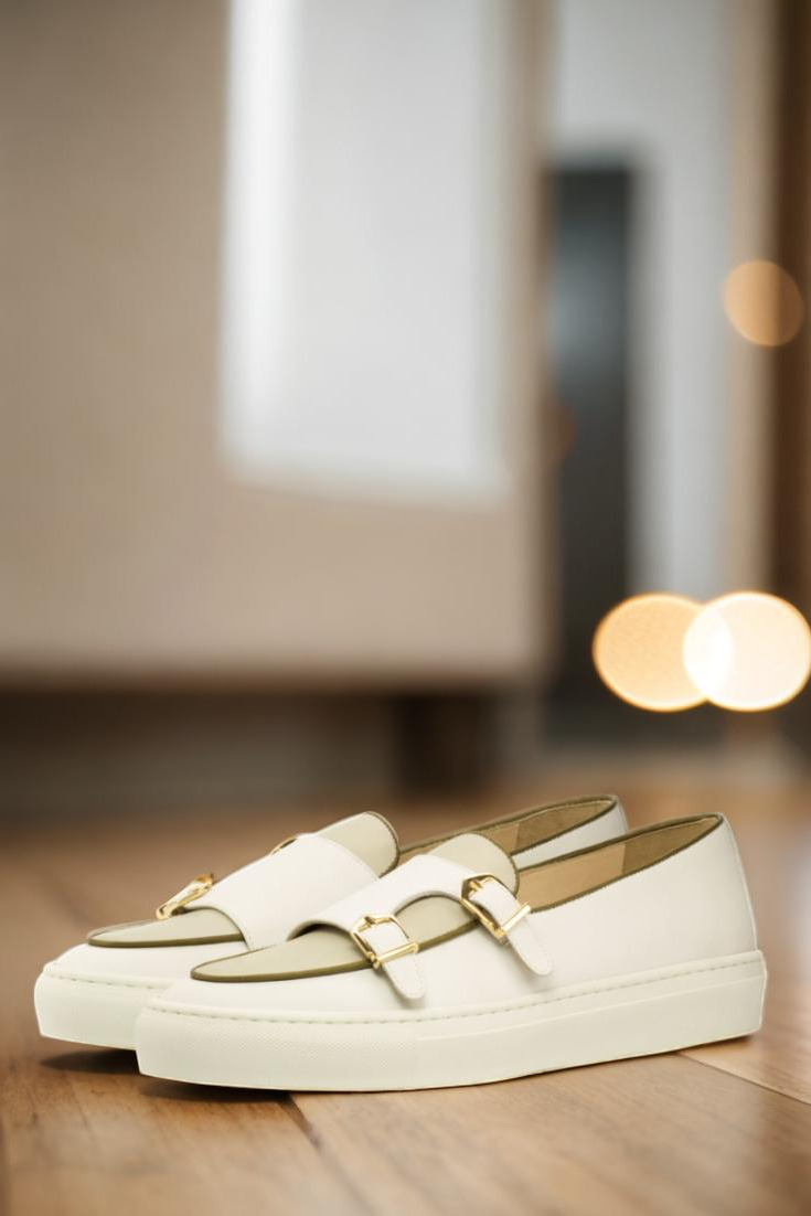 Introducing the Foster Ave. Monk Sneaker No. 3657 from Robert August. With a combination of classic and modern elements, this shoe is the epitome of sophisticated elegance. The outer quarter boasts smooth white Nappa leather, while the vamp and back feature a sleek nude Nappa leather. But it doesn’t stop there, the inner quarter is also made from white Nappa leather, creating a cohesive and luxurious look.