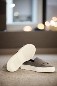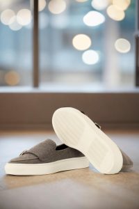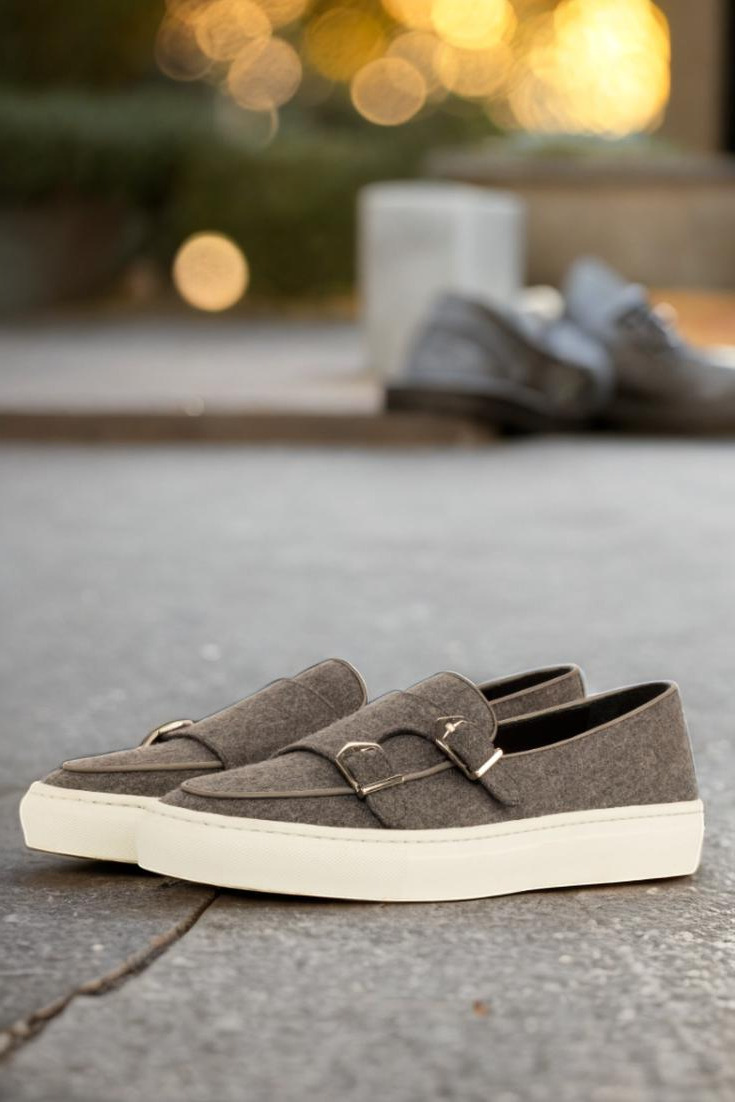 The light grey flannel quarter, upper and vamp, along with the monk strap, give these sneakers a distinct, elegant look. The grey nappa leather back and trim add a touch of sophistication, while the graphite buckles make a statement. And for all-day comfort, these sneakers feature a black calf leather lining and a white rubber cupsole.