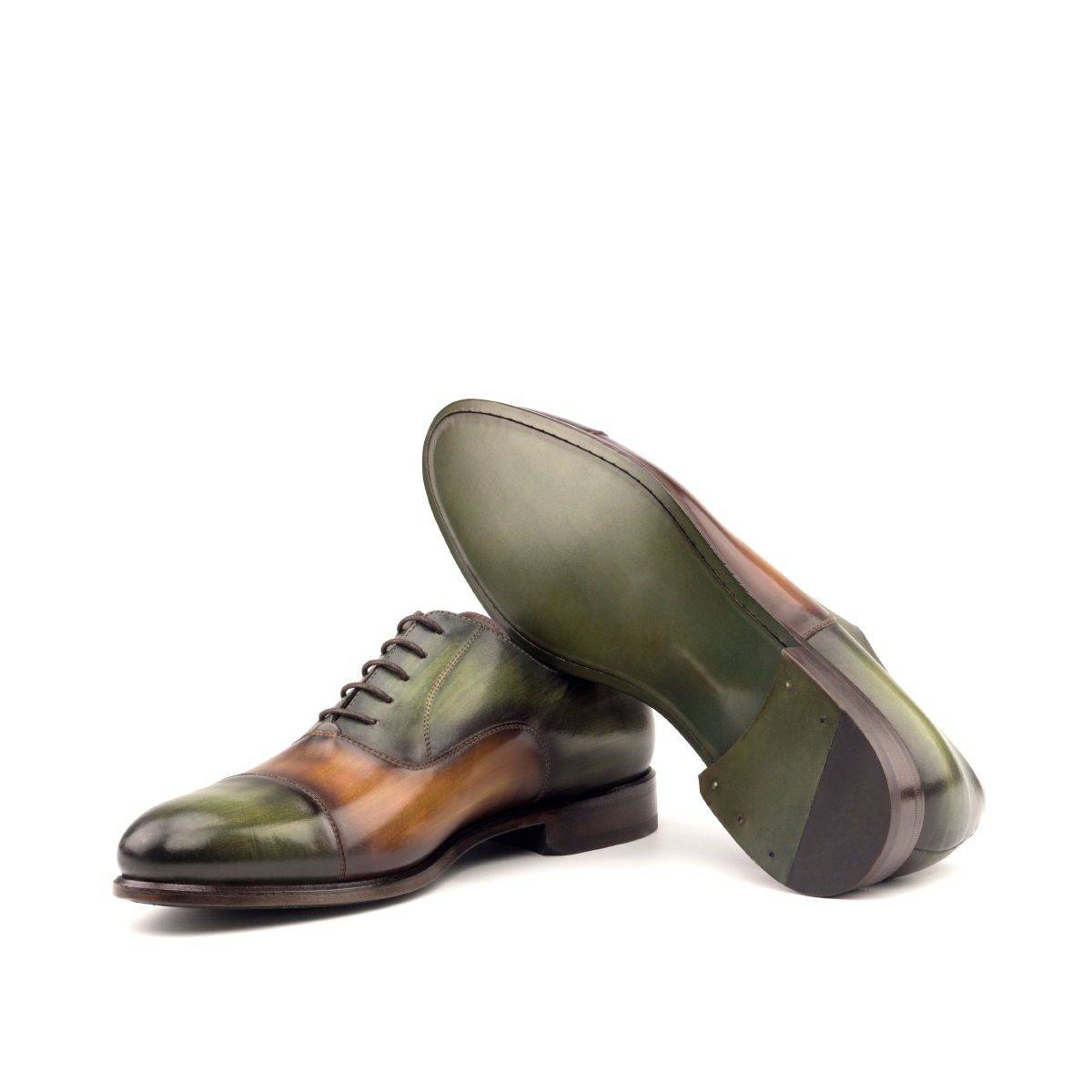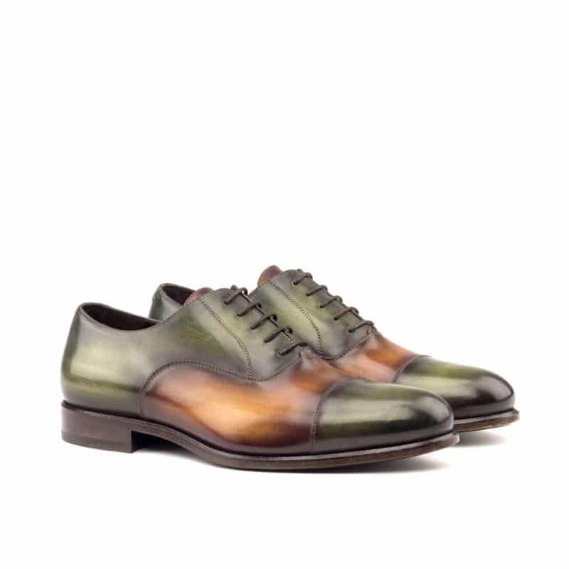 The blend of Cognac and Khaki Hand Patina Leather on the vamp, toe cap, vamp tab, base, and tongue creates a uniquely rich and textured look. And with a Light Patina Intensity, these oxfords will only get better with age, developing a personal and distinguished patina unique to each individual.