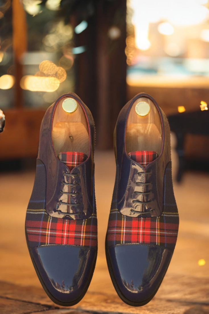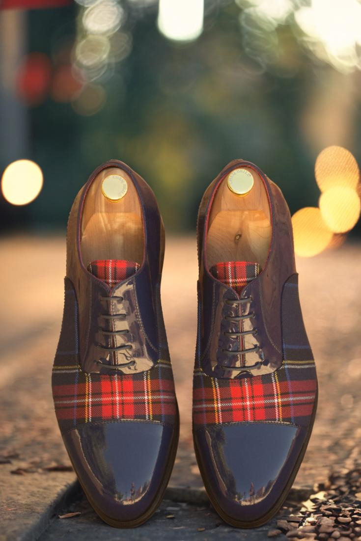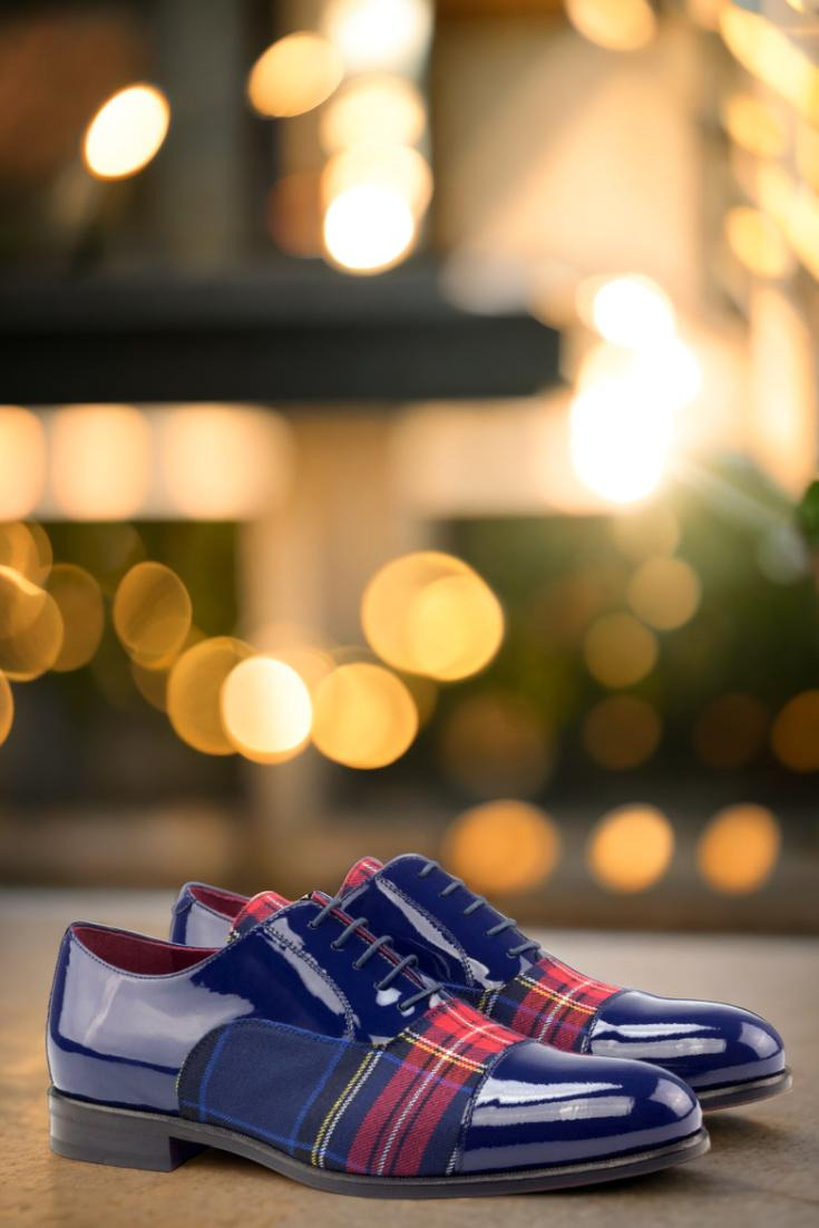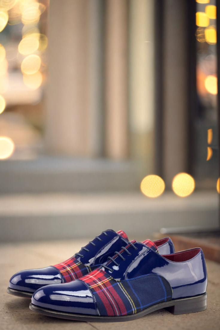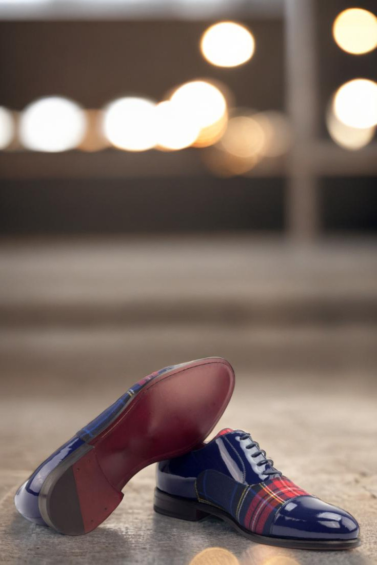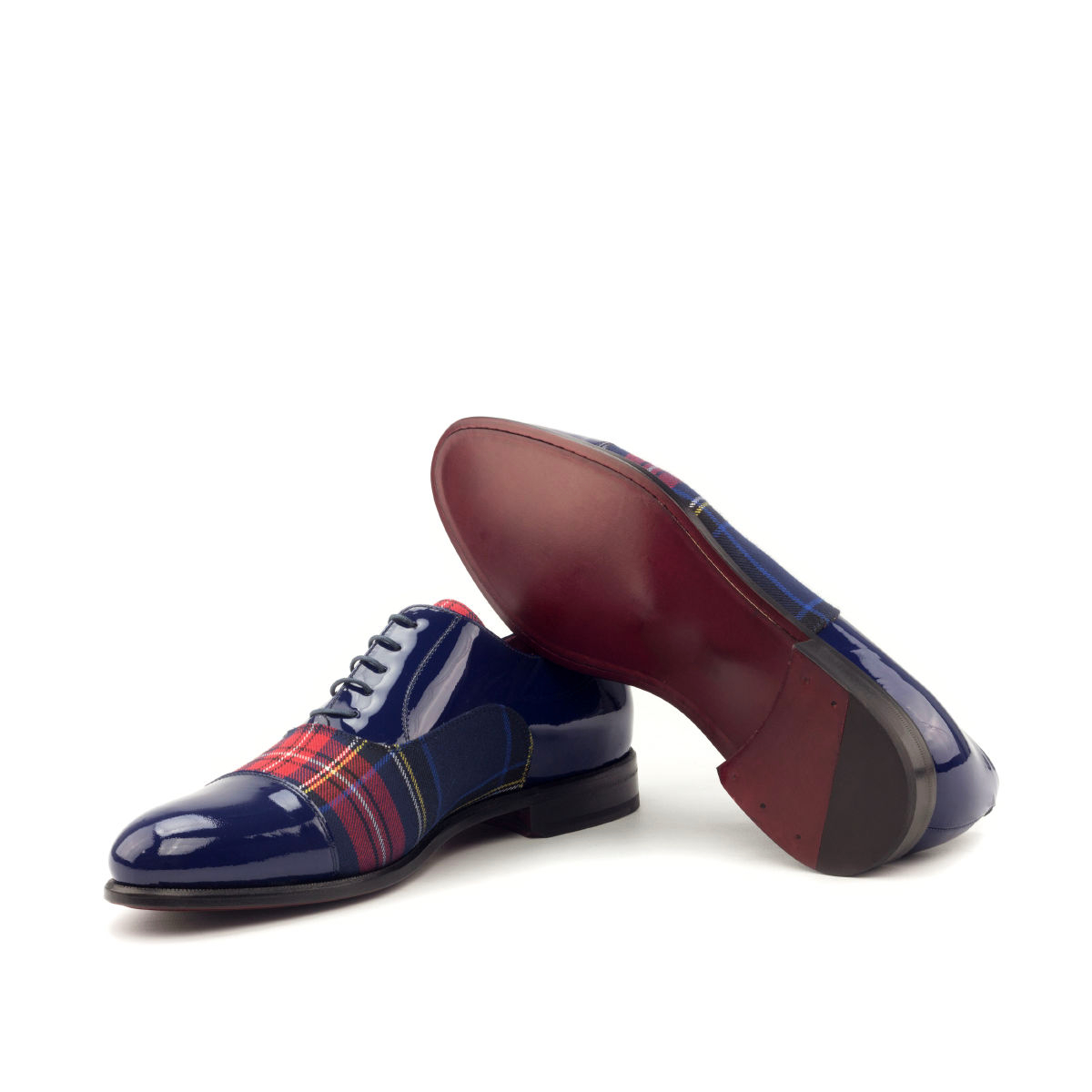 The toe cap in cobalt blue patent leather adds a touch of sophistication, while the vamp in red tartan wool brings a pop of color and texture. The vamp tab in dark brown painted calf offers a subtle contrast, creating a dynamic visual interest that is sure to impress.