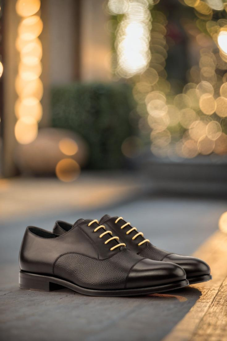 But the excellence doesn’t stop there. The base, crafted from black box calf, seamlessly integrates with the tongue, made from the same sumptuous black pebble grain leather. This harmonious pairing not only creates a visually captivating aesthetic but also ensures unparalleled comfort and durability.
