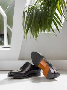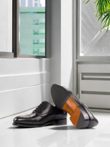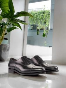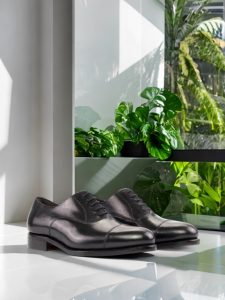 With uppers made from Black Luxe Calf, this shoe exudes an air of refinement and sophistication. The laces in Flat-Black add a touch of sleekness, while the Brown Calf Leather lining provides a comfortable and stylish interior. The sole, crafted with Cognac Hand Painted Leather and Rubber, adds a touch of texture and visual interest. And the Black City Welt and Last 312, featuring a Rounded Toe for a traditional English style, make this shoe a true work of art.