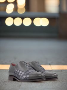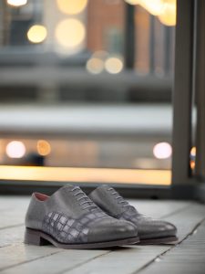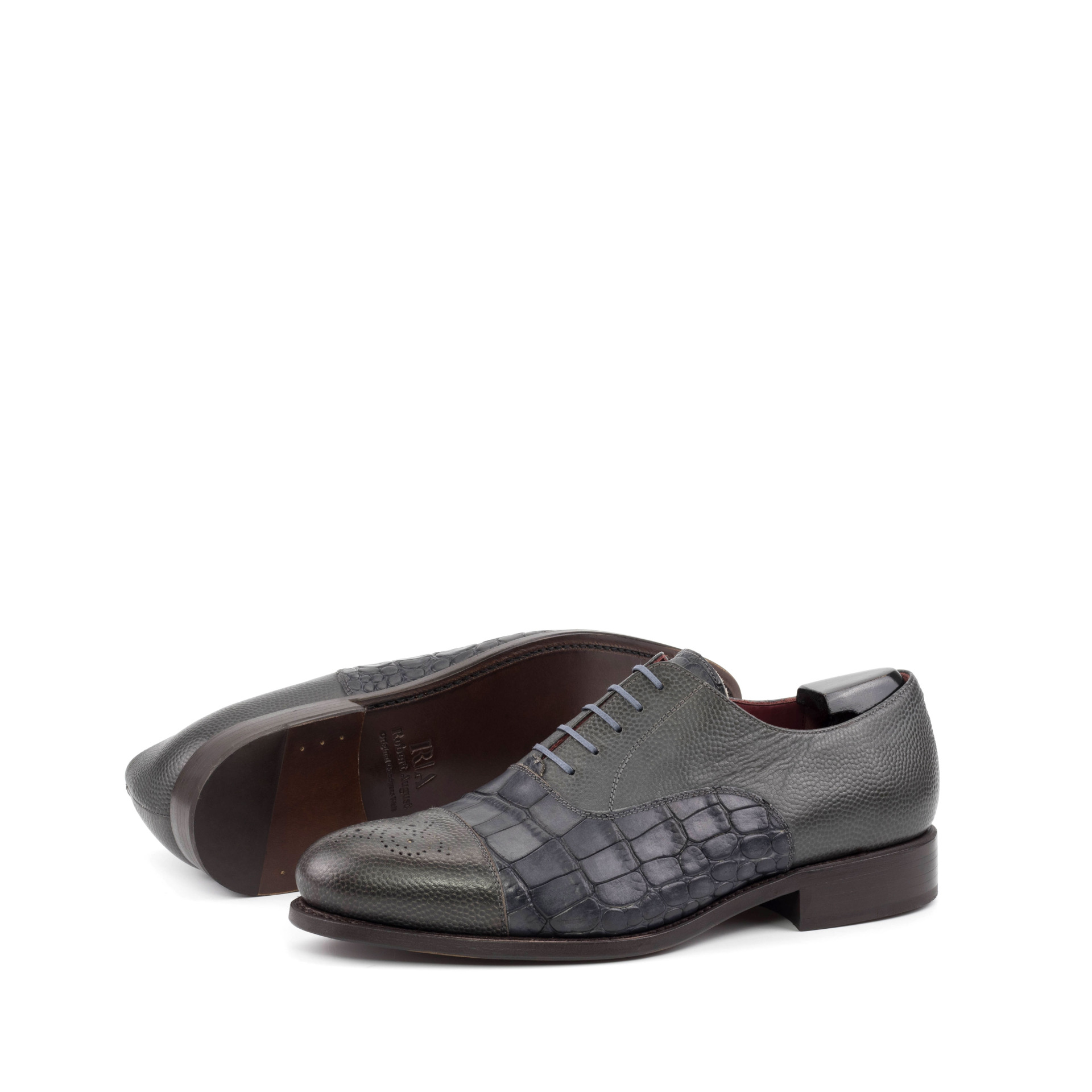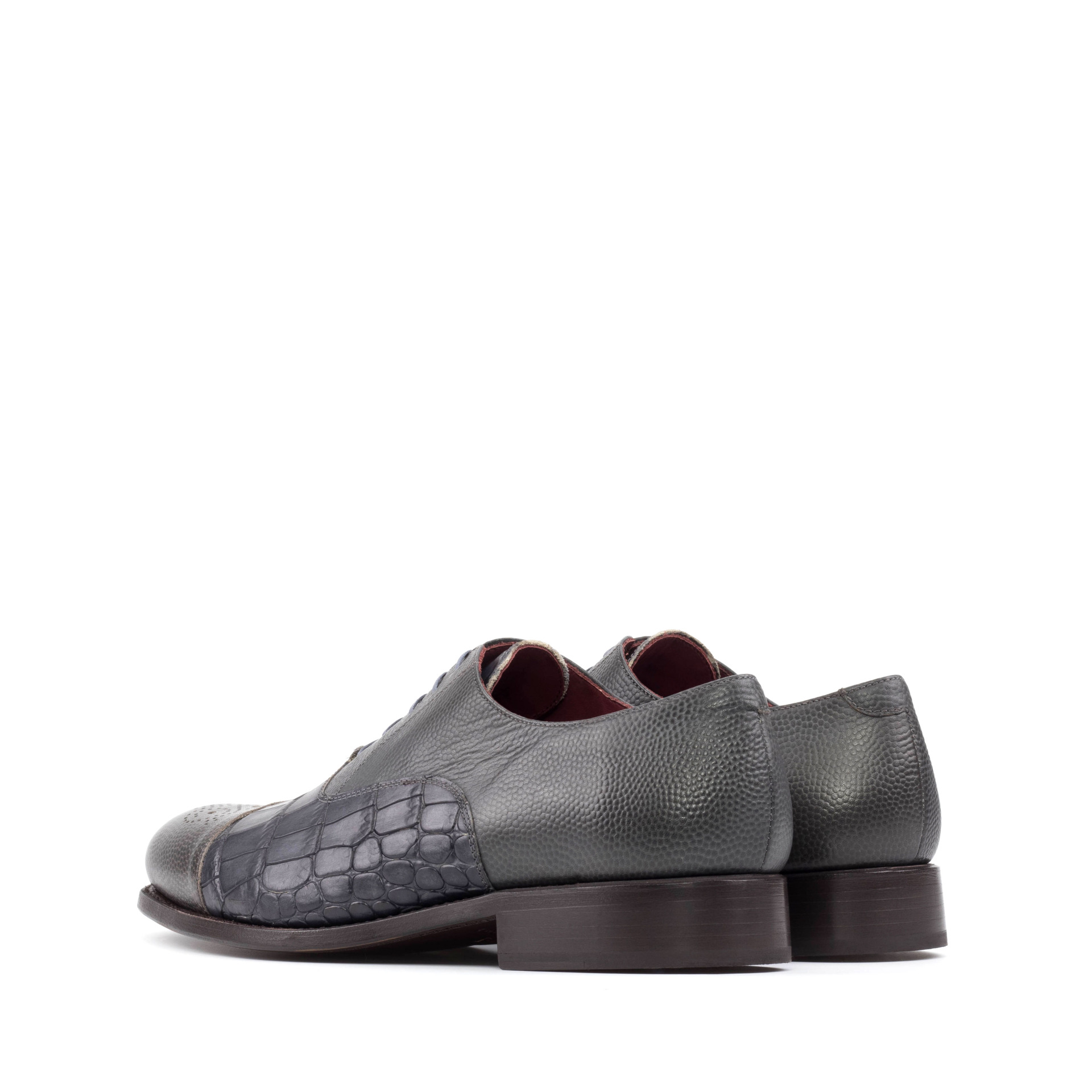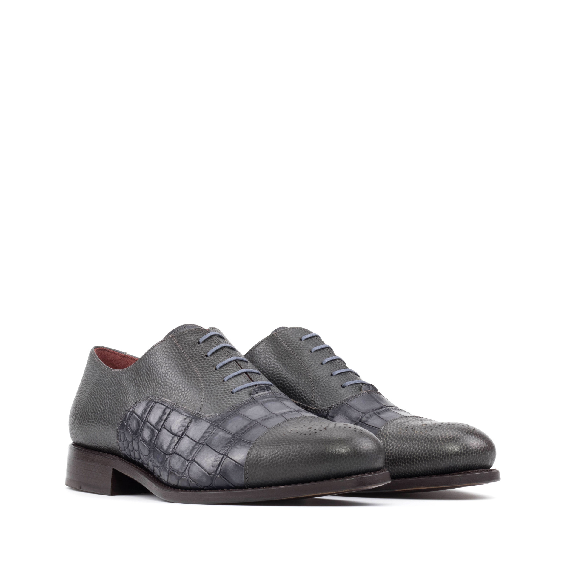 The Belmont Ave. Oxford No. 8248 from Robert August is not your average oxford shoe. With its distinct punched toe cap and elegant grey croco embossed calf leather materials, this shoe exudes a sense of timeless sophistication and effortless style. The grey full grain leather base is expertly handcrafted in Spain, utilizing the highest quality materials and attention to detail.