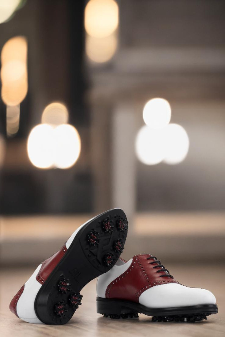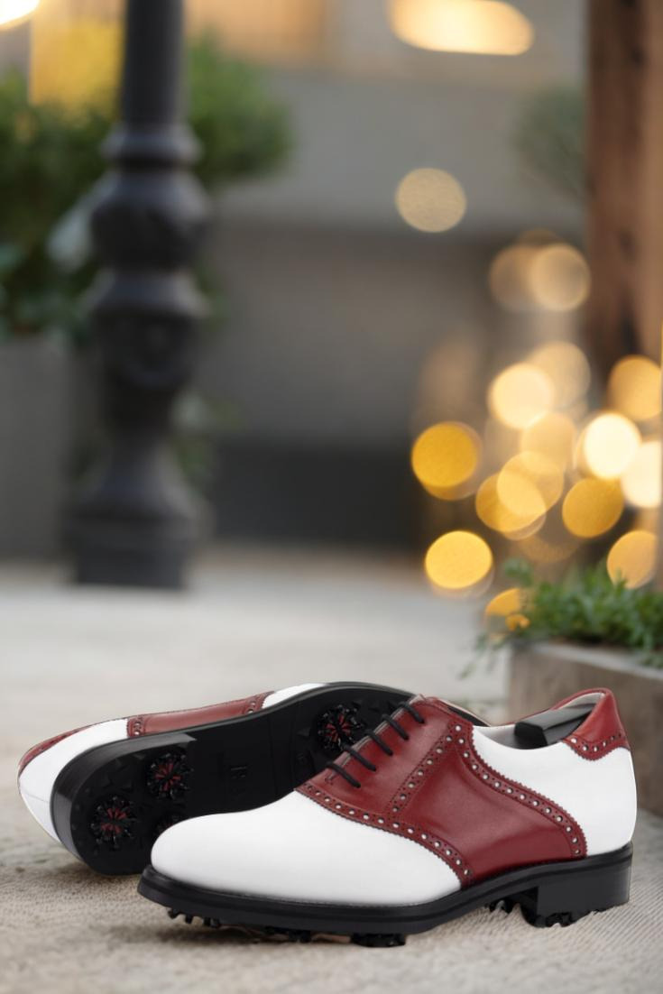The front of the shoe features a clean and crisp white luxe calf leather, while the iconic saddle is made with rich red luxe calf leather, adding a pop of color to your golf attire. The tongue and side also follow this stylish color scheme, creating a cohesive and eye-catching look.