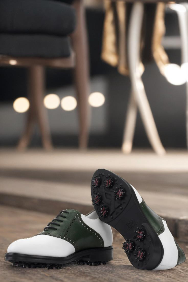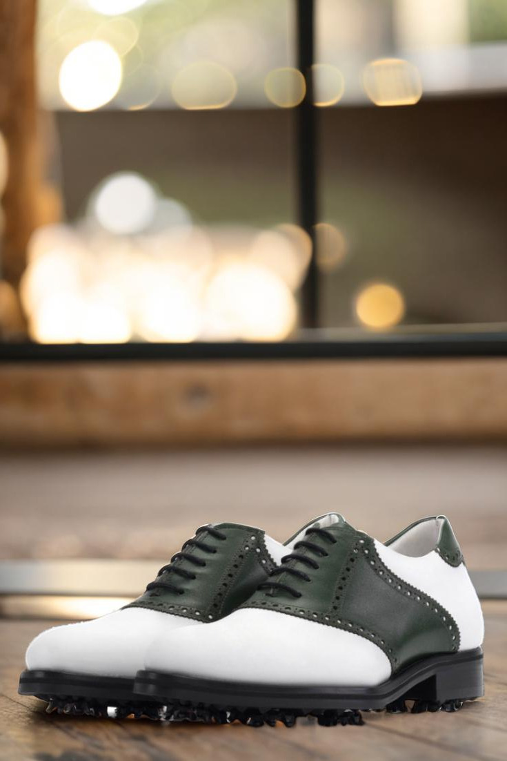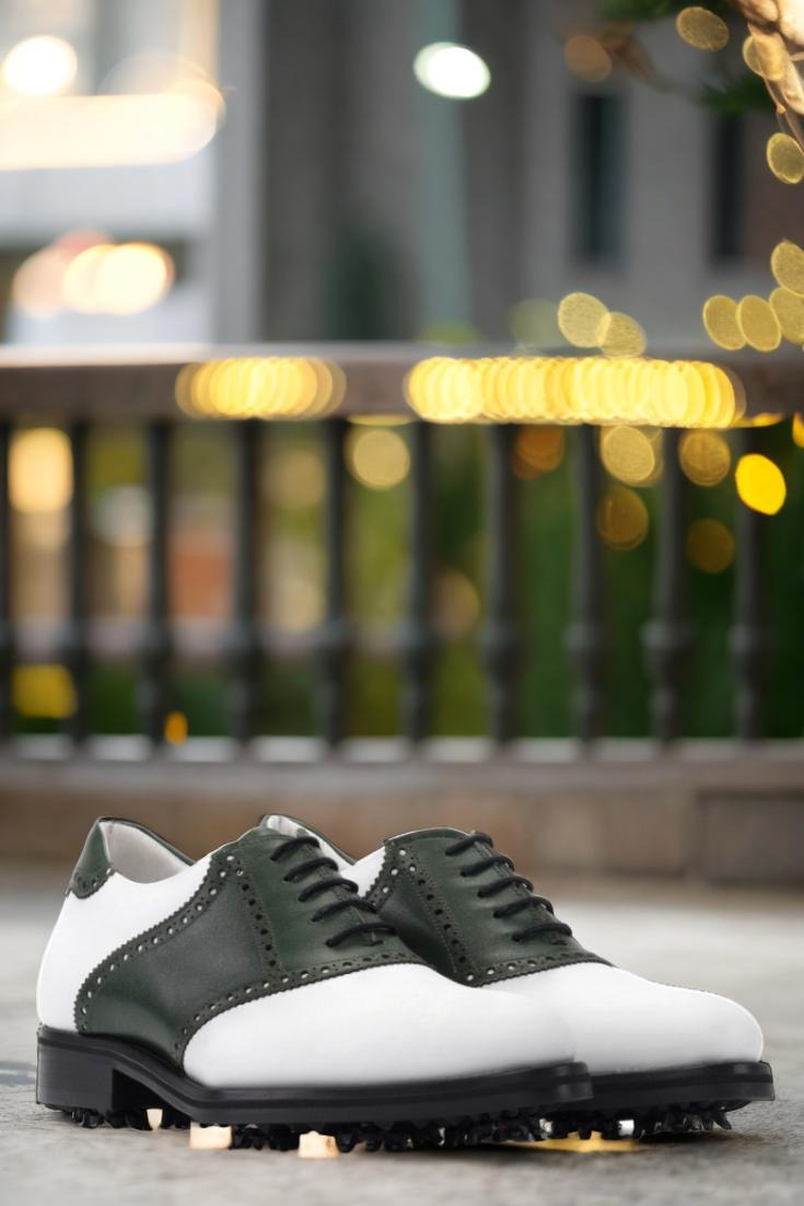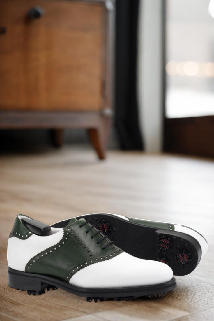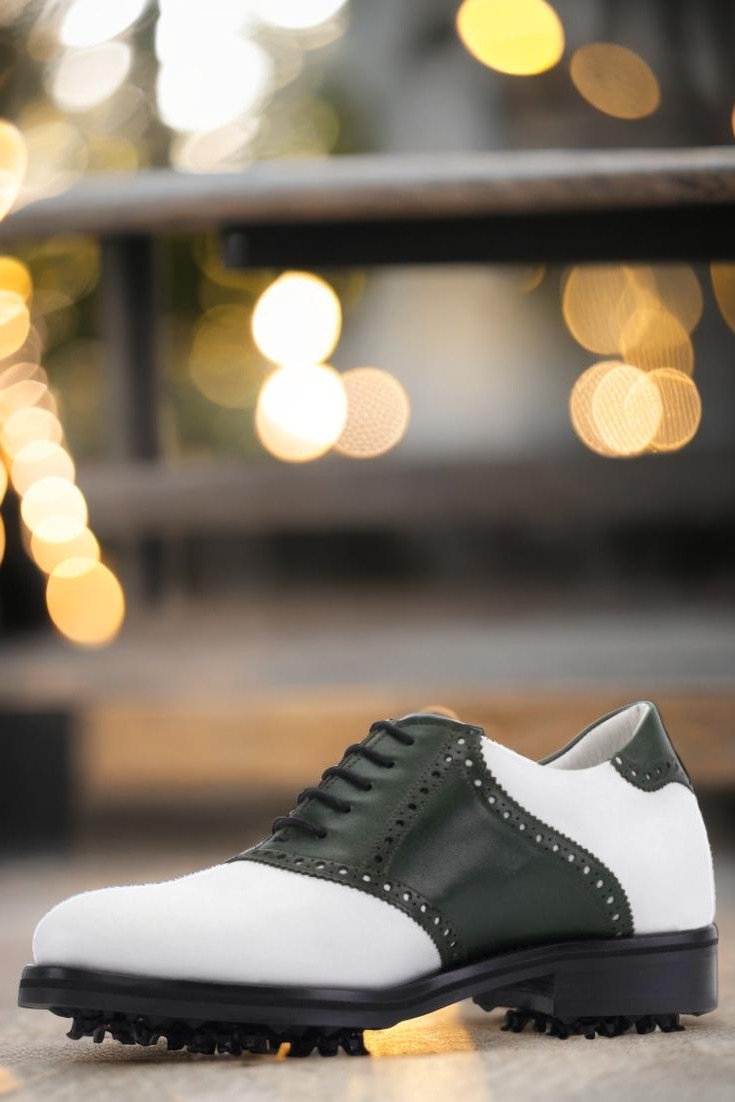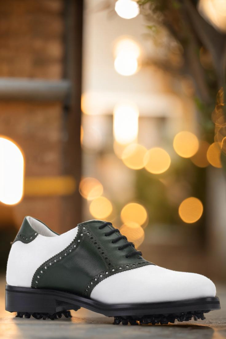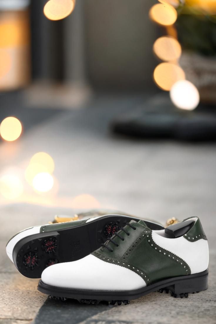 Hit the course in ultimate style and sophistication with The Lincoln Ave. Saddle Shoe No. 8291—a perfect fusion of luxury and performance. Each pair is meticulously handcrafted in Spain, showcasing exceptional craftsmanship and attention to detail. These golf shoes make a bold statement with their sleek White Luxe Calf body, complemented by striking Forest Green Luxe Calf accents on the saddle, tongue, and back. The contrast is elegant yet modern, ensuring you’ll turn heads on and off the green.