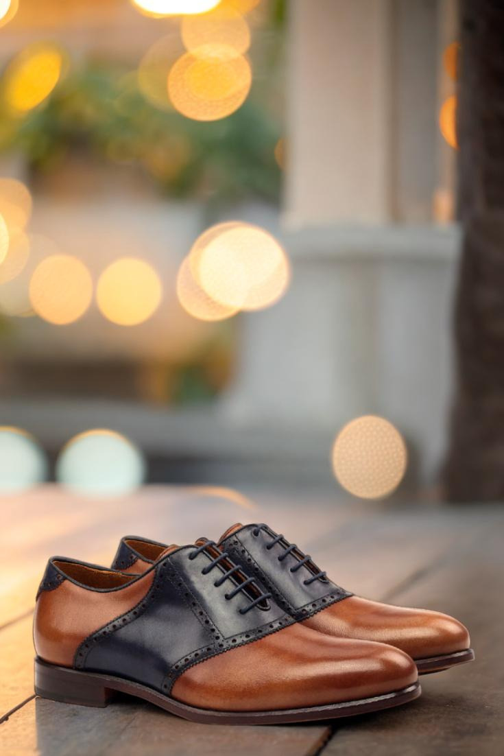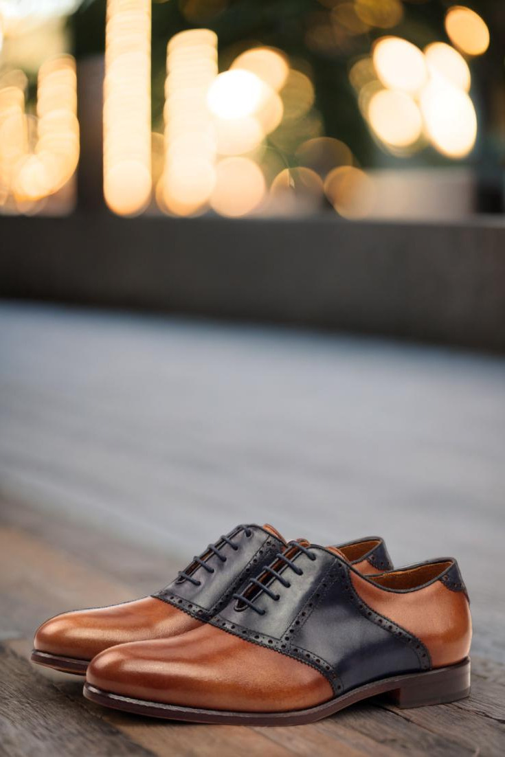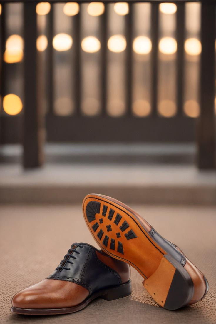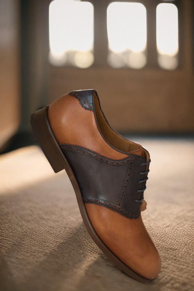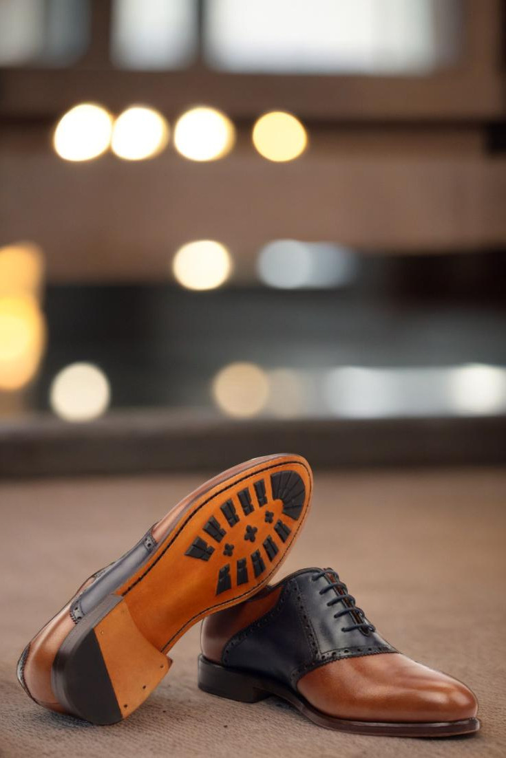 Step into timeless style with The Lincoln Ave. Saddle Shoe No. 2403 from Robert August. Crafted with meticulous attention to detail, these shoes are the epitome of sophistication and class. The front features a rich medium brown painted calf leather, while the saddle and back boast a bold navy blue hue for a striking contrast. The tongue and sides seamlessly tie the look together with their medium brown shade, creating a harmonious balance of colors.