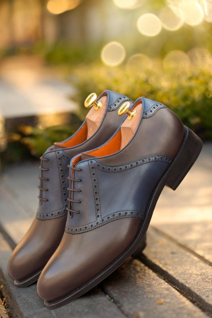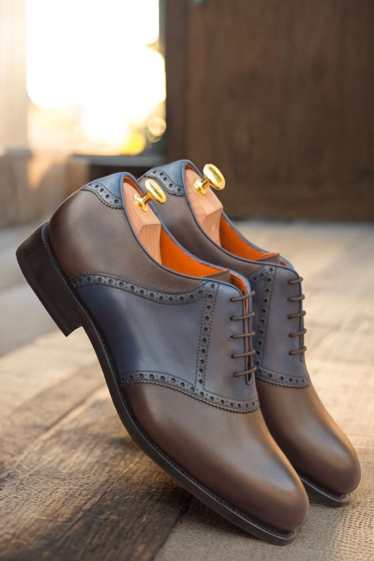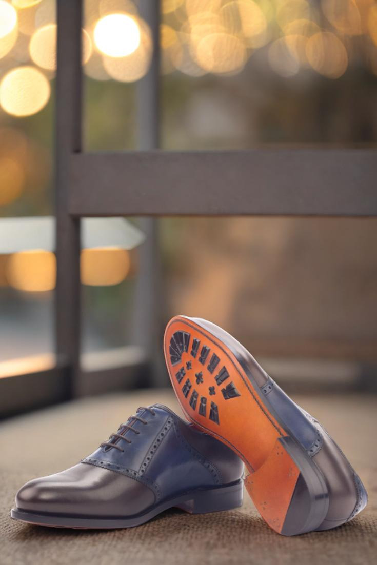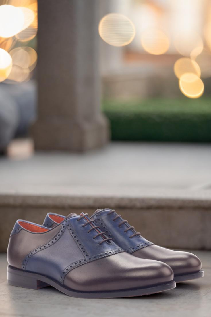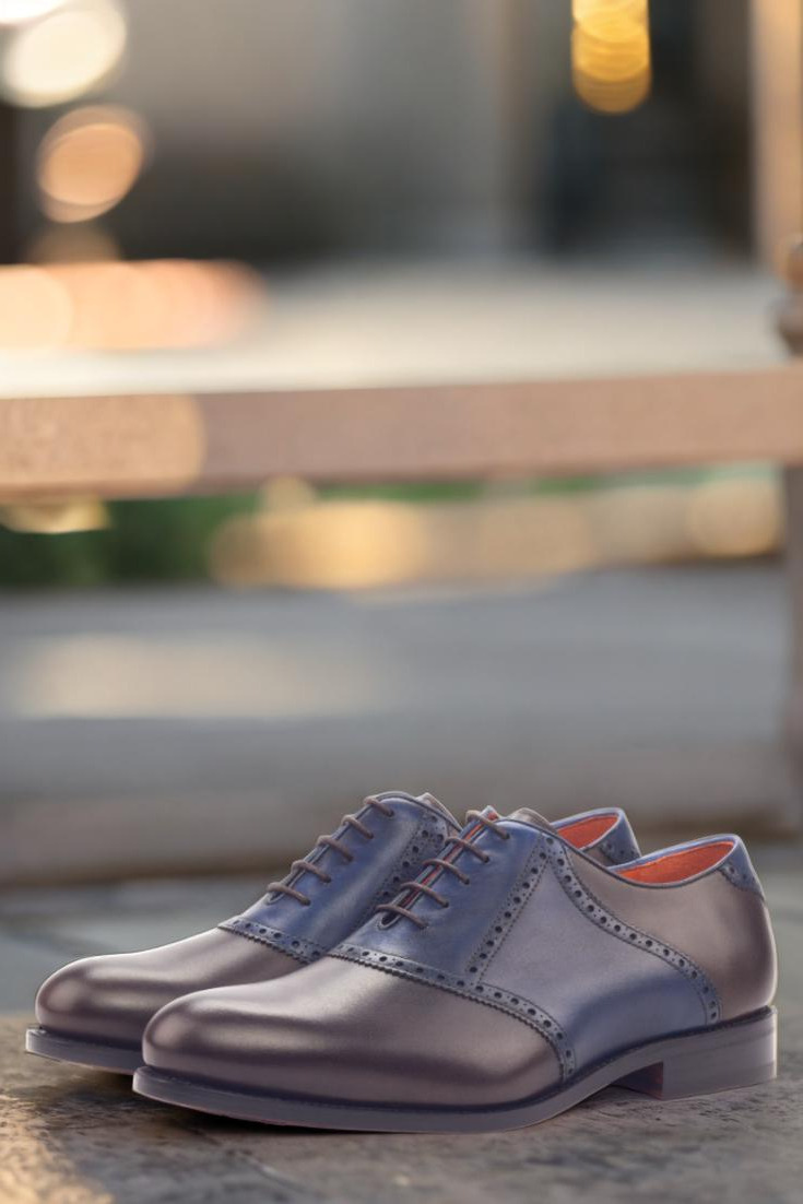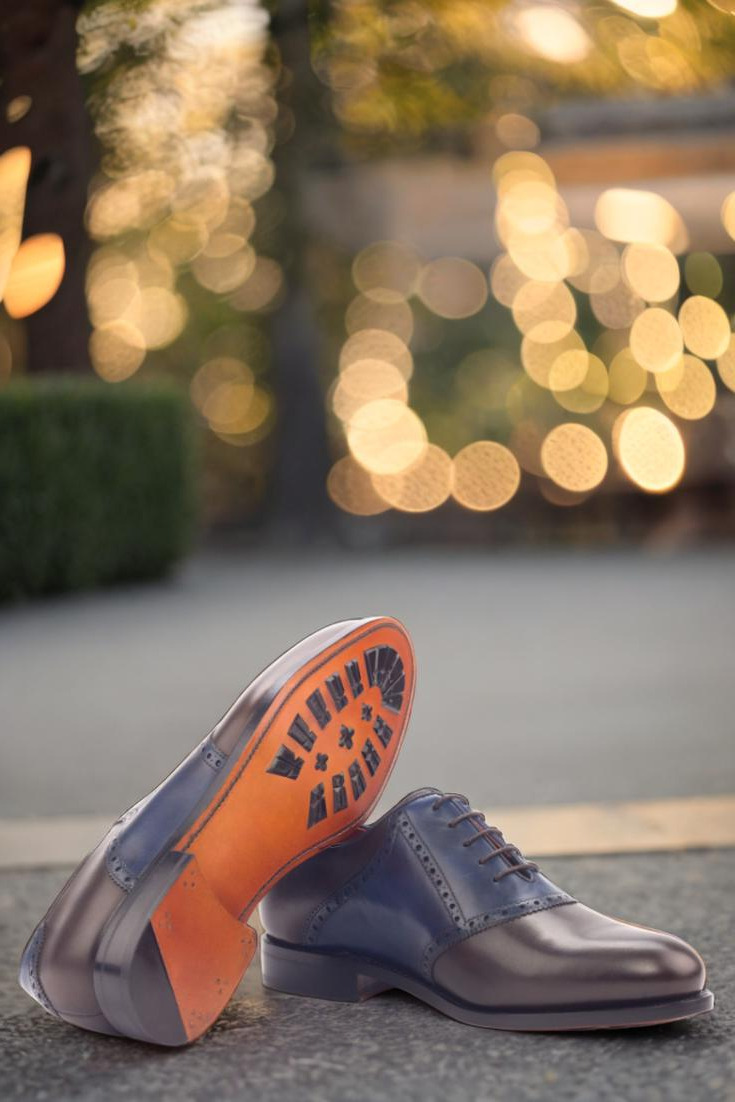 Introducing The Lincoln Ave. Saddle Shoe No. 3383 from Robert August – the perfect blend of style and craftsmanship. This shoe is meticulously handcrafted in Spain, ensuring the highest level of quality and attention to detail. The uppers are constructed with a luxurious combination of dark brown and navy blue painted calf leather, giving the shoe a unique and sophisticated look. The laces, in a rich brown color, add a touch of elegance while the orange calf leather lining provides a pop of color that is both vibrant and classy.
