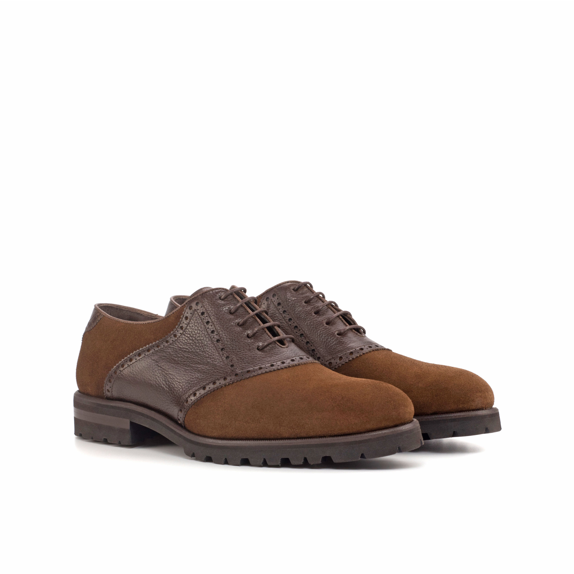 The front of the shoe features a striking medium brown luxe suede, giving it a sleek and sophisticated look. Moving towards the saddle, you’ll find dark brown full grain leather that adds a touch of richness and texture to the design. The tongue and back also boast this luxurious full grain leather, completing the timeless saddle shoe aesthetic.