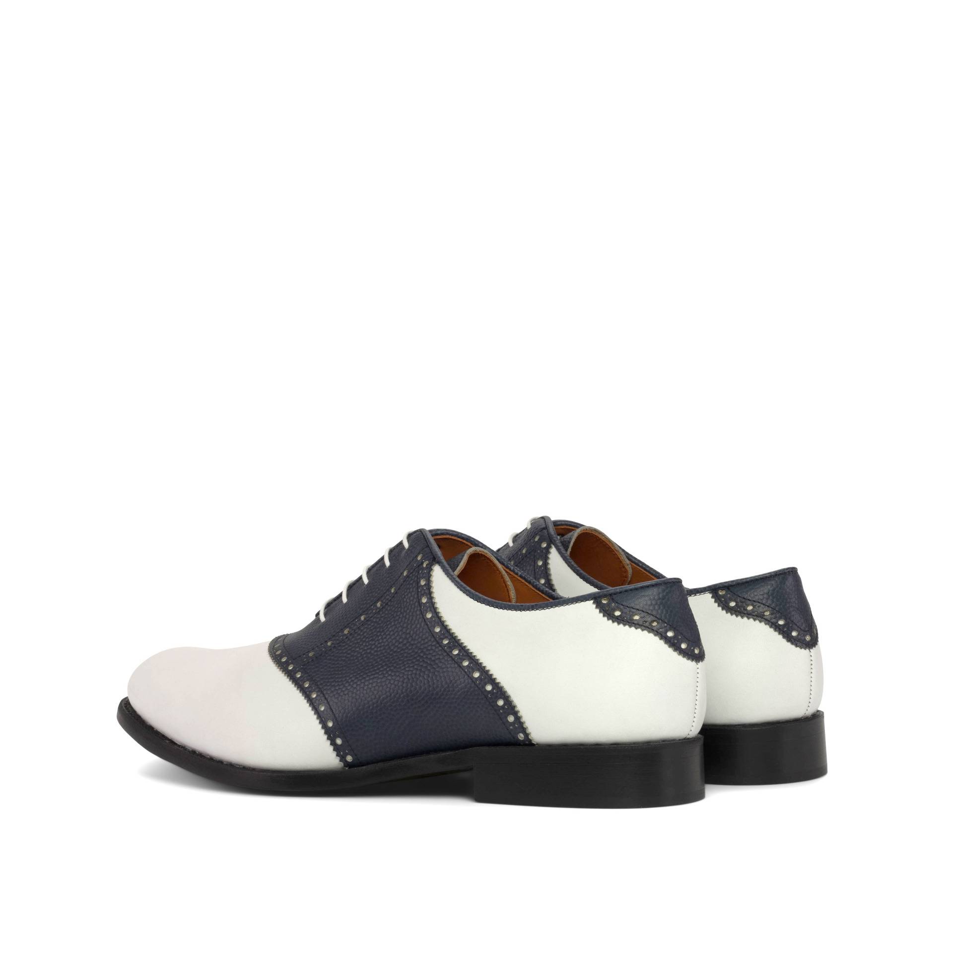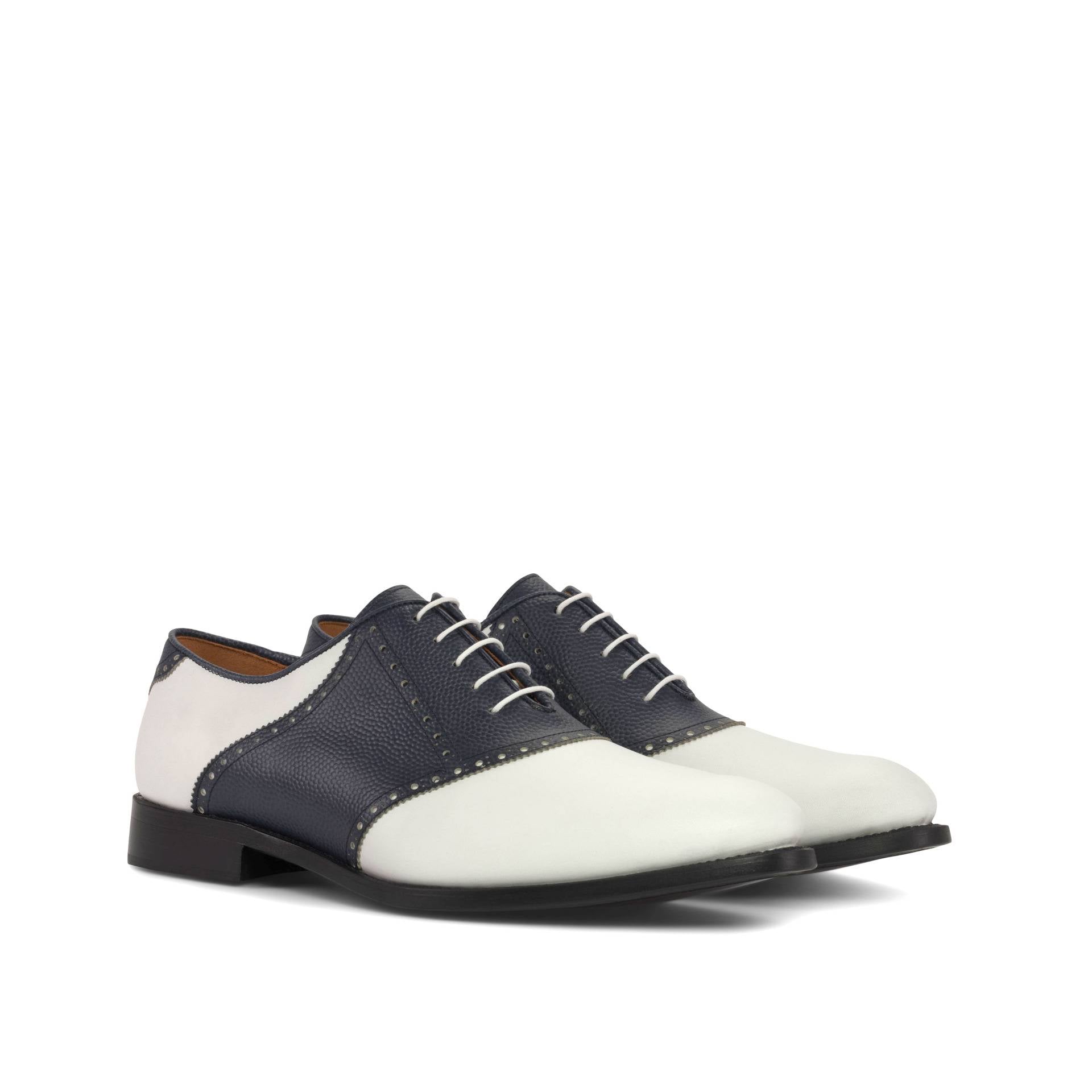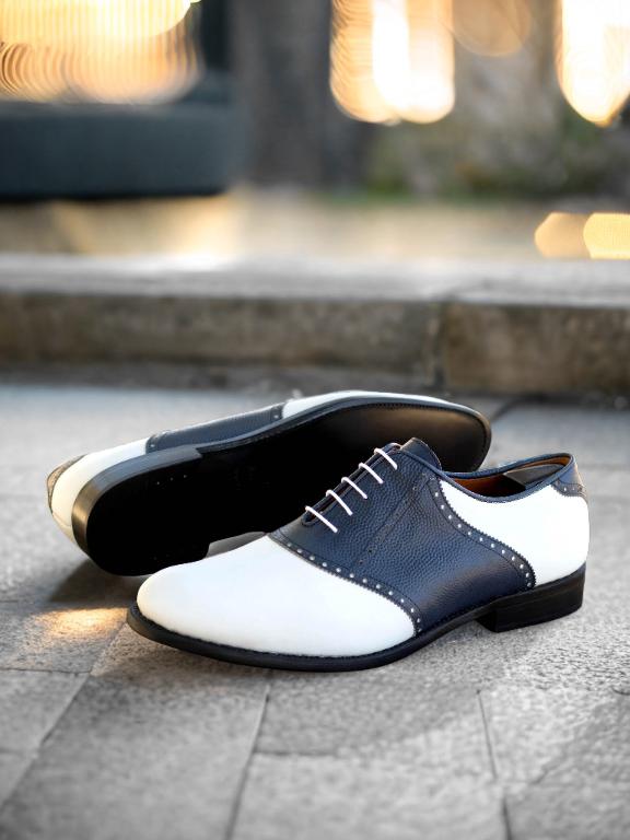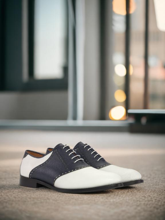 The front of the shoe boasts of luxurious white box calf leather, exuding elegance and refinement. The saddle, tongue, and back feature a deep navy blue pebble grain leather, adding a touch of boldness and uniqueness to the design. As your eyes trace down the sides, you will notice the continuation of the white box calf leather, creating a seamless flow and a striking contrast.