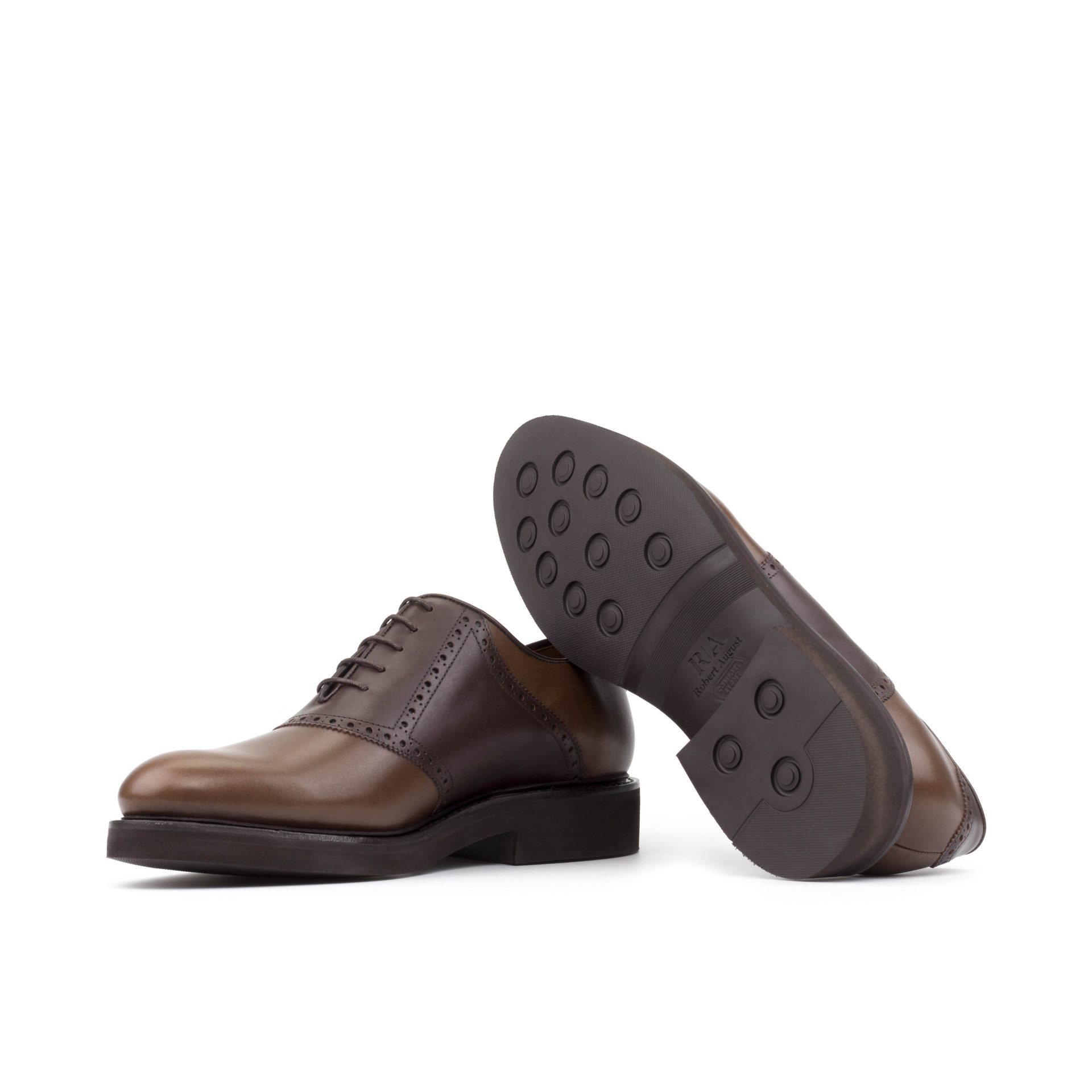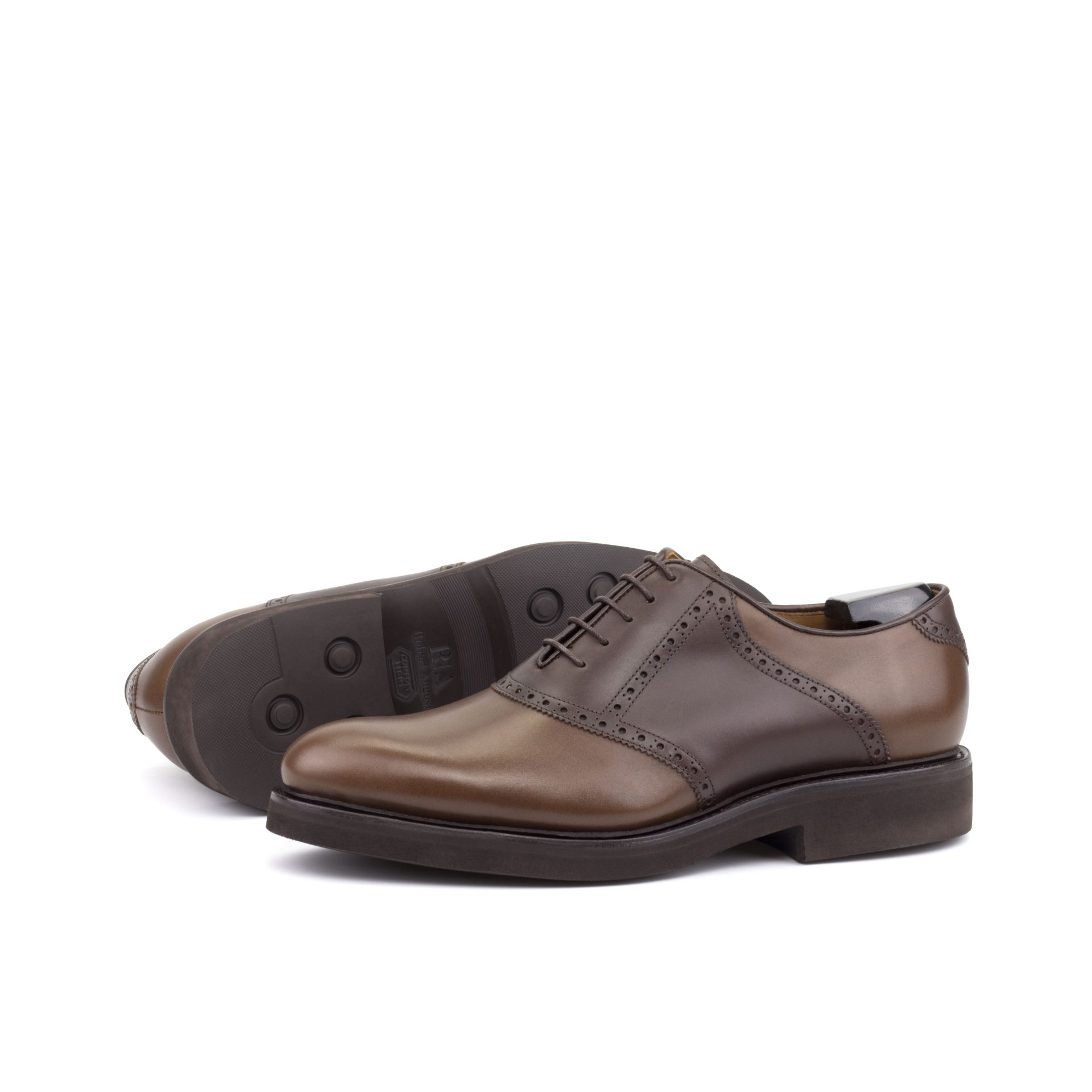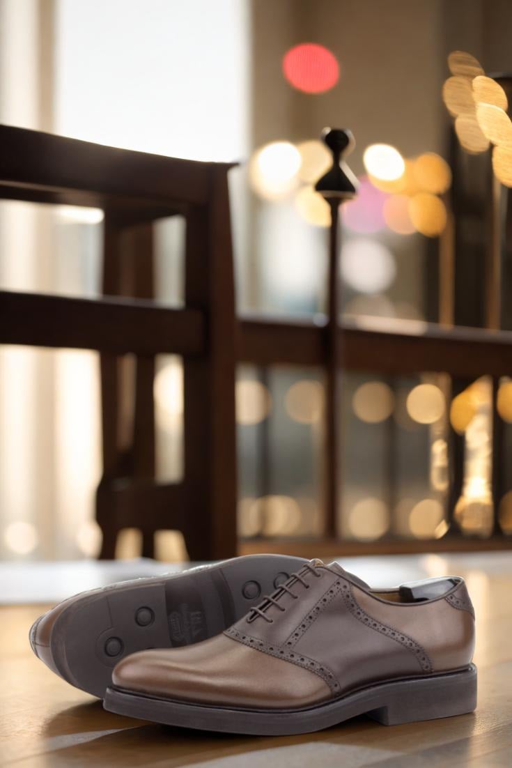 The front, saddle, side, and back of the shoe are made with luxurious hickory brown and dark brown luxe calf leather, exuding an air of sophistication and elegance. The laces are made with round, brown leather, adding to the overall polished look of the shoe.