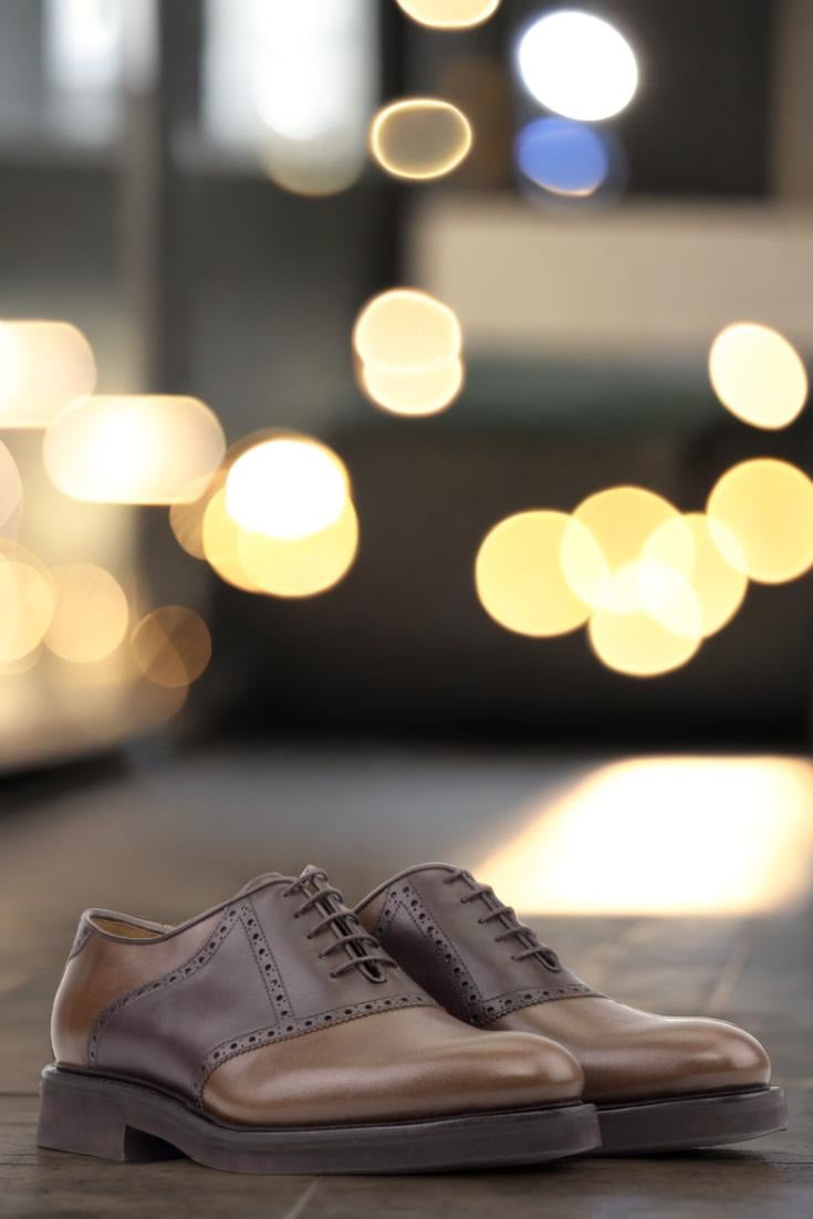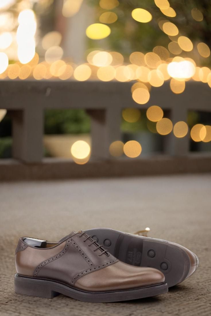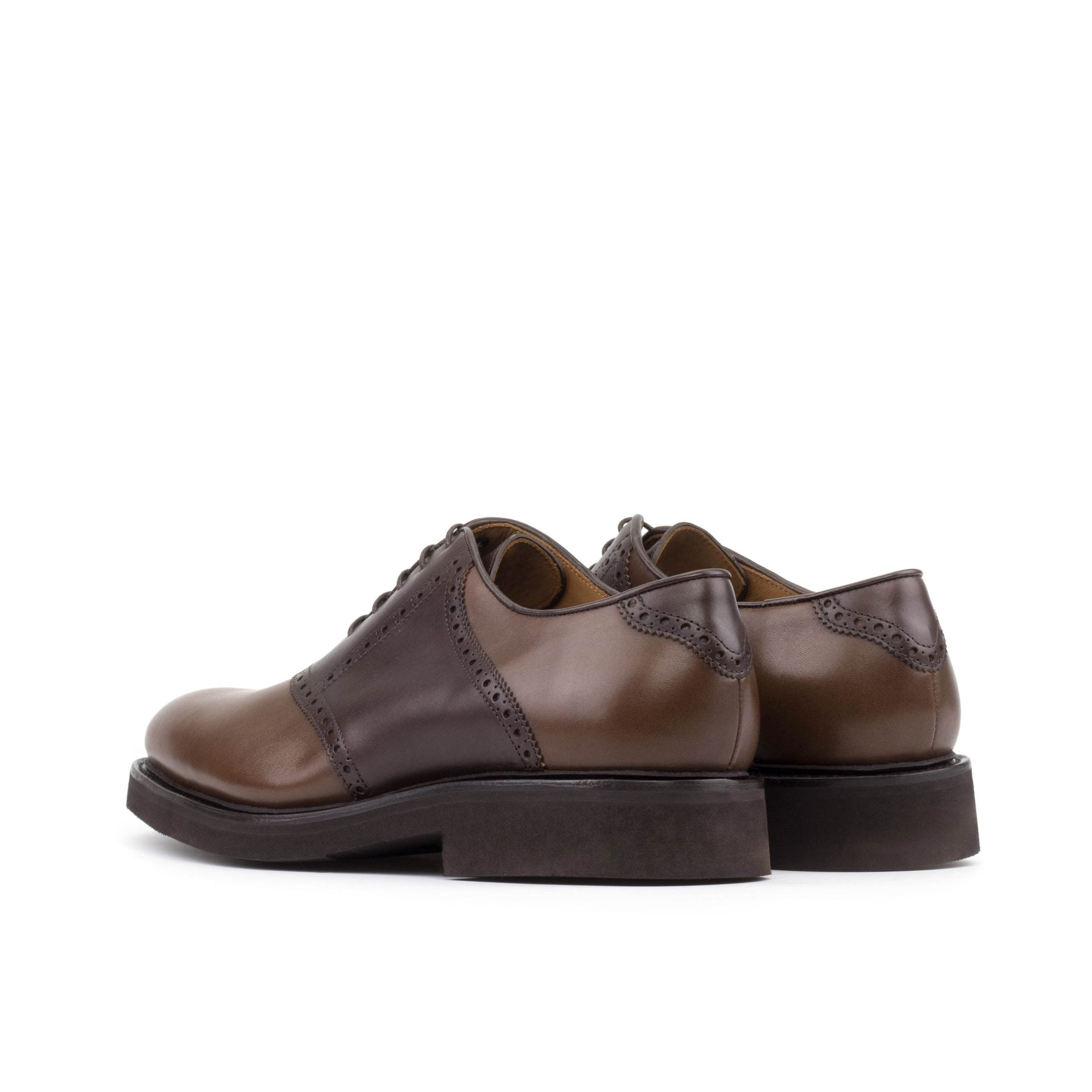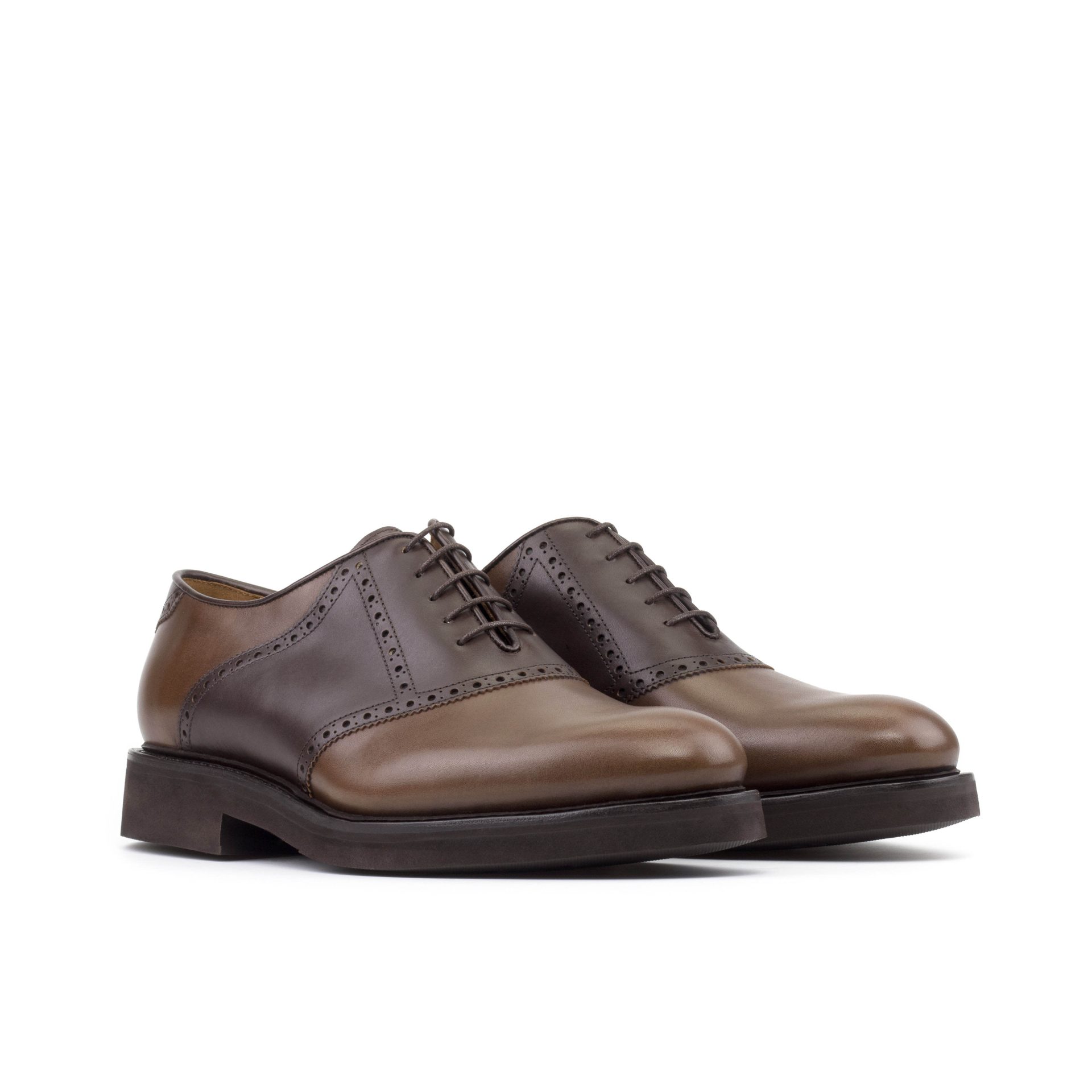The front, saddle, side, and back of the shoe are made with luxurious hickory brown and dark brown luxe calf leather, exuding an air of sophistication and elegance. The laces are made with round, brown leather, adding to the overall polished look of the shoe.