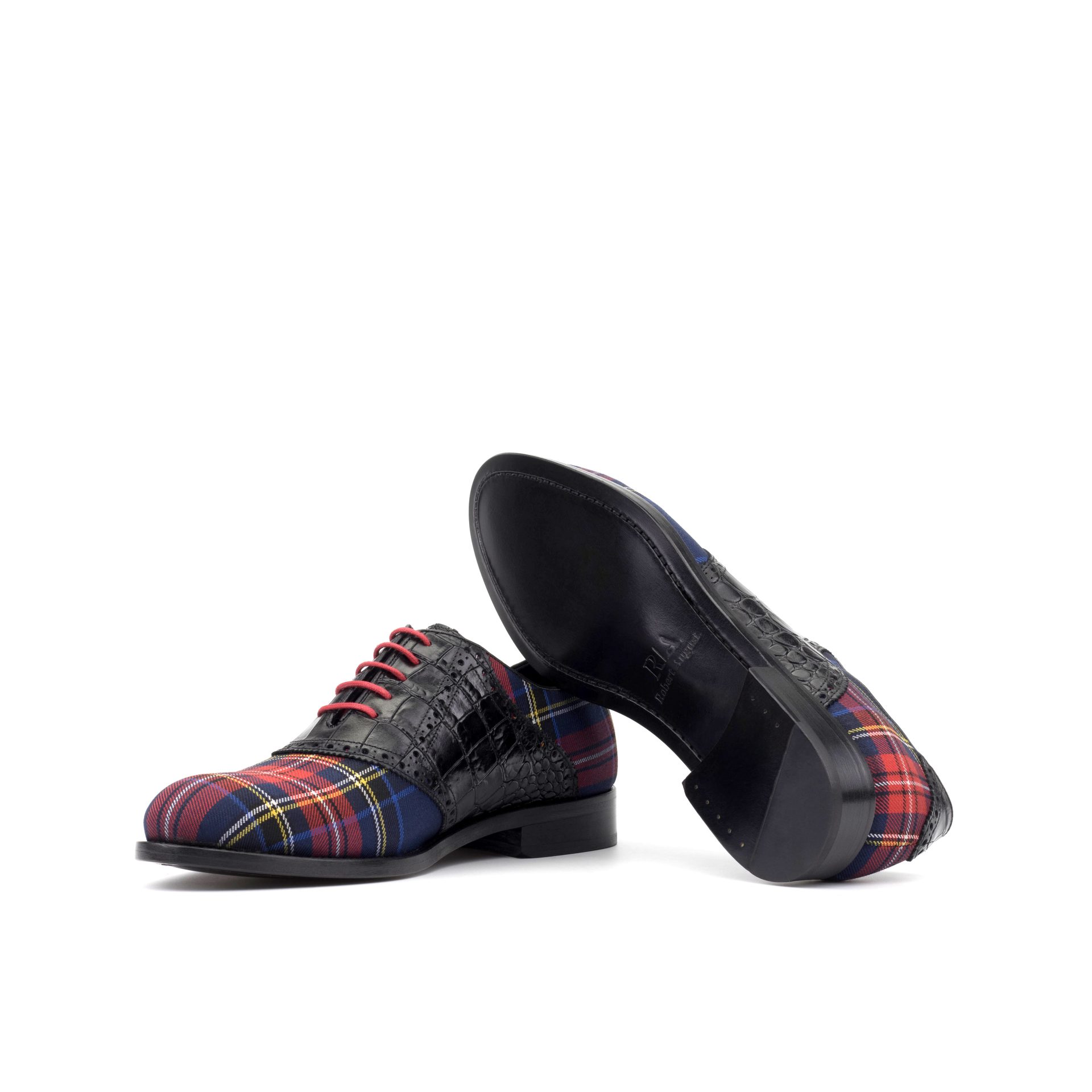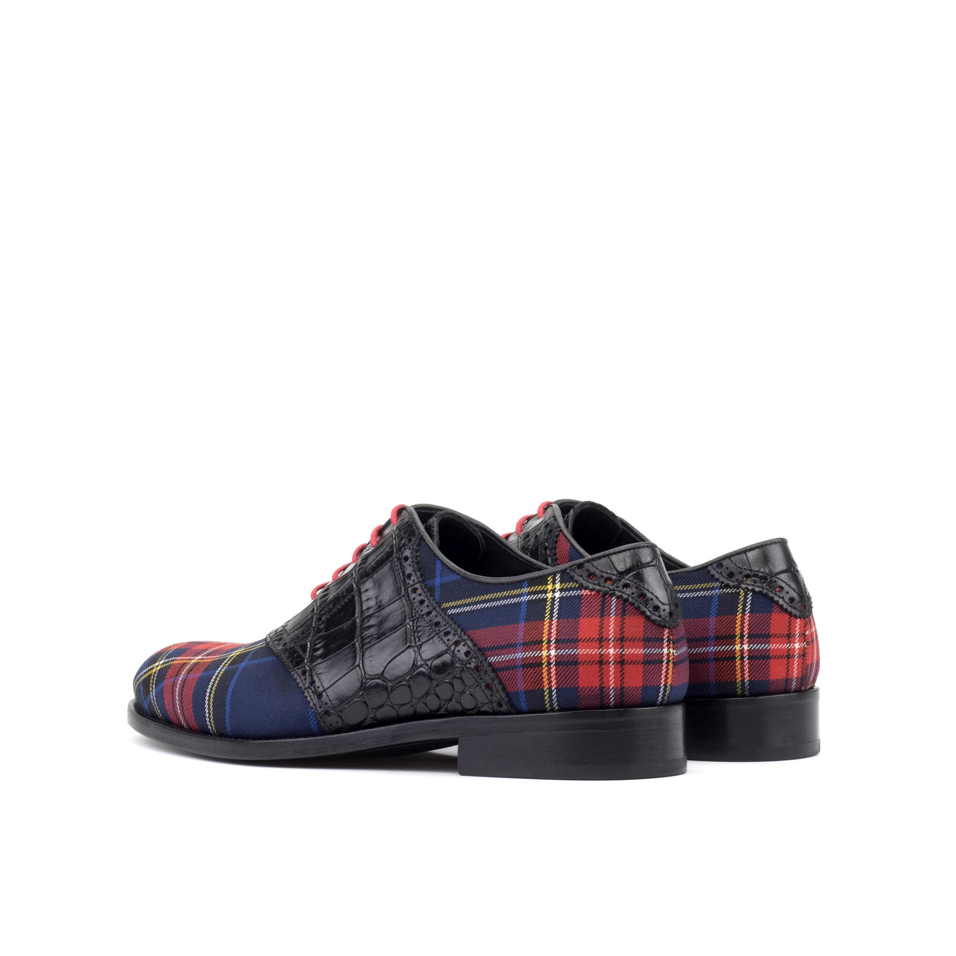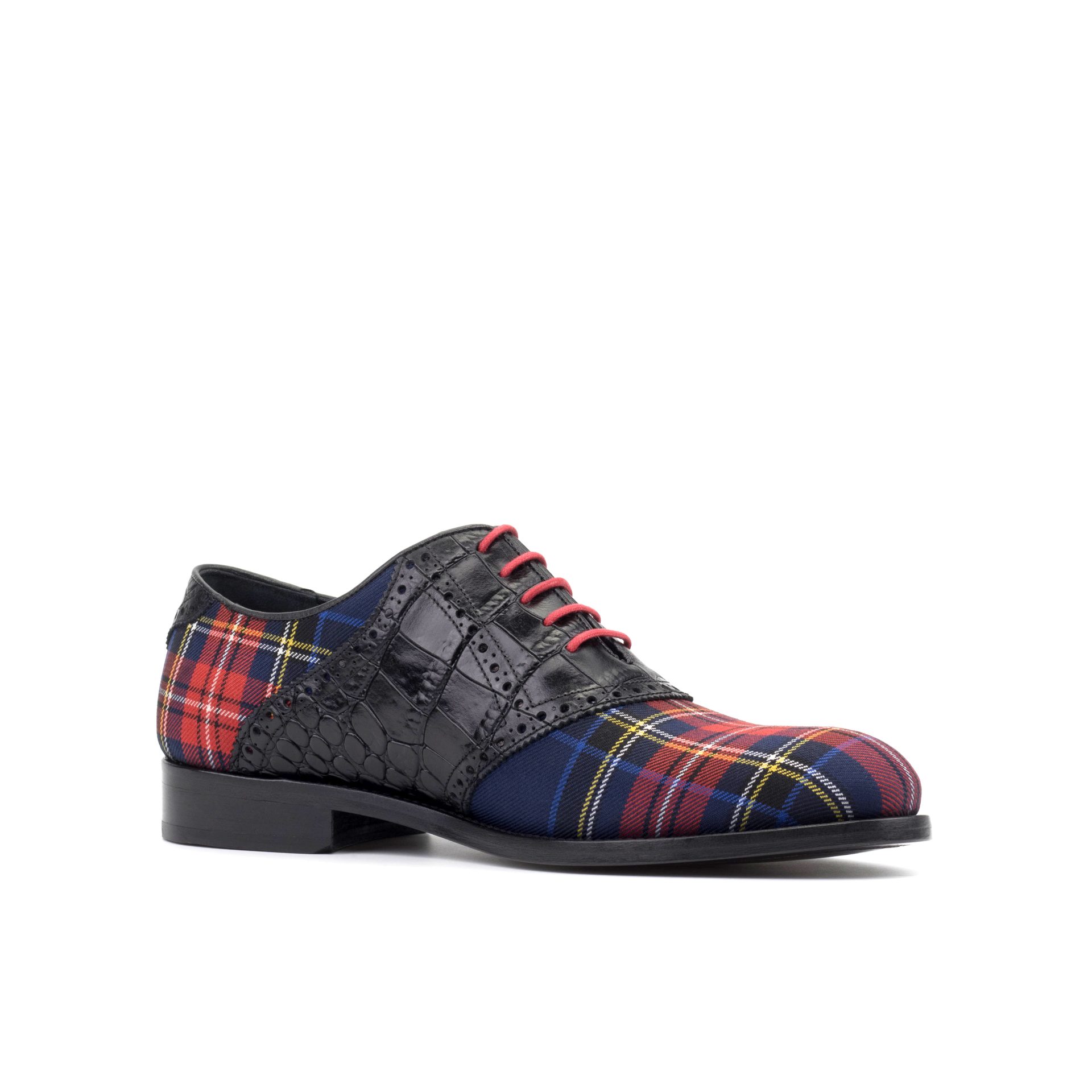 Attention to detail is evident throughout the construction. The design features Round-Red laces that complement the tartan wool, creating a cohesive and polished look. Inside, the shoe is fully lined with soft Black Calf Leather, ensuring a comfortable fit and a smooth feel against the foot, suitable for all-day wear.