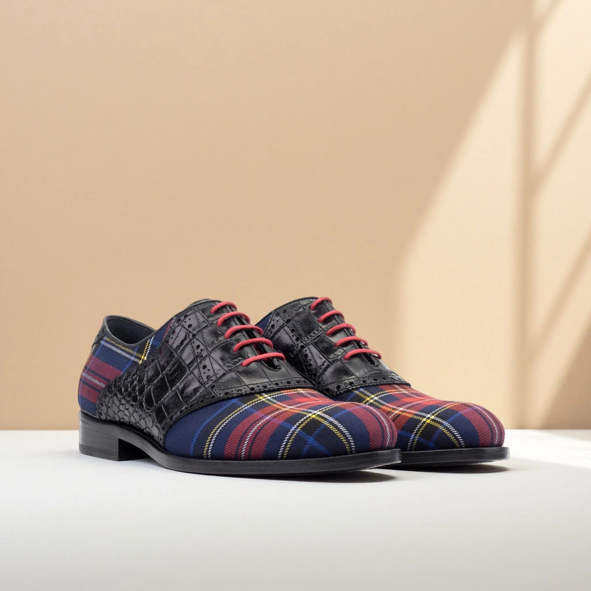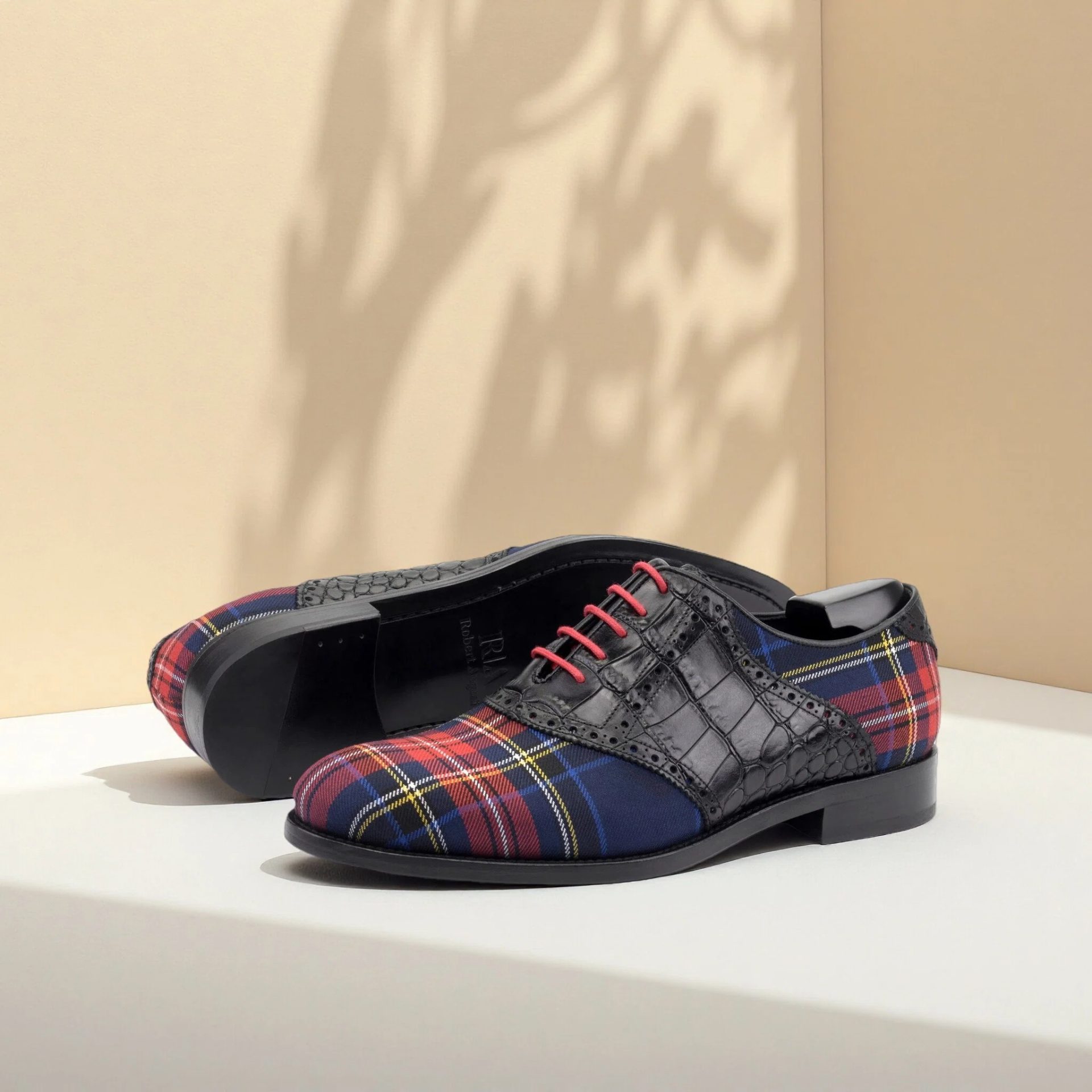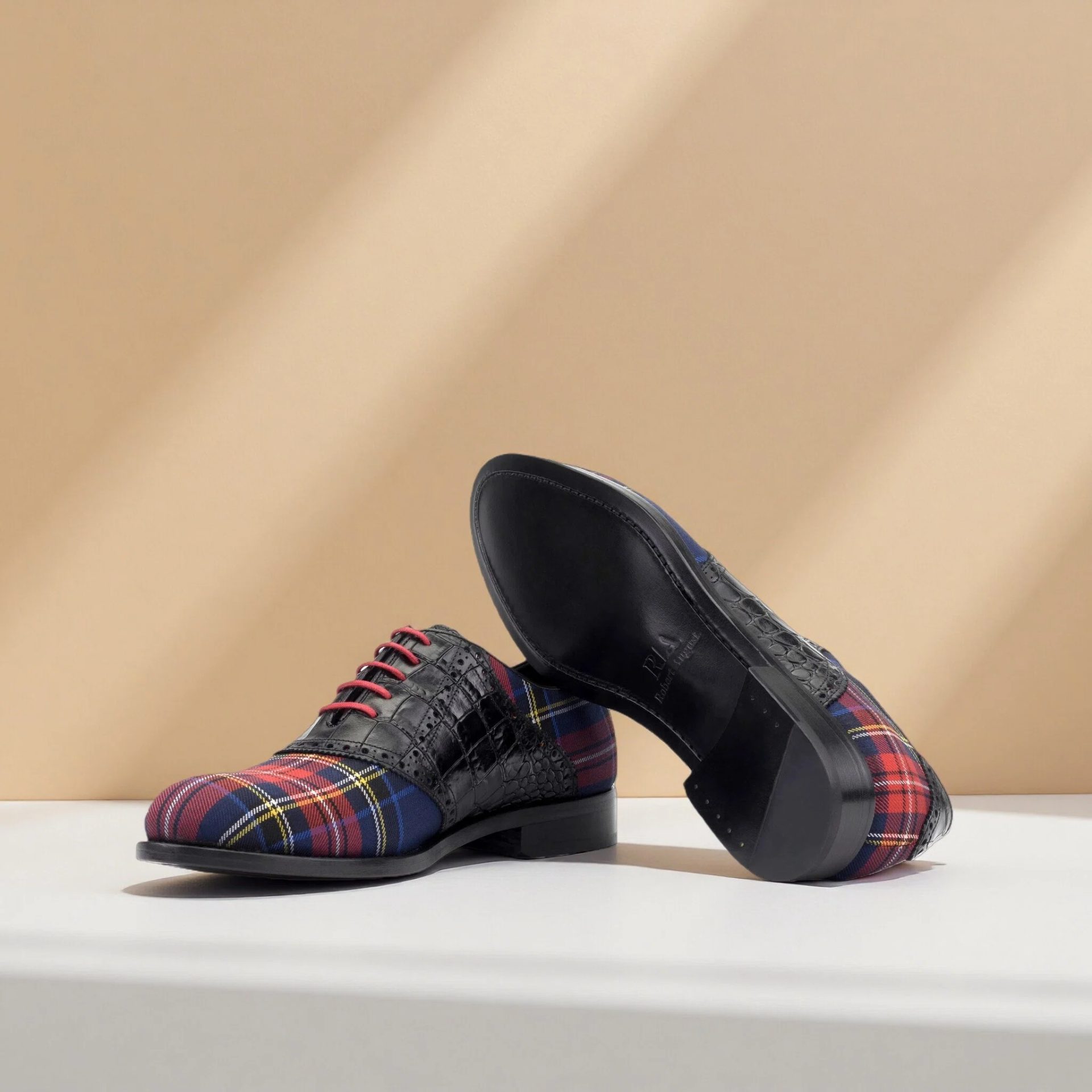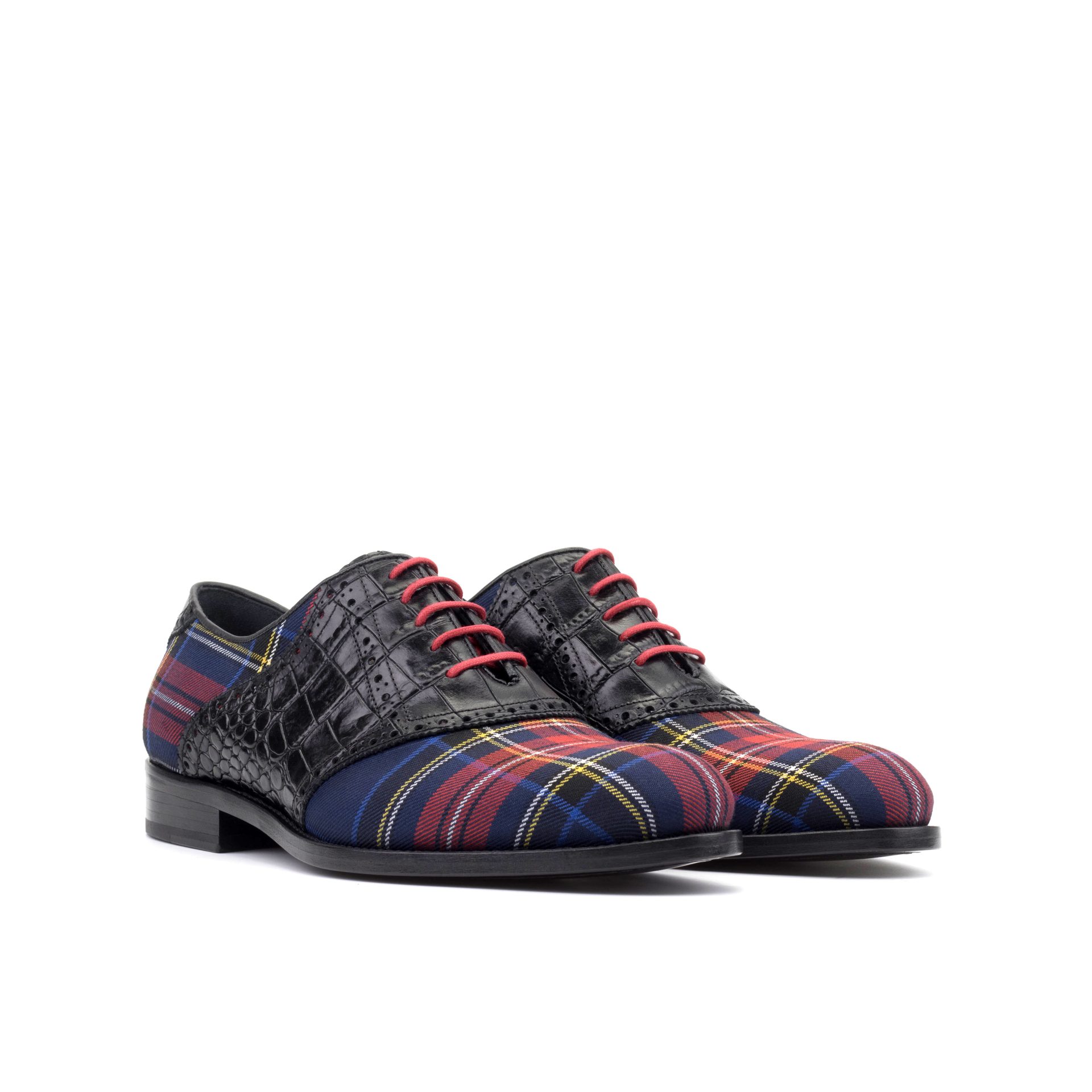Attention to detail is evident throughout the construction. The design features Round-Red laces that complement the tartan wool, creating a cohesive and polished look. Inside, the shoe is fully lined with soft Black Calf Leather, ensuring a comfortable fit and a smooth feel against the foot, suitable for all-day wear.