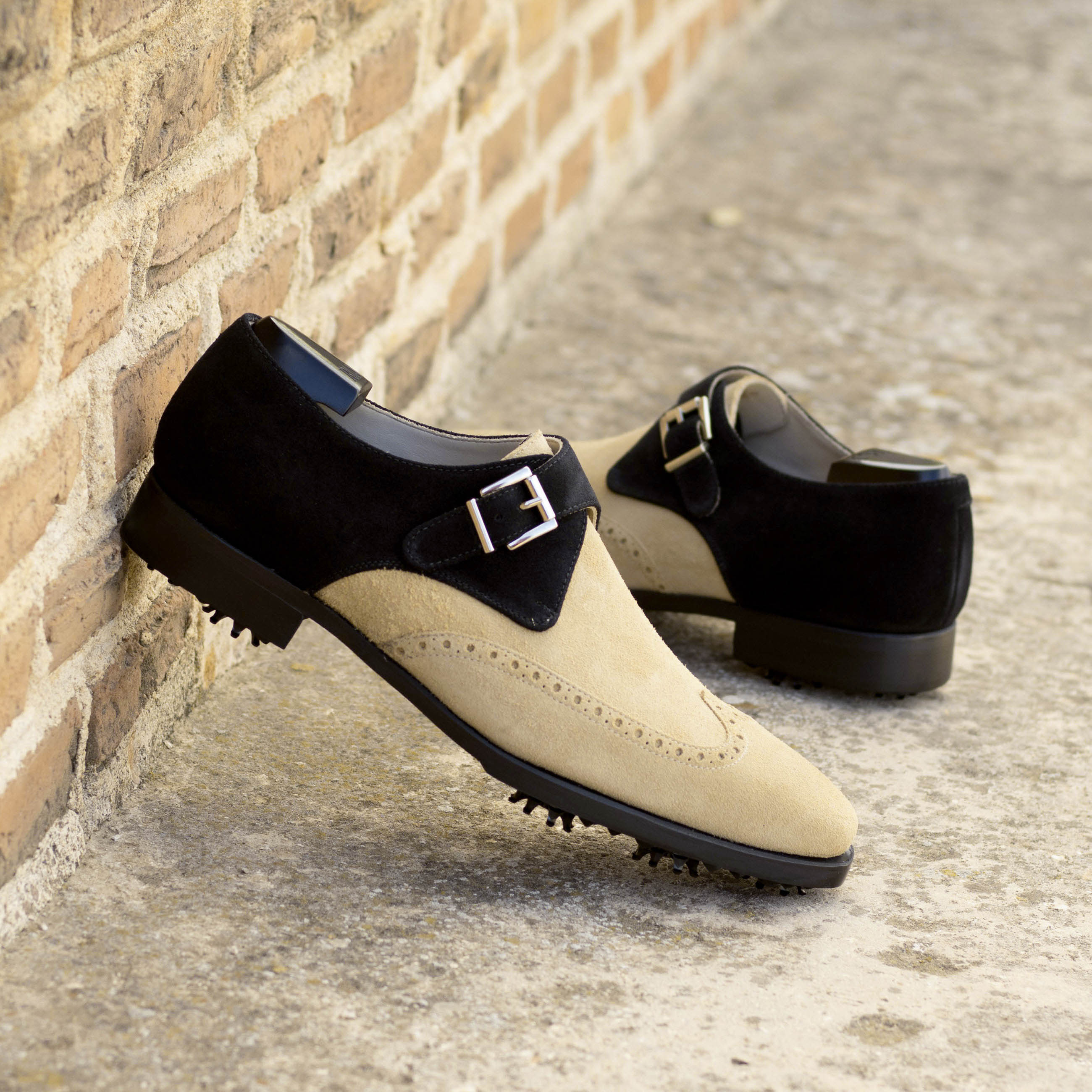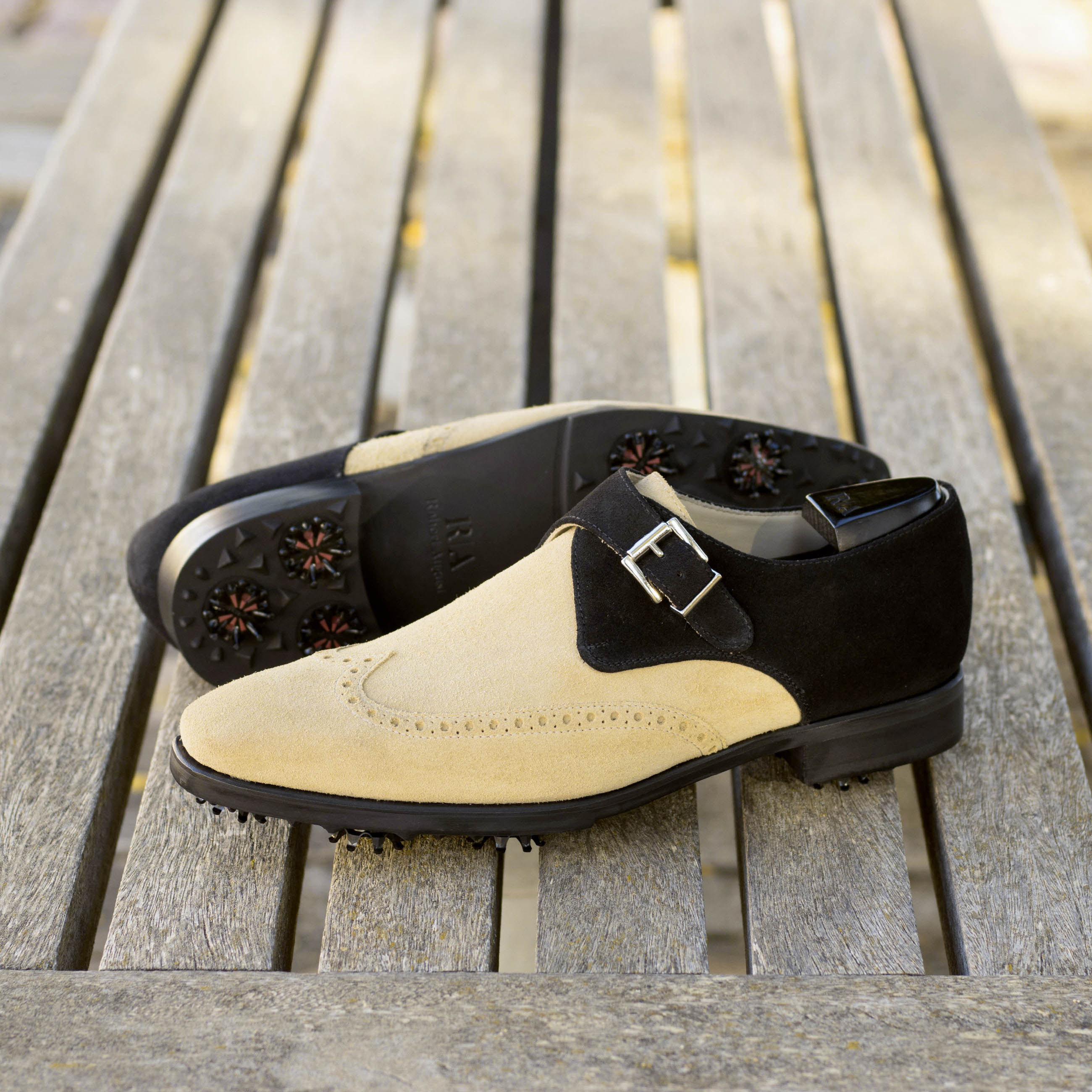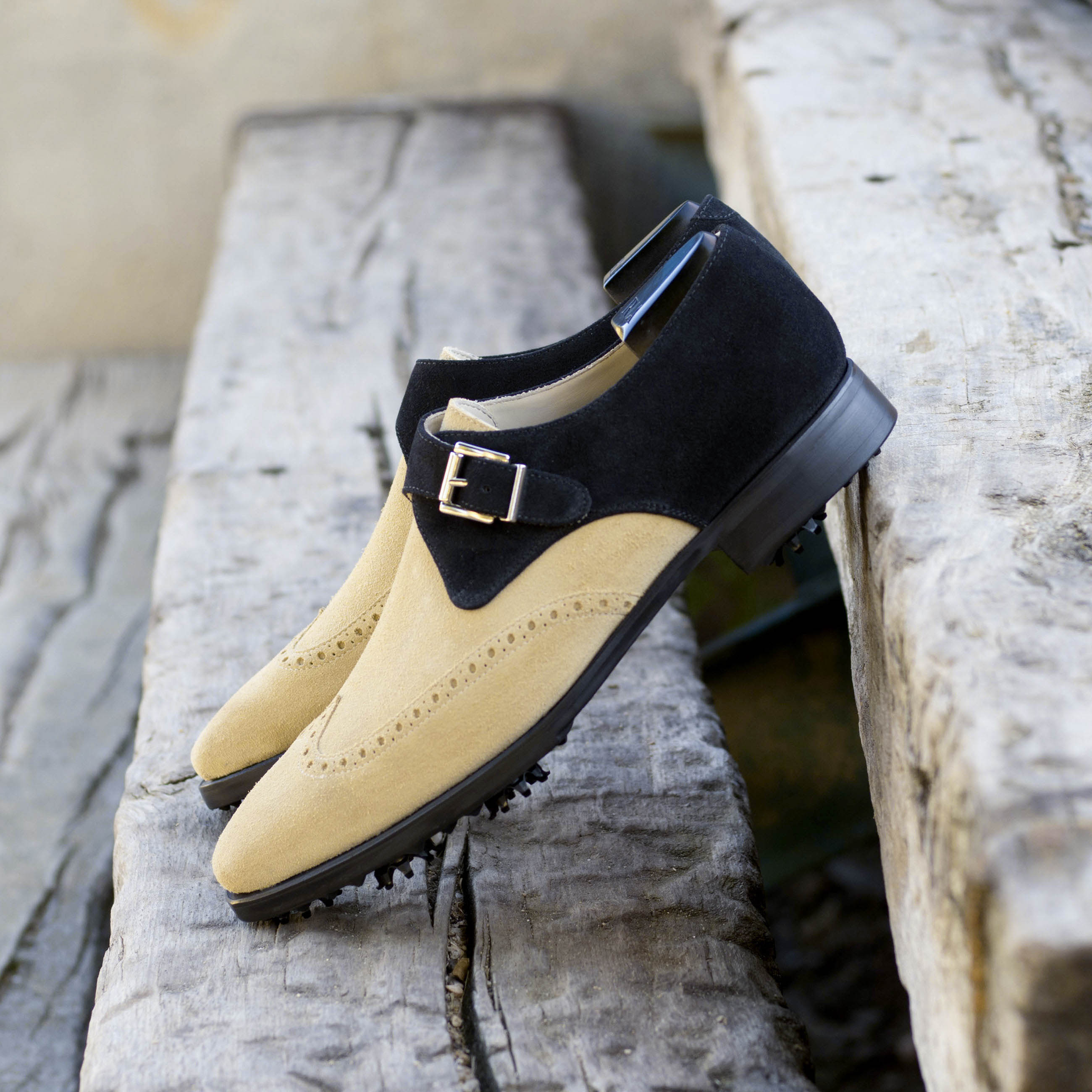 Introducing the Cicero Ave. Single Monk No. 8040 golf shoe, a luxurious addition to your wardrobe that will take your game to new heights! Crafted from only the finest leather and suede materials, these shoes look and feel amazing no matter where the fairway leads you. The sand luxe suede wingtip and vamp provide an elegant contrast with the black luxe suede quarters. Shining squared-nickel buckles encase beige calf leather lining for added fit and comfort as you master any course. Even better, the Softspikes® cleats offer superior traction for secure footing on any terrain – making sure you maintain control during every swing of your club! The Cicero Ave. Single Monk No. 8040 is modern luxury at its finest – so don’t go one more hole without it!