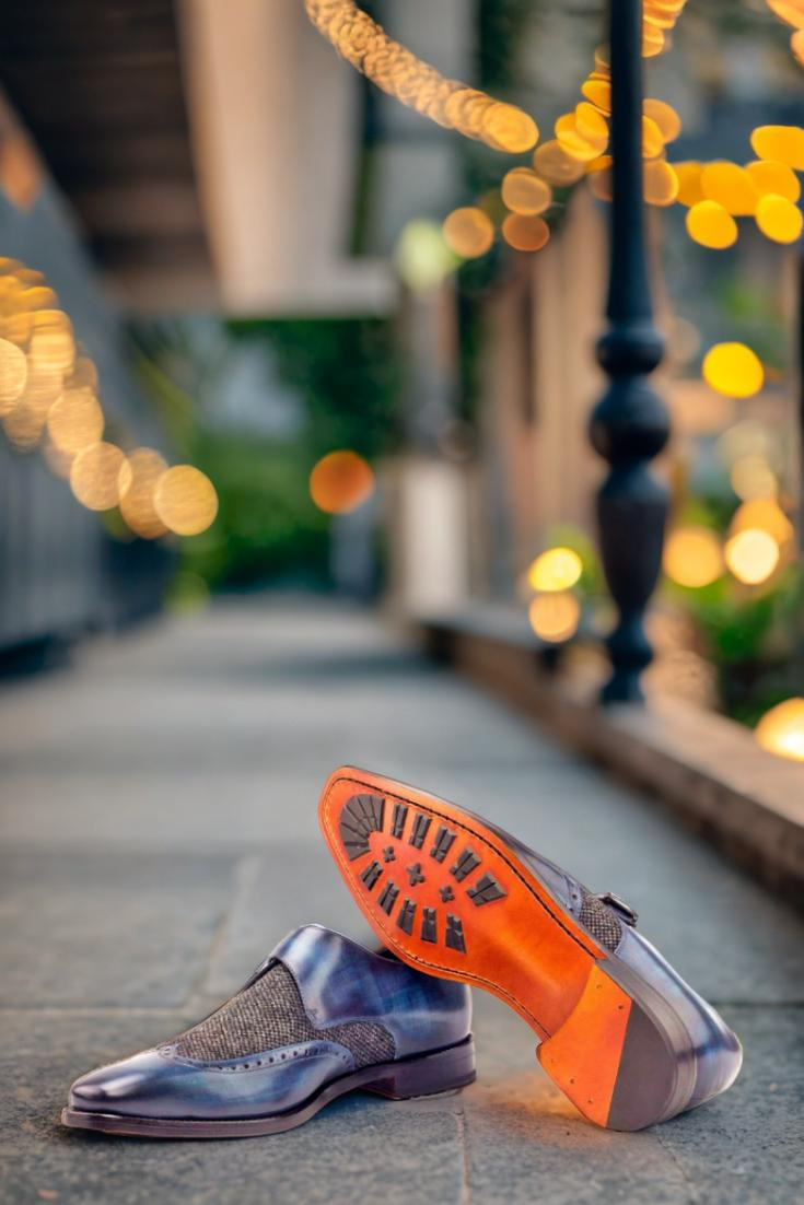 The uppers are made from luxurious Italian calf leather, giving them a sleek and polished appearance. But what sets them apart is the unique Denim Blue hand patina, giving them a touch of urban edge. And let’s not forget the subtle Wool Nailhead detailing, adding a touch of texture and visual interest.