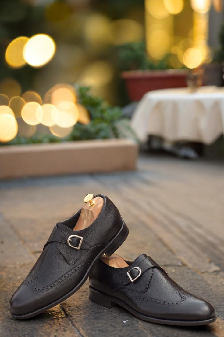 The Wingtip, Vamp, Inner and Outer Quarter are all made with the finest, black painted full grain leather, giving the shoe a sleek and luxurious appearance. The buckles, rounded-nickel in color, add a touch of sophistication to the design.