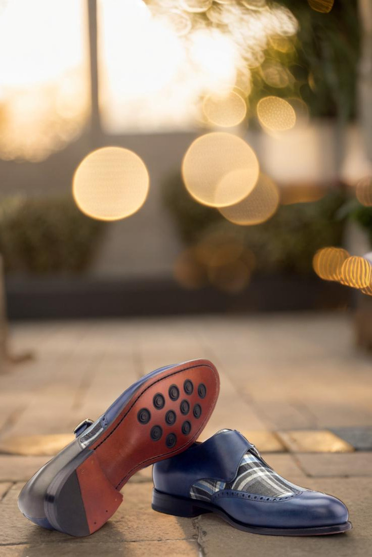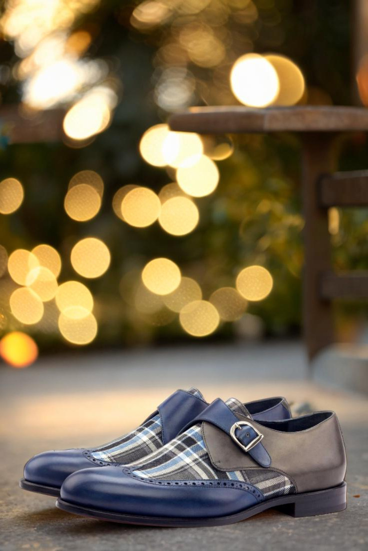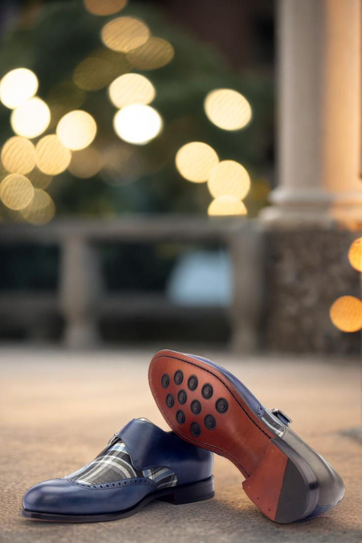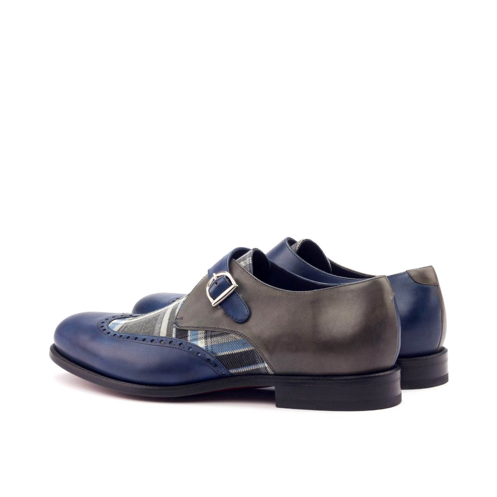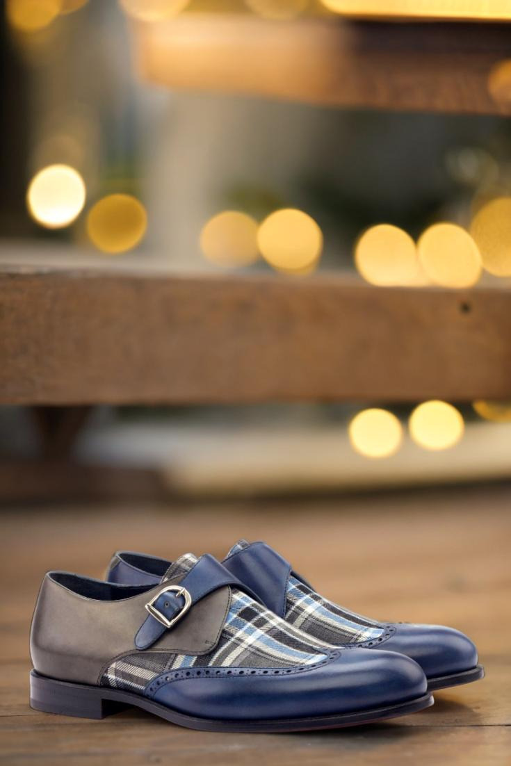 The navy blue painted calf wingtip adds a touch of modern flair, while the blue/grey plaid wool vamp brings a classic, heritage-inspired feel. The inner quarter in navy blue painted calf complements the outer quarter in grey painted calf, creating a harmonious blend of colors and textures.