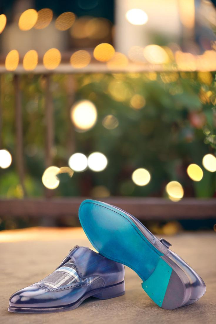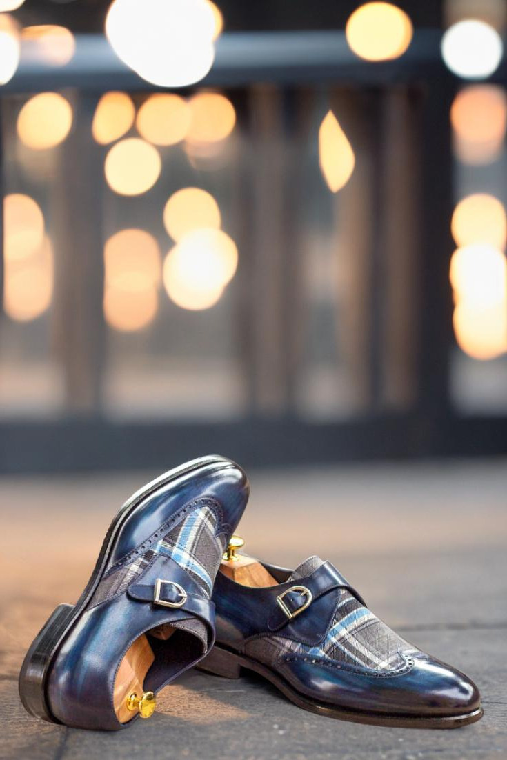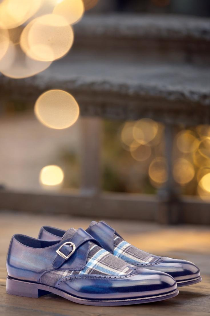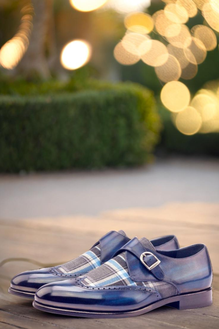 Step out in style and make a statement like no other with The Cicero Ave. Single Monk No. 3006 from Robert August. Crafted with the finest Italian Calf Leather and featuring a unique Denim Blue Original Hand Patina, these shoes are a true work of art for your feet. The wingtip design adds a touch of sophistication, while the Blue/Grey Plaid Wool vamp brings a pop of color and texture that will have heads turning everywhere you go.