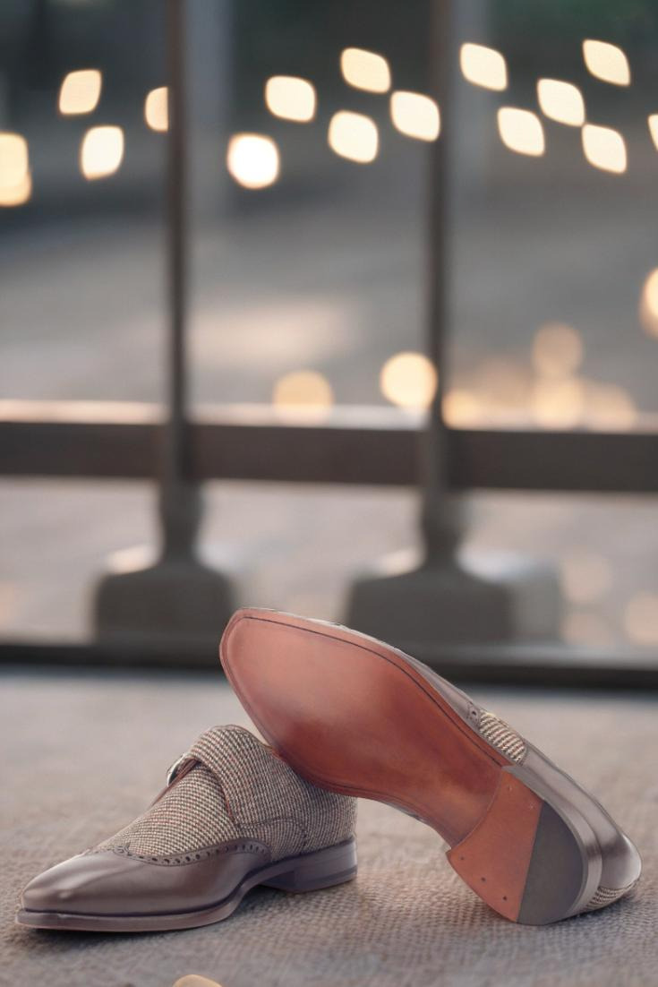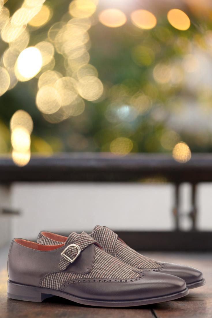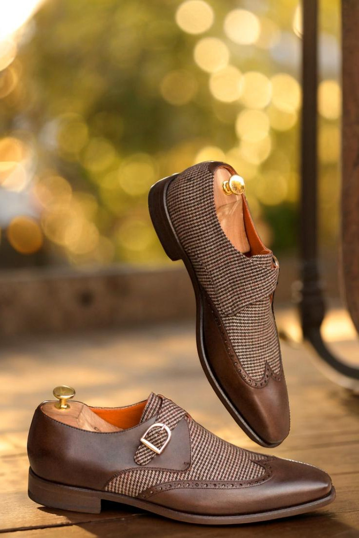 Step into style and sophistication with The Cicero Ave. Single Monk No. 3008 from Robert August. This exquisite shoe features a stunning combination of dark brown painted calf leather and small brown tweed wool, creating a unique and eye-catching design that is sure to turn heads. The wingtip detail adds a touch of classic elegance, while the rounded gold buckles provide a modern twist.