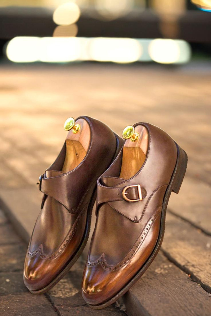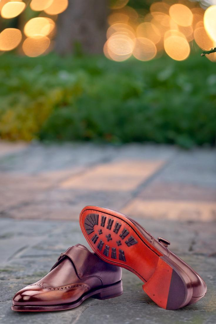 Step into luxury and sophistication with The Cicero Ave. Single Monk No. 3011 from Robert August. Crafted with the finest Italian calf leather boasting a beautiful brown hand patina, this wingtip shoe exudes elegance and class. The dark brown painted calf leather on the vamp, inner quarter, and outer quarter add depth and richness to the design.