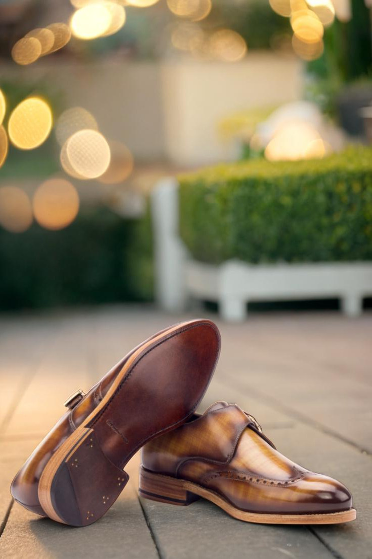 The uppers of the Cicero Ave. Single Monk are made from luxurious Italian Calf Leather with a stunning Cognac Hand Patina. This unique patina, known as Papiro, adds a subtle yet eye-catching texture to the shoe, making it stand out in any crowd. The rounded-gold buckles add a touch of charm and sophistication to the overall design, elevating it from a standard monk shoe to a true statement piece.