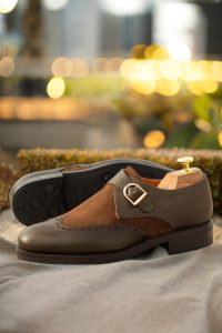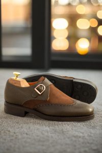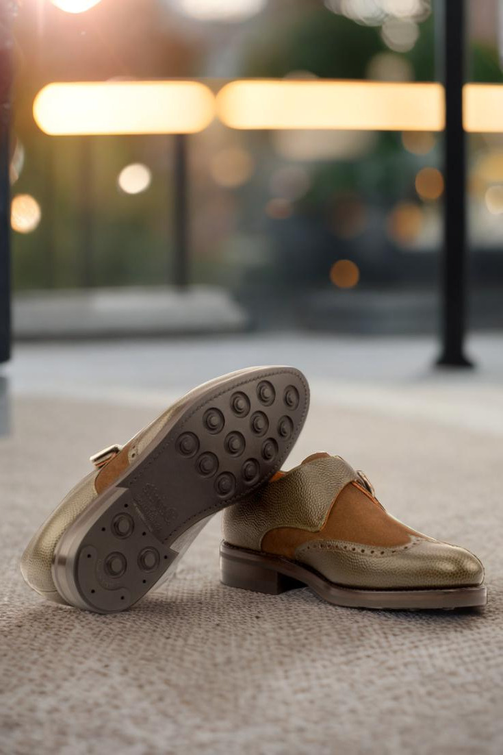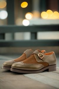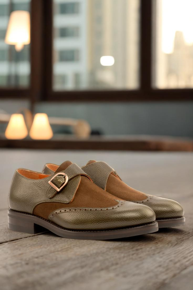 Introducing the Cicero Ave. Single Monk No. 4022 from Robert August, the epitome of sophistication and style. Handcrafted in Spain with precision and care, this shoe exudes elegance and class in every step. The uppers are made from a unique combination of olive pebble grain leather and medium brown luxe suede, creating a rich and luxurious texture that is both eye-catching and timeless.