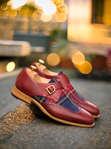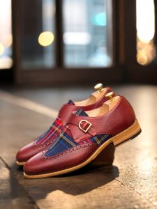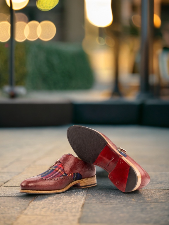 Featuring uppers made of red pebble grain leather and red tartan, this shoe is a unique blend of textures that will make heads turn. The rounded-gold buckles add a touch of elegance, while the beige calf leather lining ensures comfort with every step.
