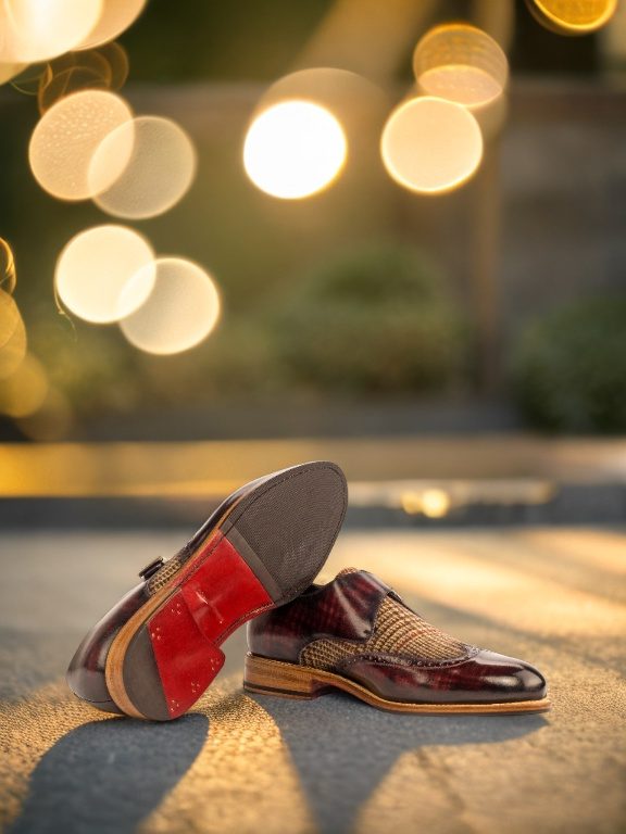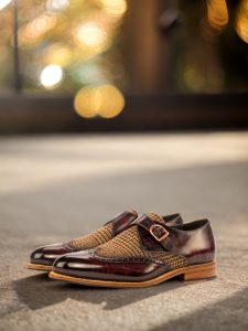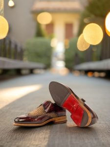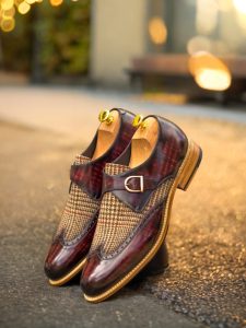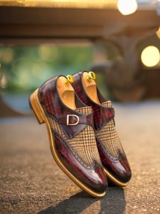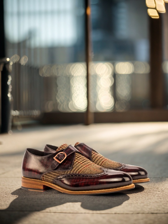 The uppers are made from luxurious Italian Calf Leather, giving the shoe a timeless and polished look. But what truly sets this shoe apart is the hand patina in deep burgundy with hints of tweed, adding a touch of rugged charm to the overall design. It’s the perfect combination of rugged and refined, making it versatile enough to dress up a suit or dress down with a pair of jeans.