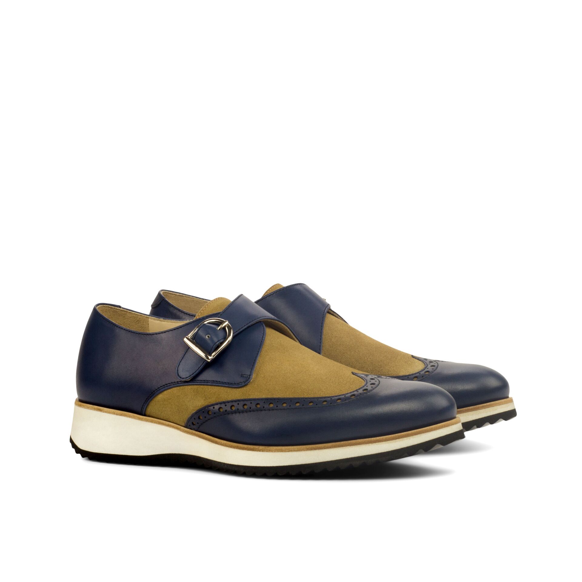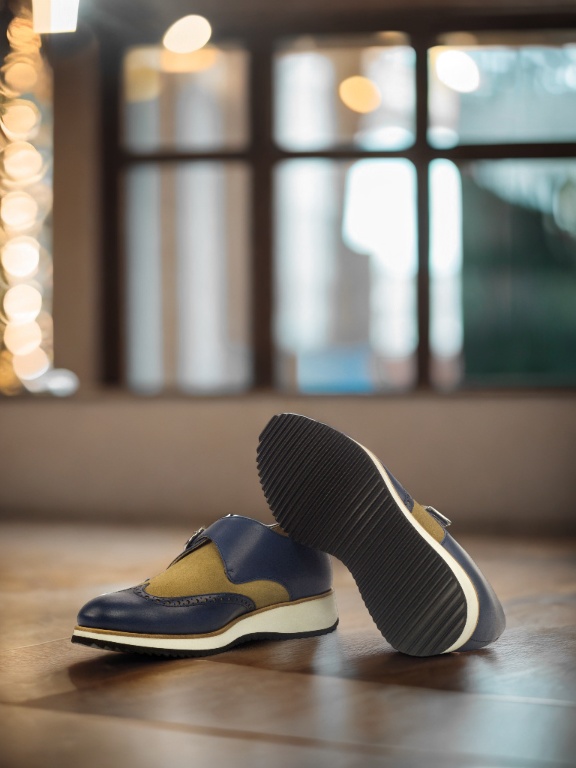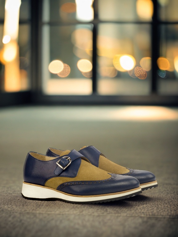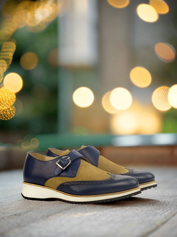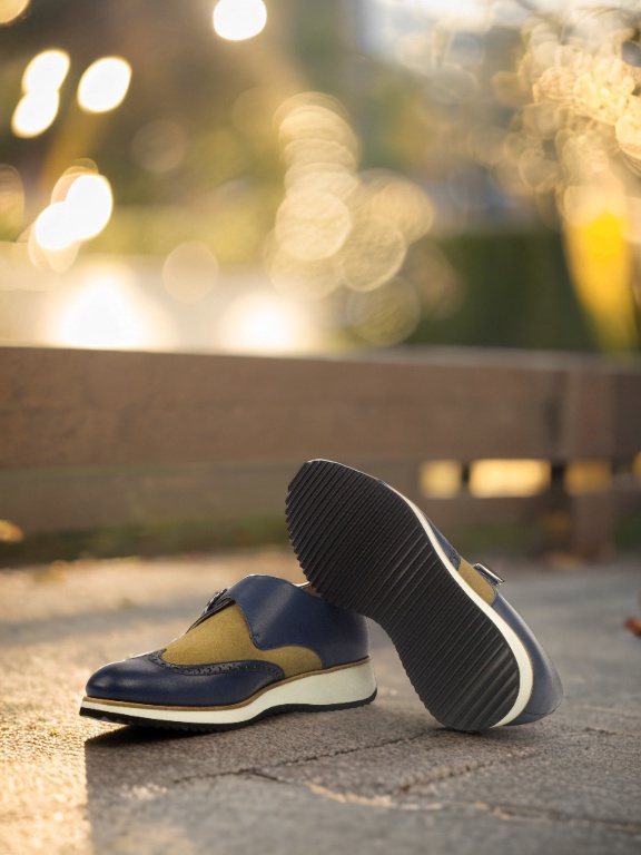 Step into the spotlight with the striking Navy Blue Painted Calf and Camel Luxe Suede uppers, adding a touch of boldness to your footwear collection. The rich color and texture instantly elevate any outfit, making you stand out in the crowd.