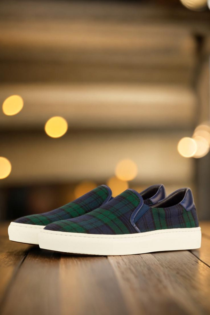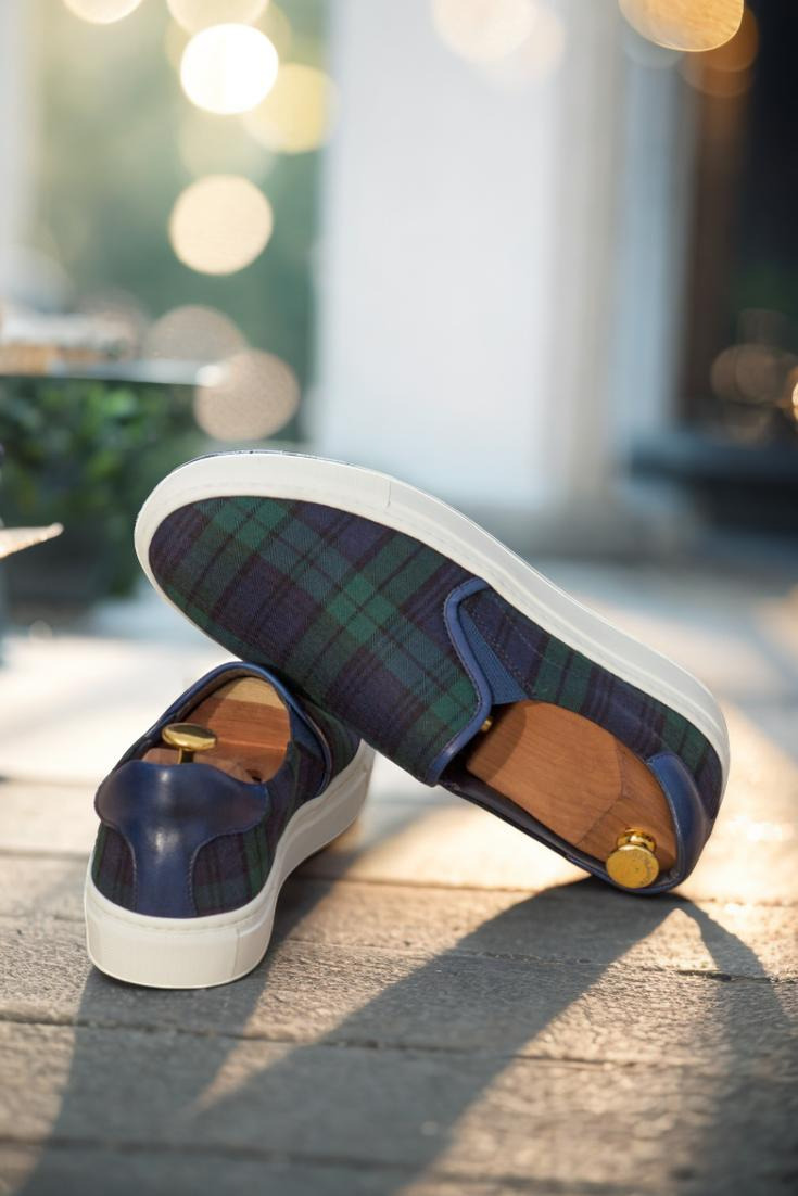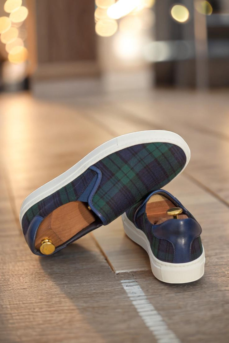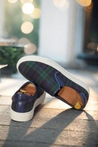 Featuring a combination of blackwatch wool and navy blue painted calf leather, these sneakers exude elegance and sophistication. The elastic in matching navy blue adds a touch of modernity and ensures a snug and comfortable fit. But it’s not just the exterior that’s impressive. The inside is lined with premium navy blue calf leather, providing maximum breathability and comfort for your feet.