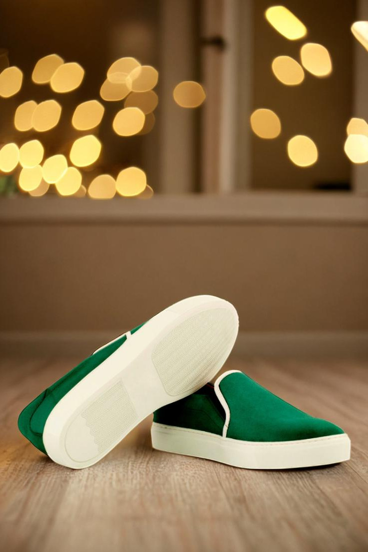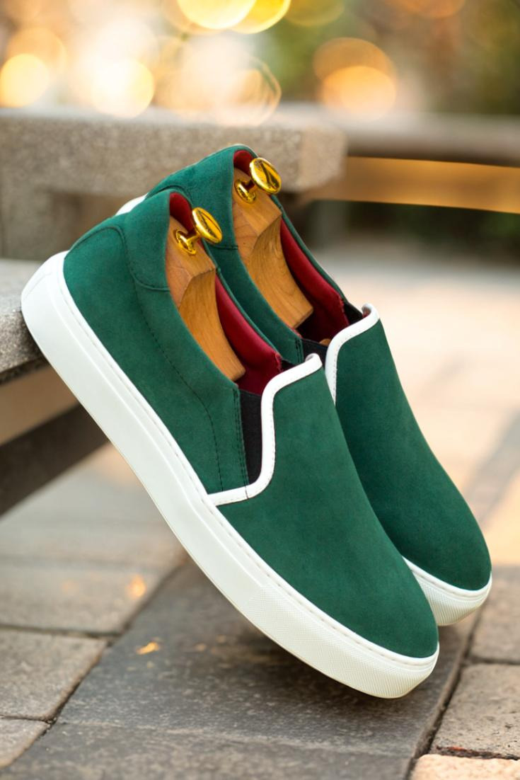 The uppers feature a stunning forest green kid suede paired with Nappa leather, creating a unique and sophisticated look. The elastic detailing in black adds a touch of sleekness, making these sneakers the perfect choice for any occasion.